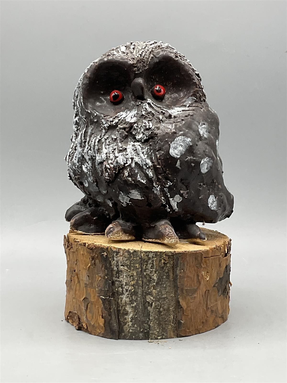 Keraaminen pöllöveistos, joka seisoo puualustalla. Pöllön silmät ovat punaiset ja sen pinta on maalattu tummanruskeaksi valkoisin korostuksin.