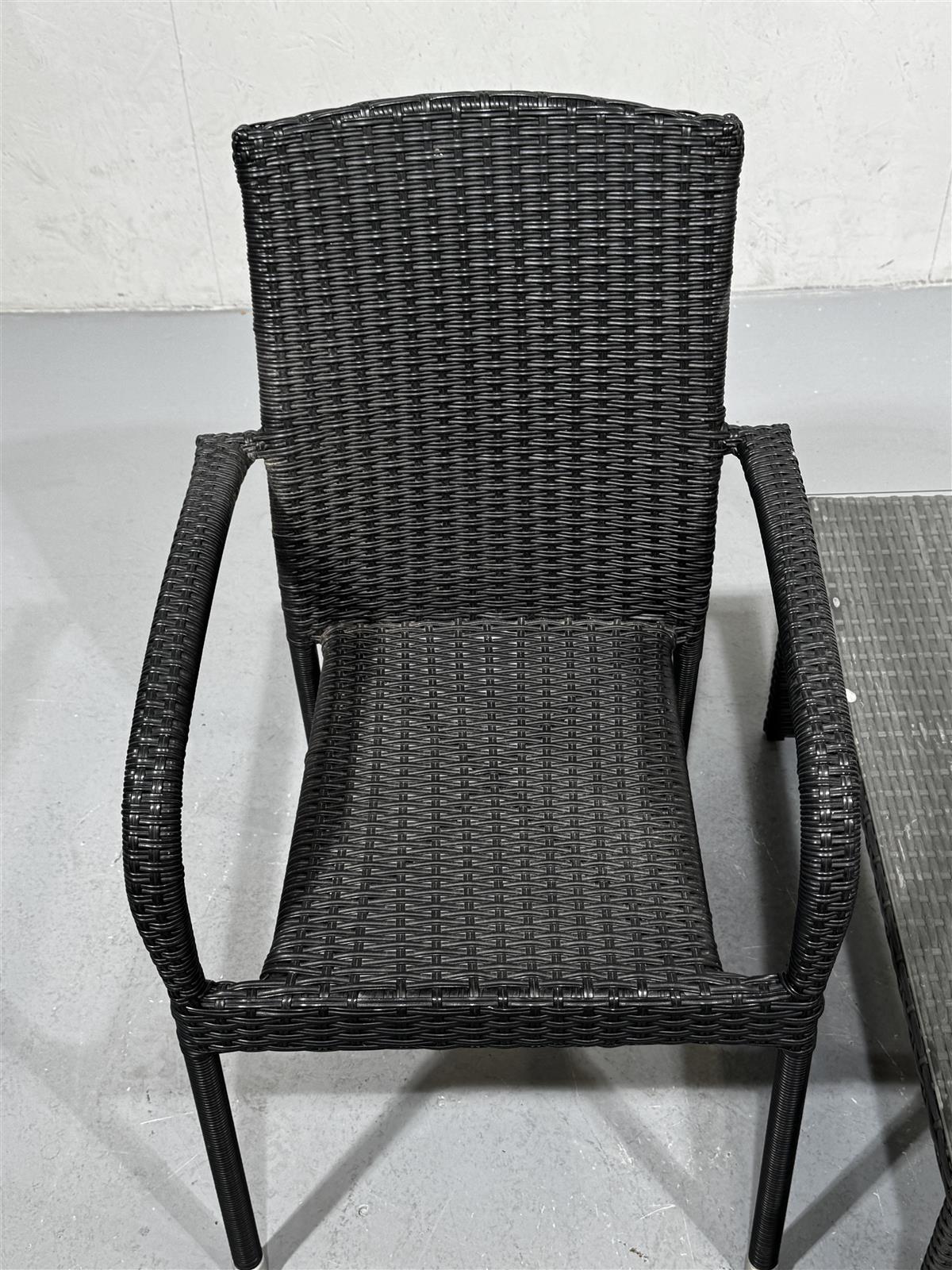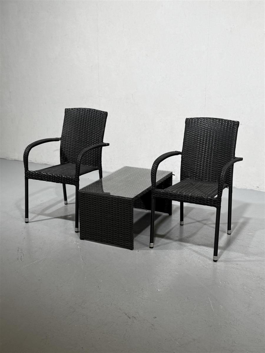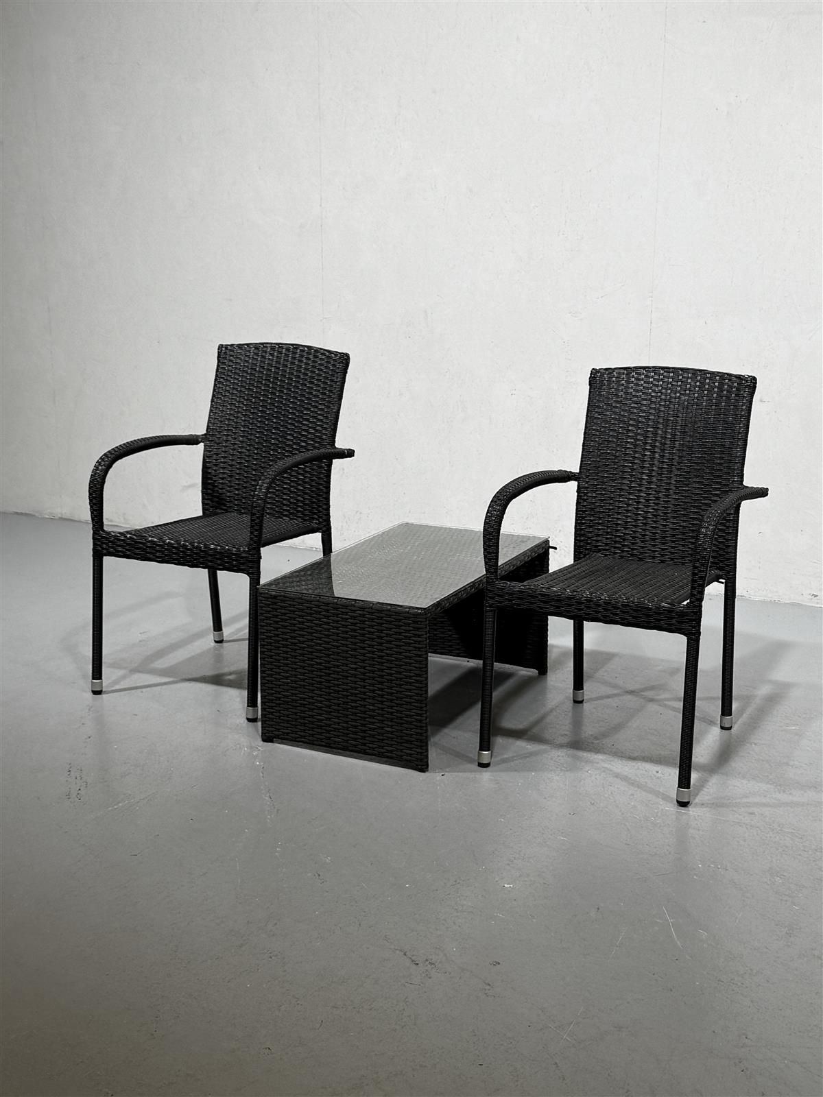 Polyrottinkinen puutarhakalustesetti, johon kuuluu kaksi tuolia ja pöytä. Tumma väri antaa modernin ilmeen, ja lasikansi lisää tyylikkyyttä. Setti on kevyt ja helppo siirtää paikasta toiseen. Sopii erinomaisesti terassille tai parvekkeelle.