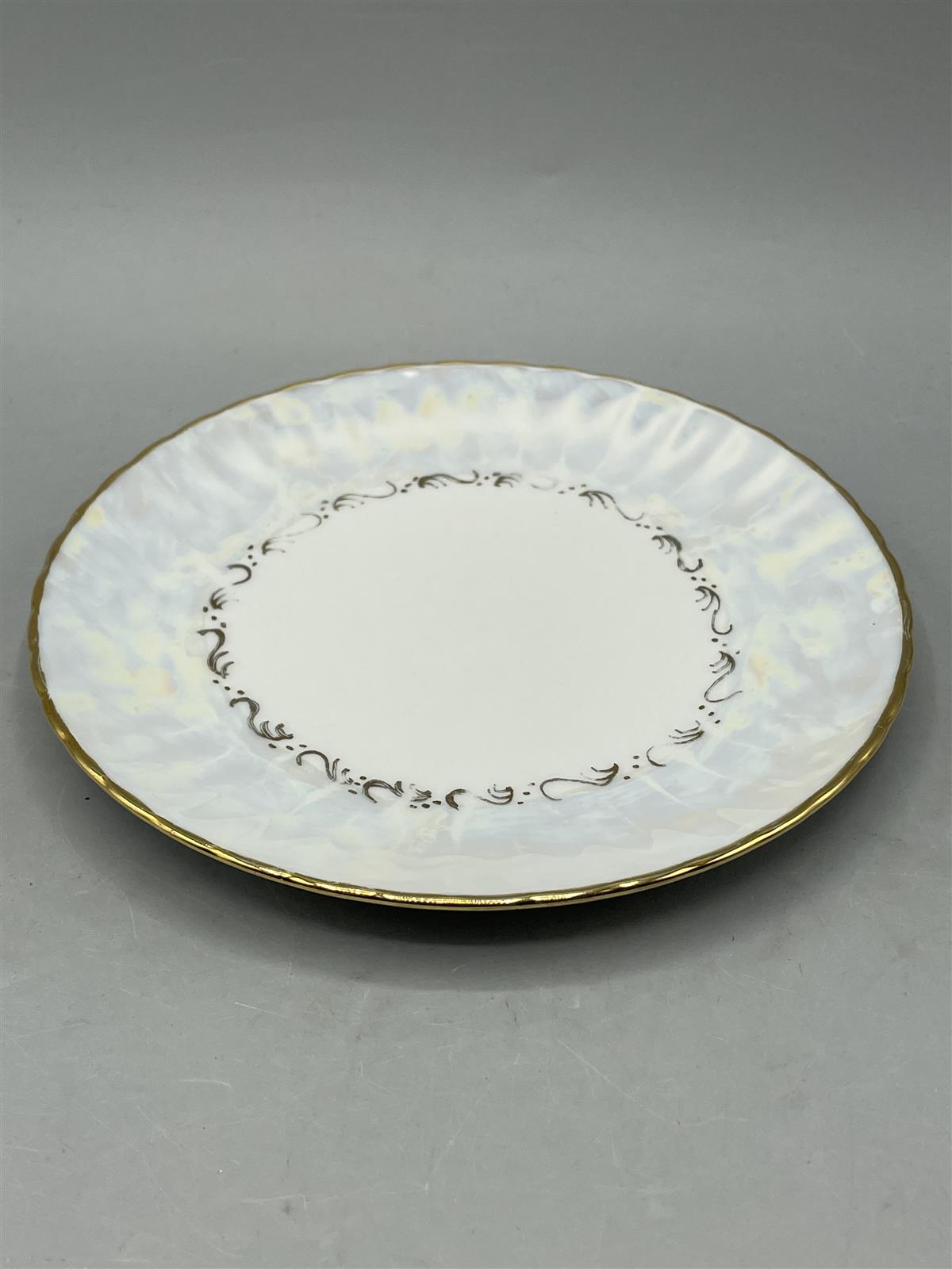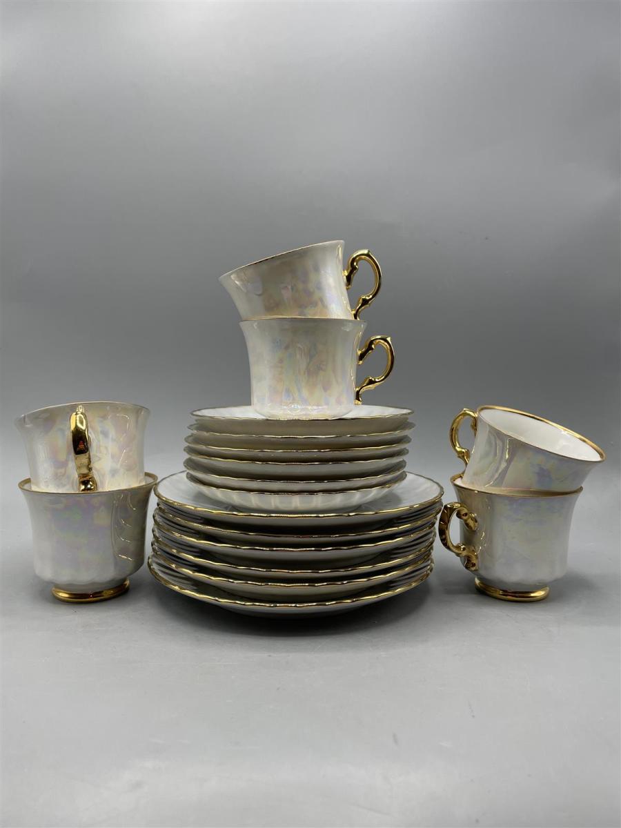 Kahvikuppisetti 12-osaa. Kuppi, tassi ja pullalautanen, kaikkia 6kpl. Kupit ja lautaset ovat koristeltu kultaisilla yksityiskohdilla ja niissä on irisoiva lasite.