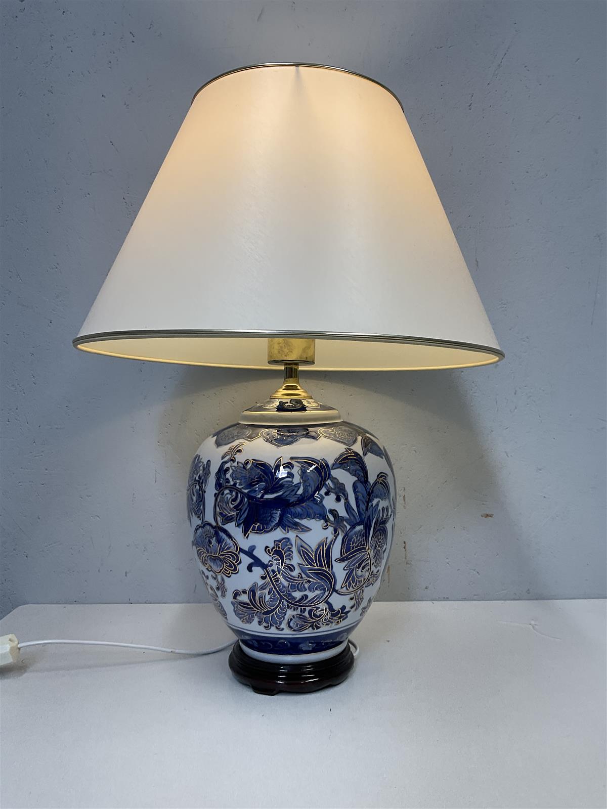 Tyylikäs pöytävalaisin, jossa on sinivalkoinen posliinijalka ja koristeellinen käsinmaalattu kukkakuviointi. Varjostin on vaalea ja kartion muotoinen, mikä antaa pehmeän valon huoneeseen. Valaisimessa on himmennin, joka mahdollistaa valon säätämisen tarpeen mukaan. Kiina.