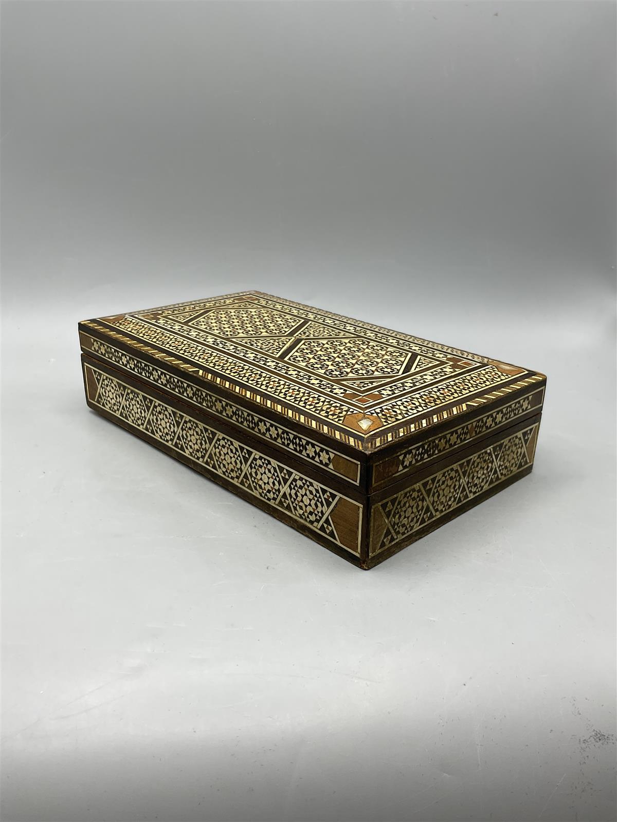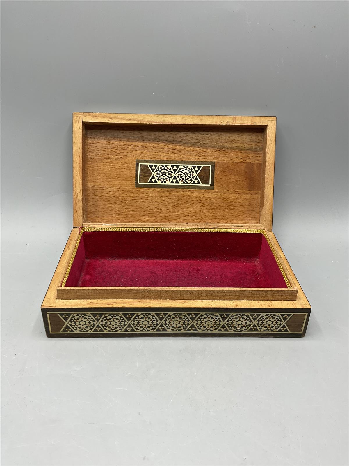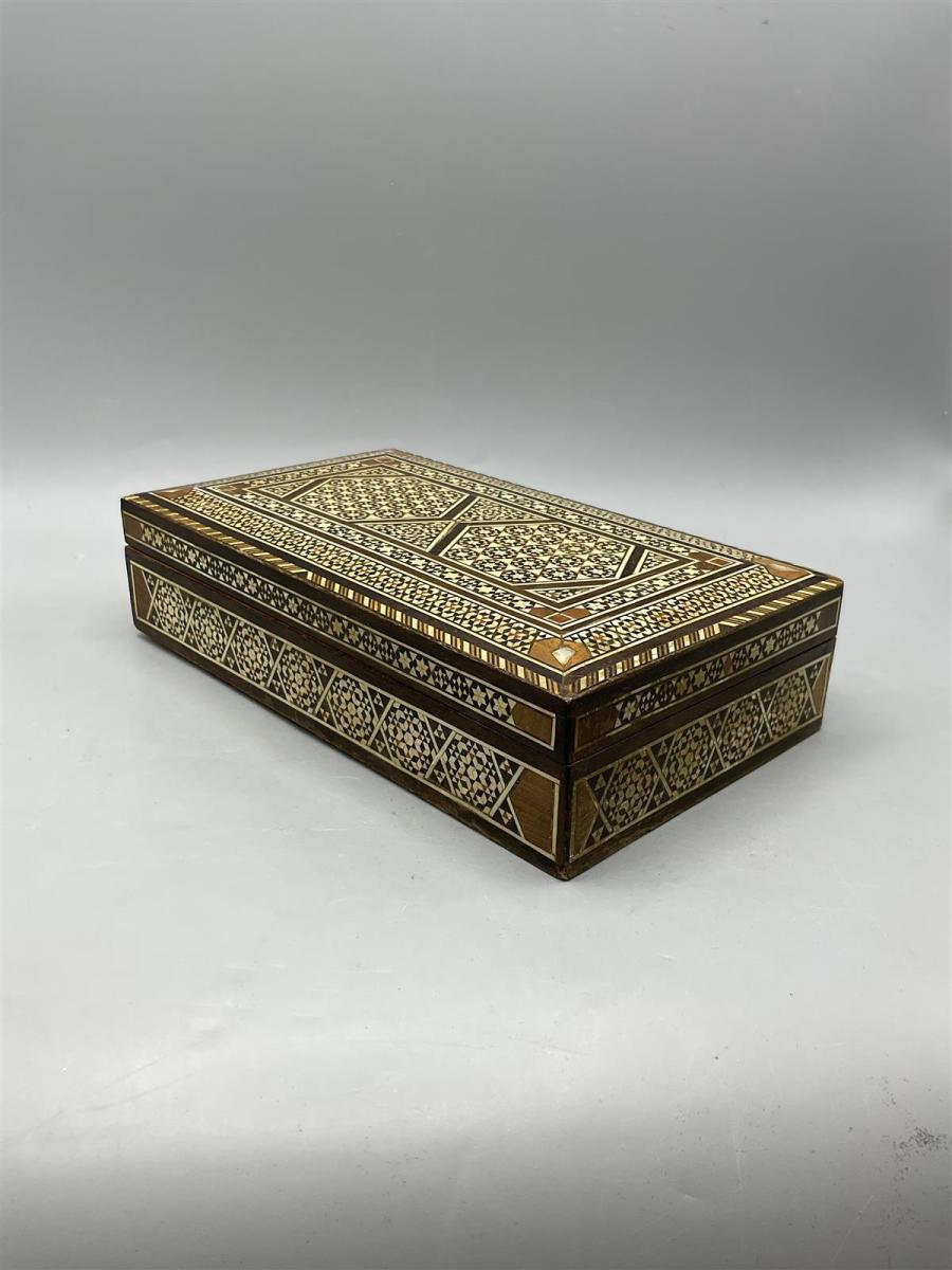 Puinen korurasia, jossa on monimutkainen geometrinen koriste kuviointi. Sisäpuoli on vuorattu punaisella kankaalla.