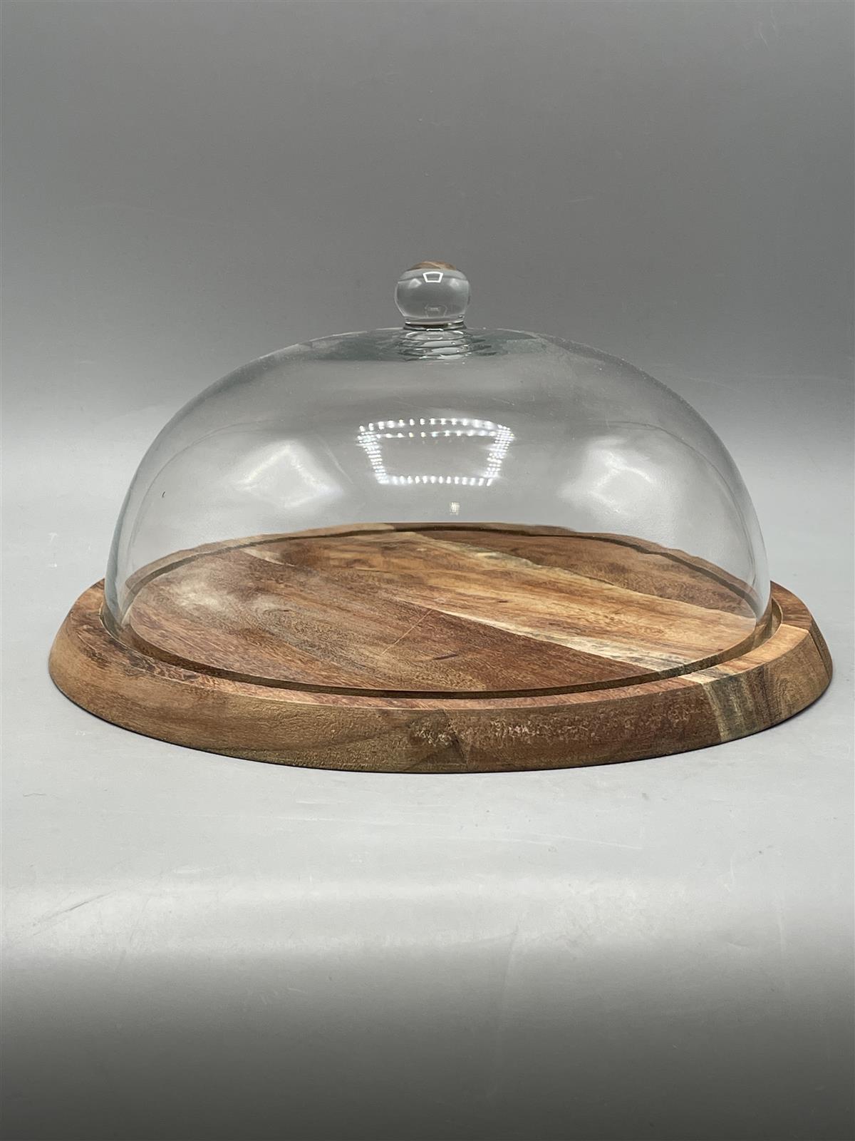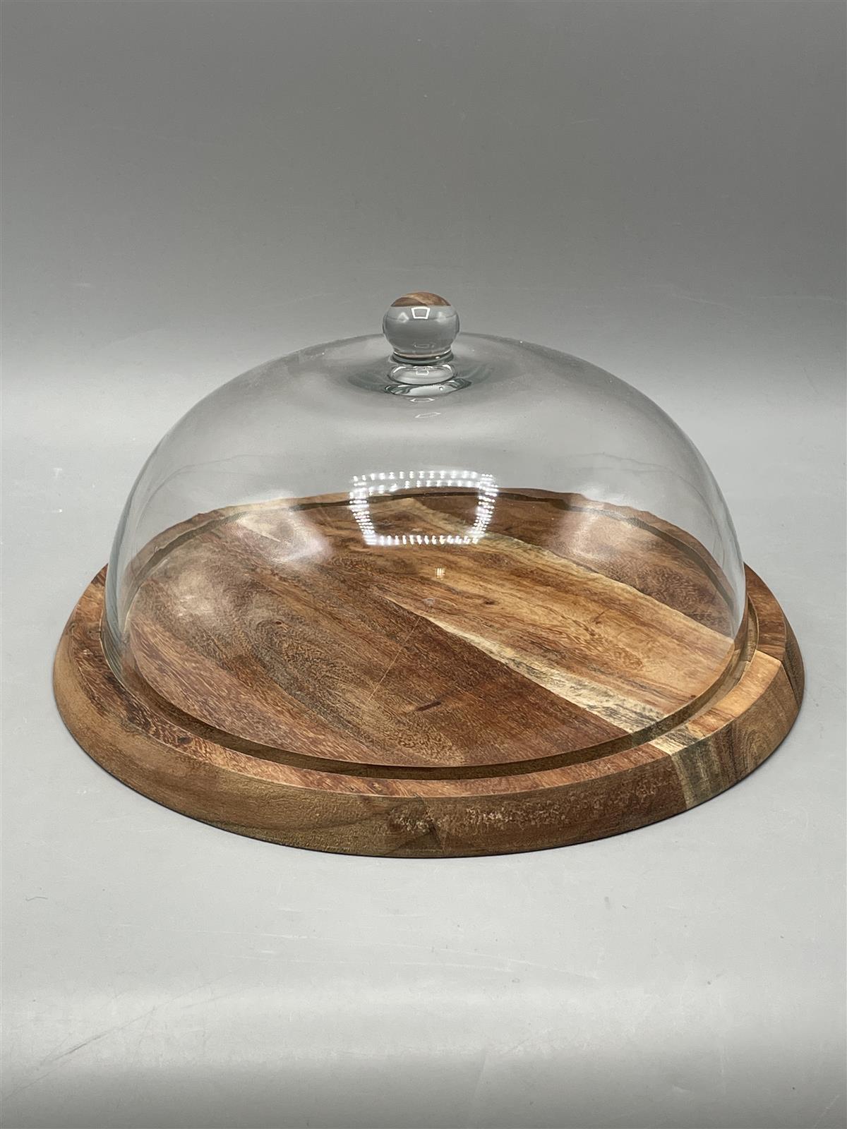 Puinen tarjoilualusta lasikuvulla.
