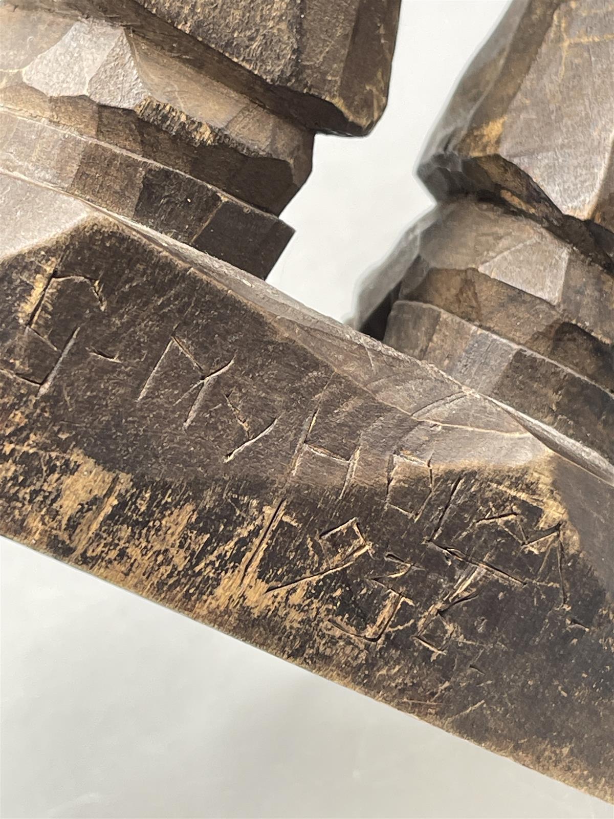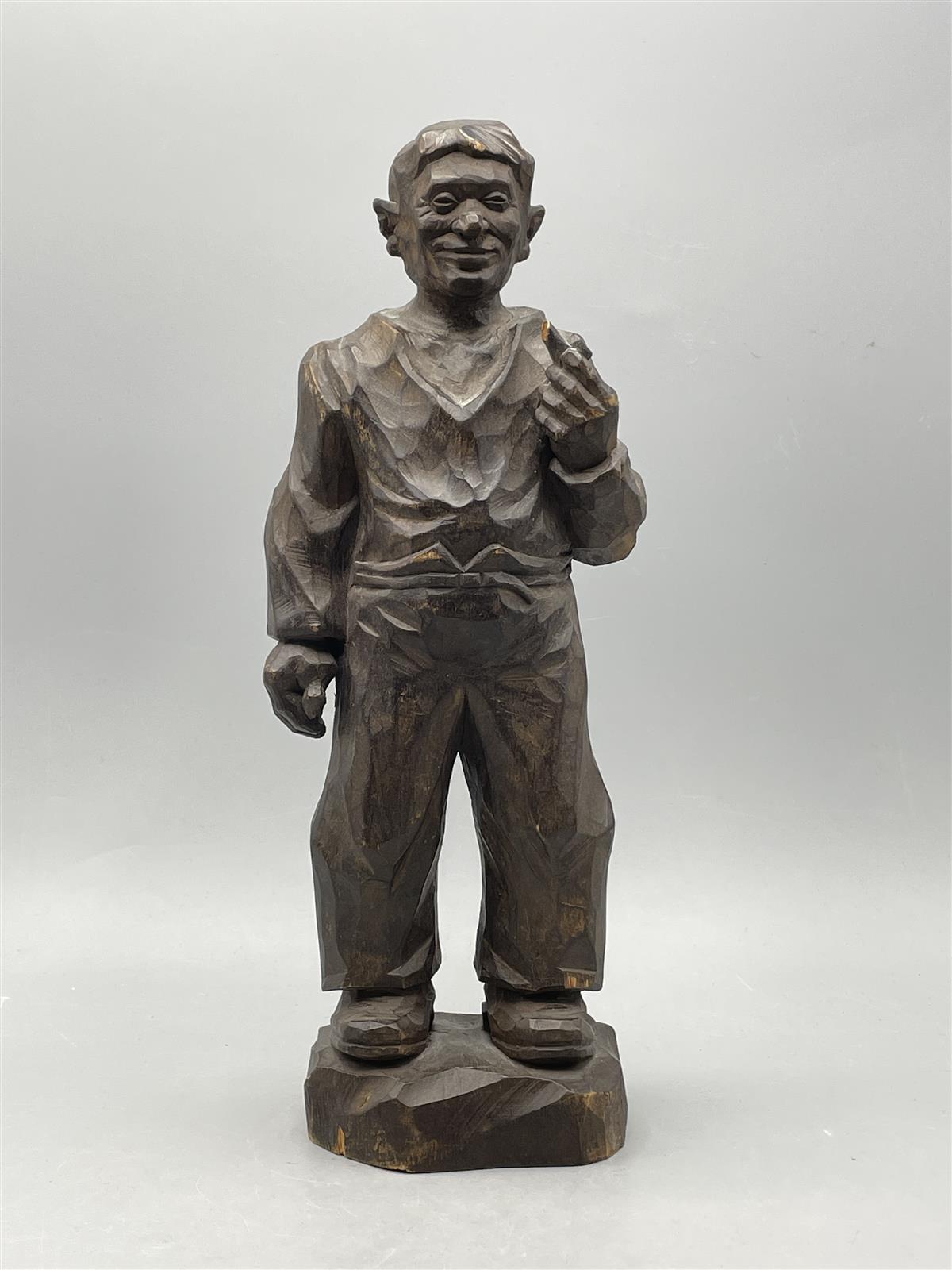 Käsin veistetty puinen hahmo, joka esittää hymyilevää miestä piippu kädessä. Veistos on tehty tummasta puusta ja siinä on yksityiskohtainen muotoilu.