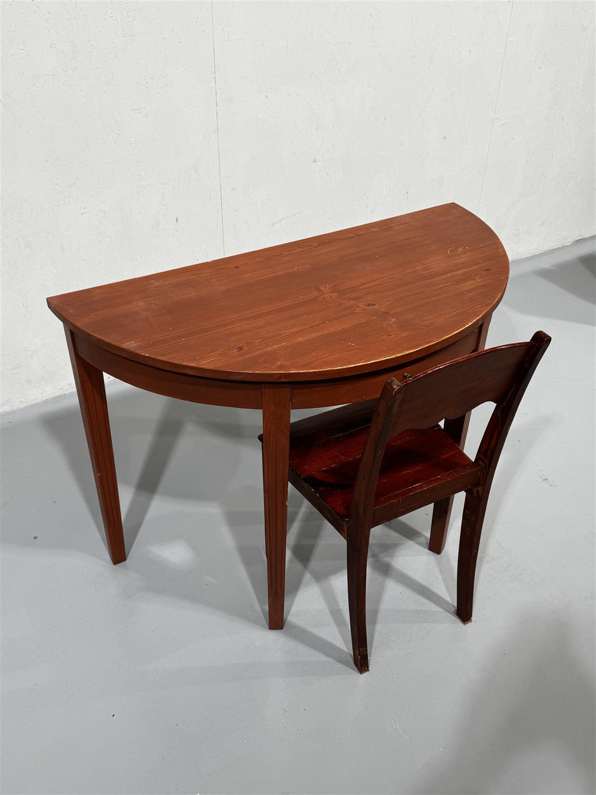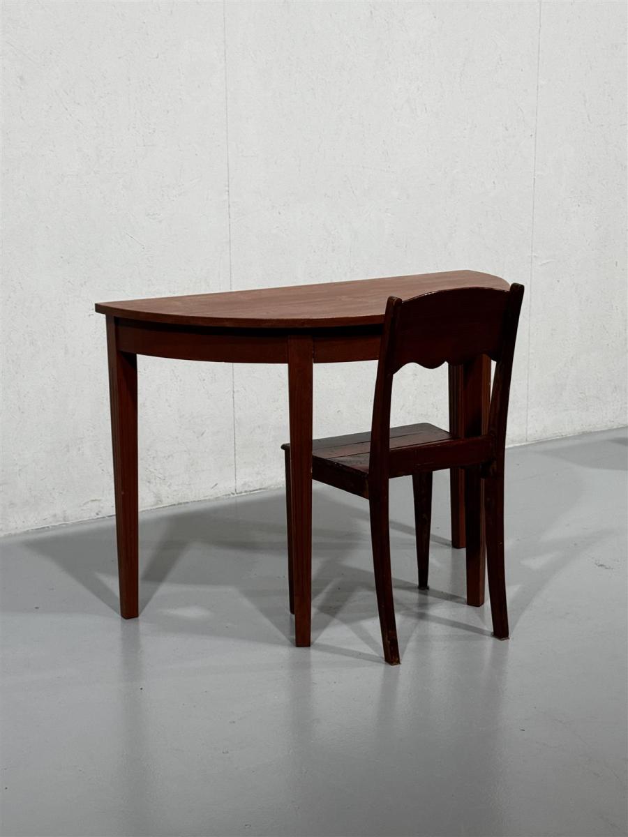 Puolipyöreä 110cm leveä pöytä sekä yksi puutuoli, joka sopii pöydän kanssa yhteen (pieni väriero).