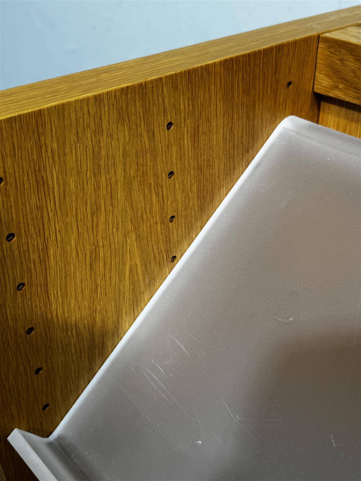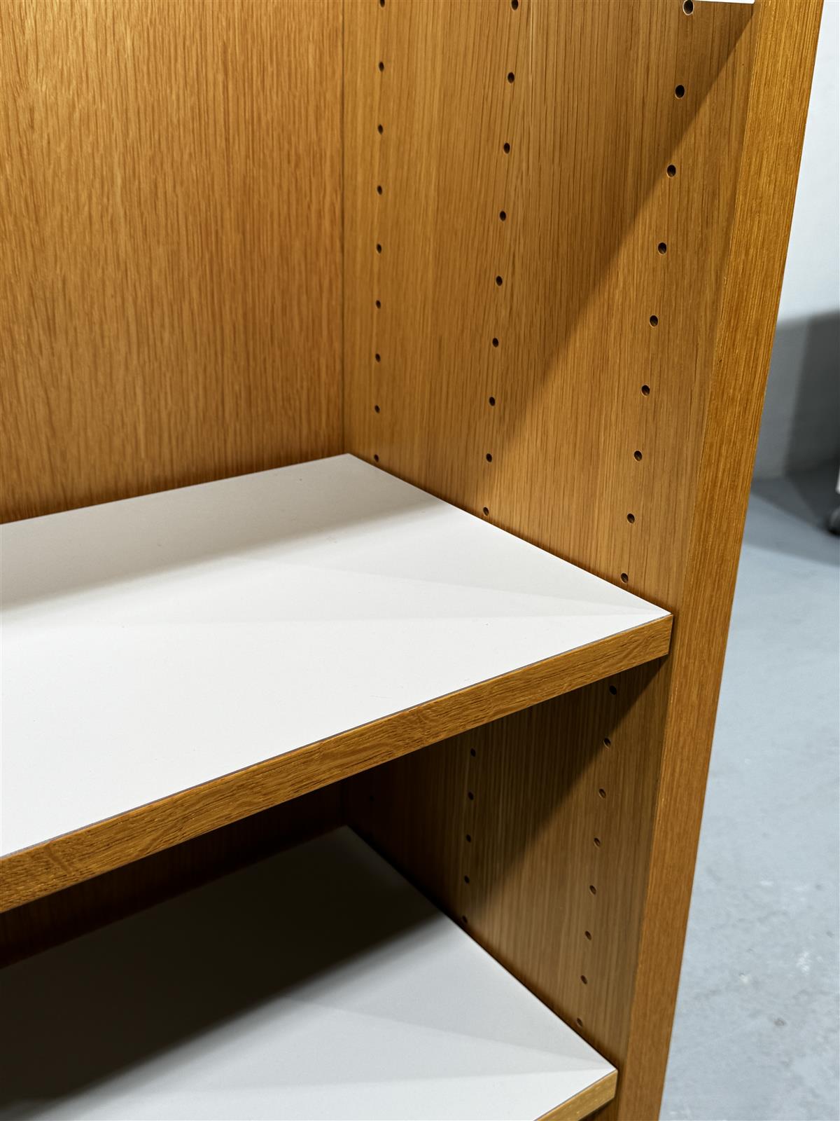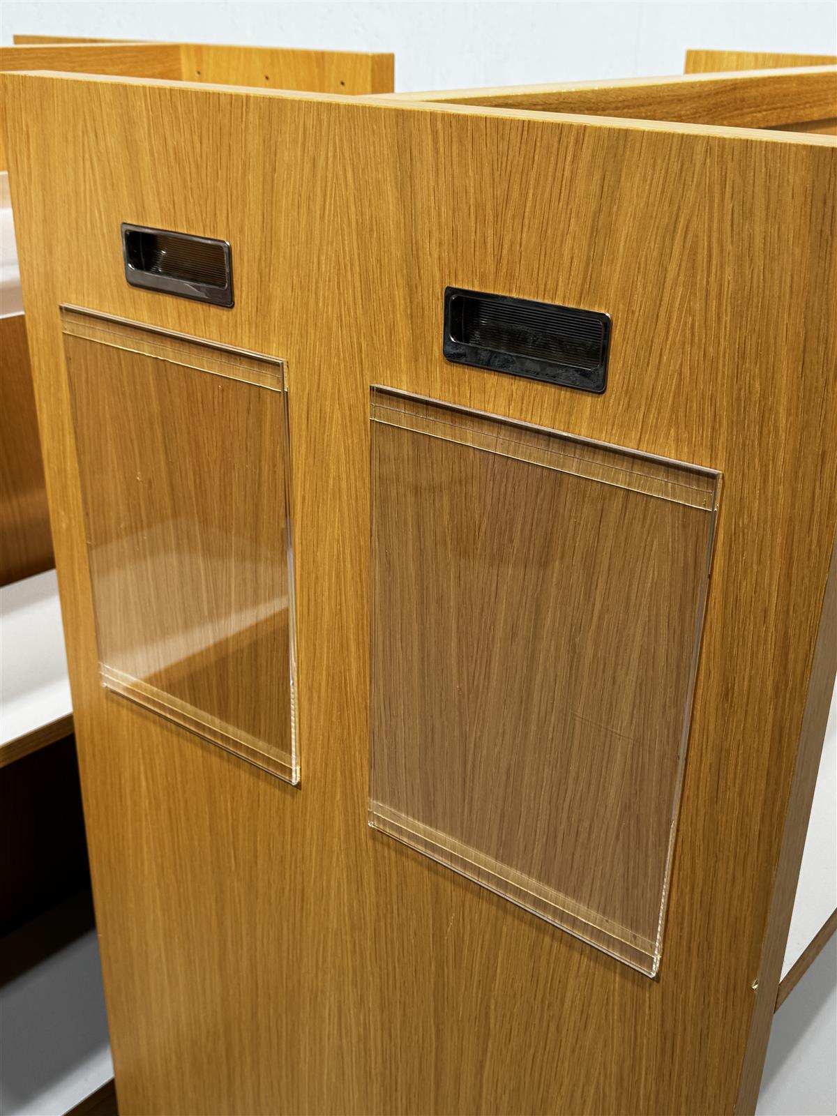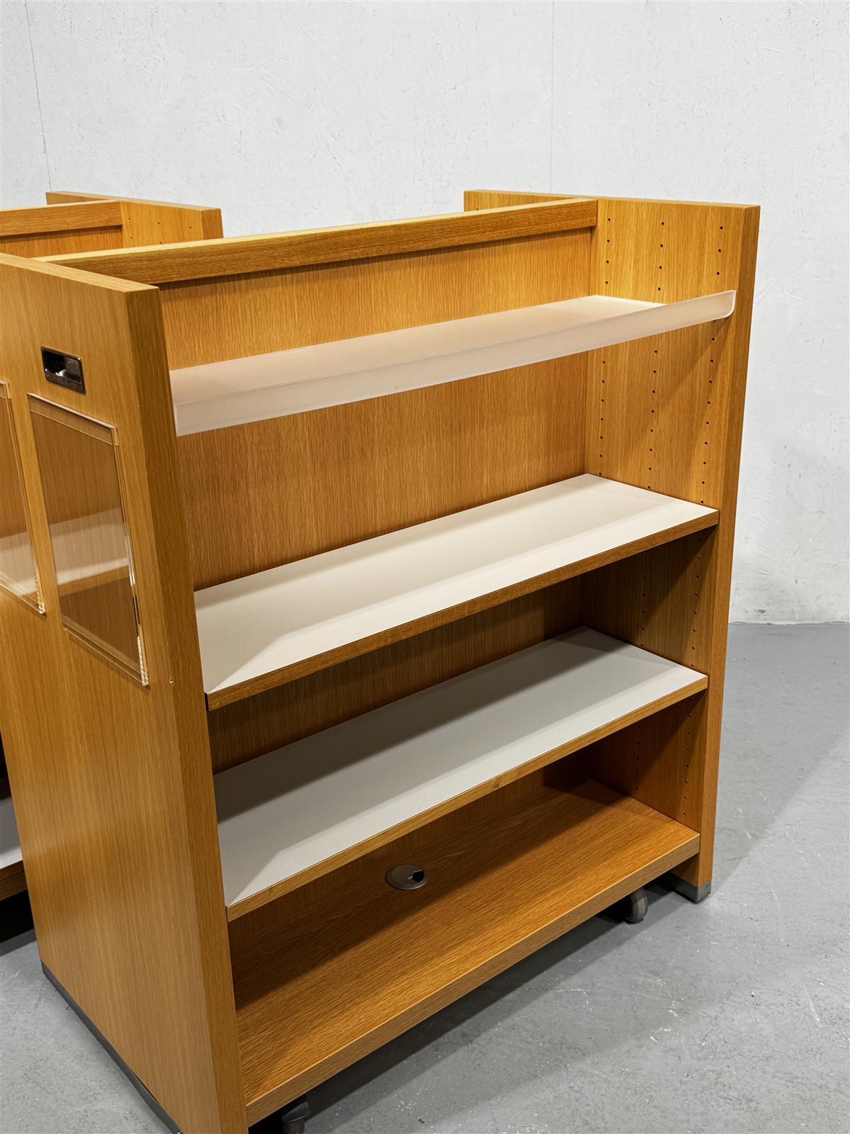 Tukeva kaksipuolinen hyllykkö, jossa on useita säädettäviä hyllyjä ja pyörät helpottamaan liikuttelua. Hyllykön ulkopinta on puunvärinen, paksu ja siinä on metalliset yksityiskohdat alareunassa sekä ottimet yläreunassa. Mukana paksuja akryylitasoja, joita voi asettaa myös viistottain sekä muutama laminoitu taso sekä kannattimia. Sopiva säilytys tai esite käyttöön.