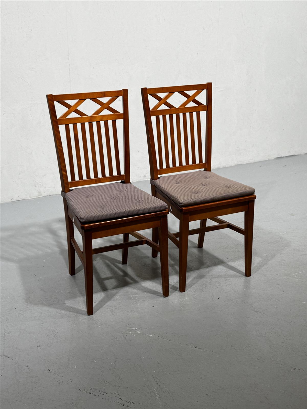Kaksi puutuolia, joissa on ruskea puinen runko ja pehmustetut istuimet. Selkänoja on koristeltu ristikkäisellä kuviolla, joka tuo esiin perinteisen muotoilun. Istuintyynyt ovat tummanharmaat ja napitetut, mikä lisää mukavuutta ja tyyliä.