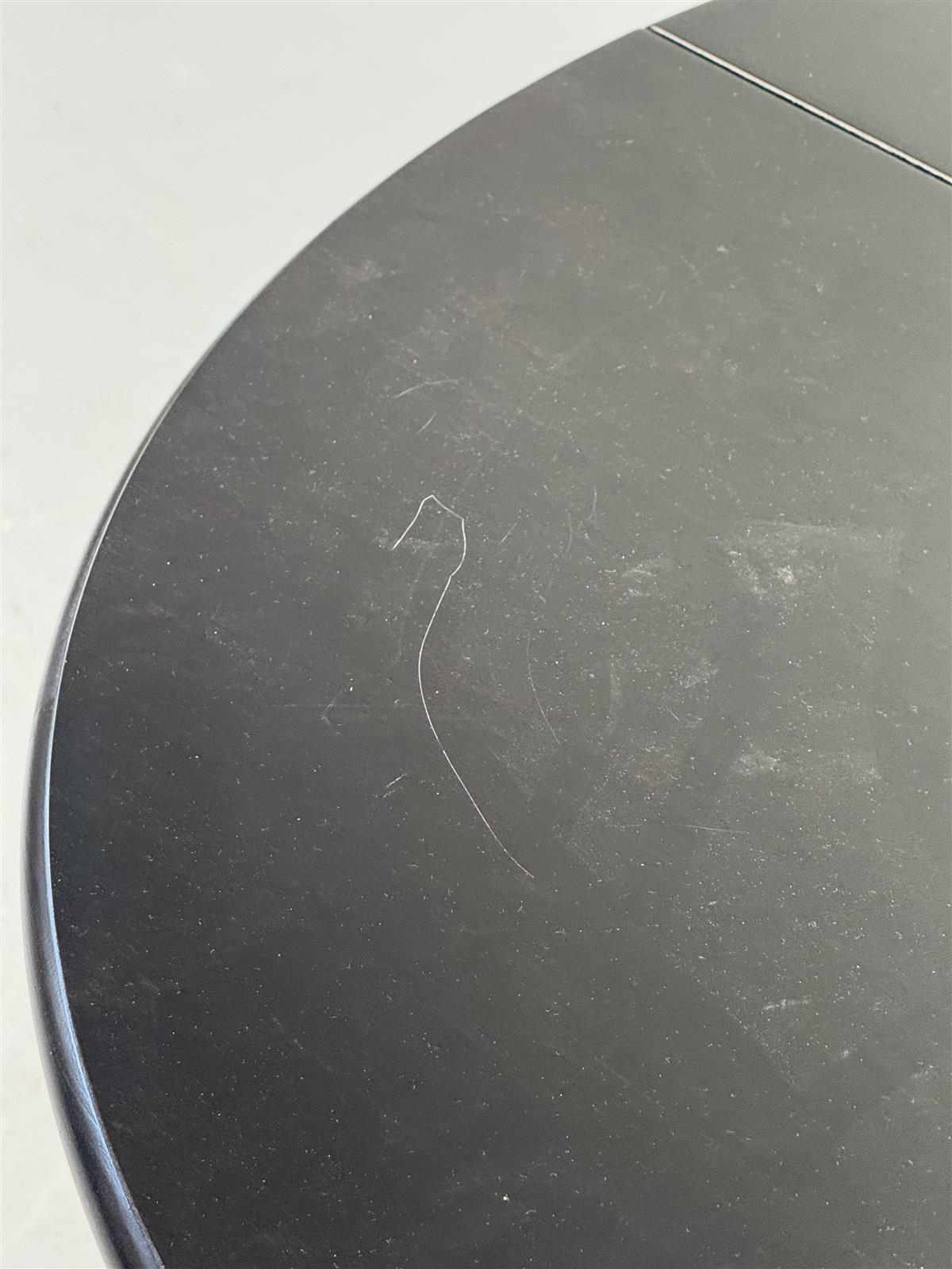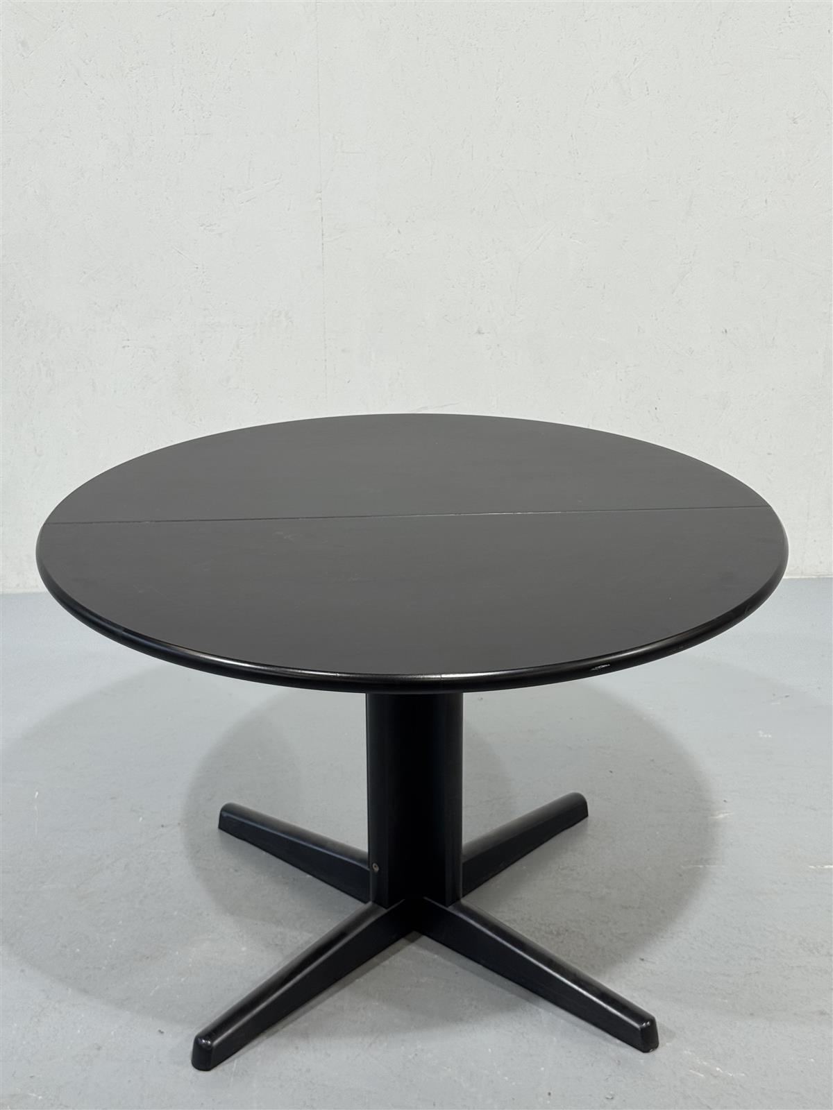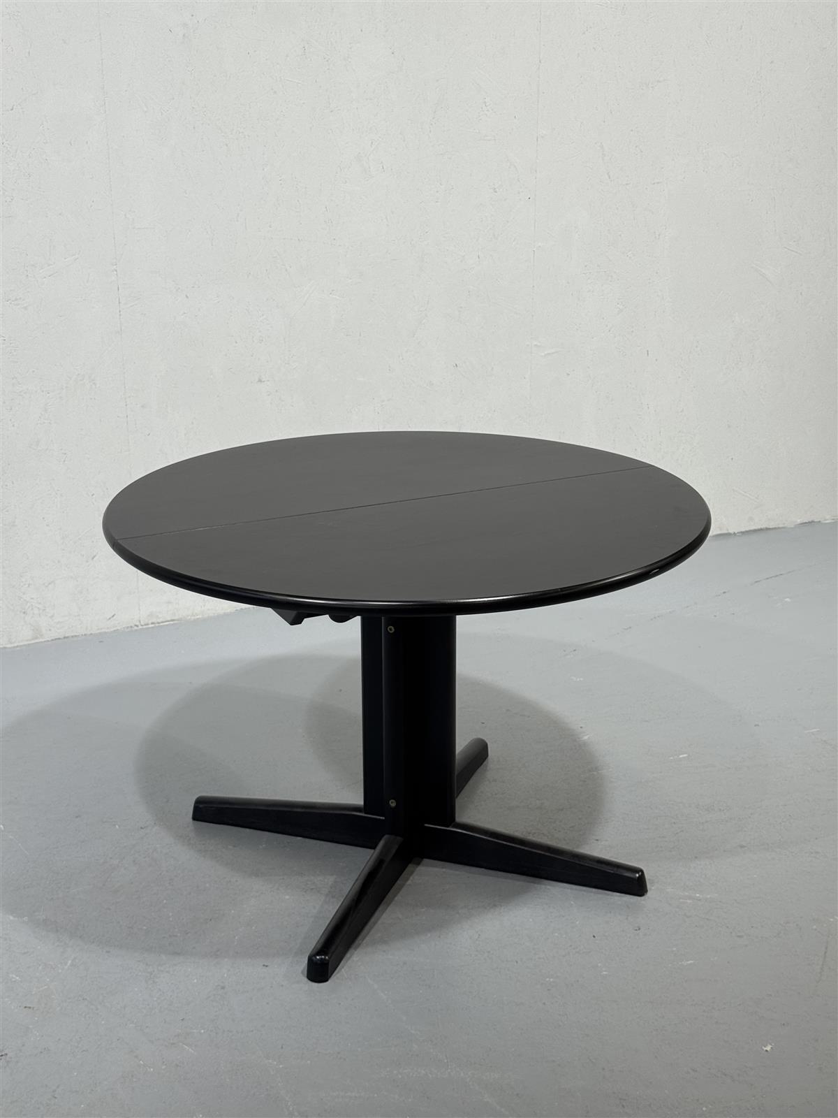 Pyöreä musta ruokapöytä, jossa on jatkettava ominaisuus. Pöydän keskellä on mekanismi, joka mahdollistaa + 54cm jatkopalan lisäämisen, mikä tekee siitä käytännöllisen valinnan erilaisiin keittiöihin.