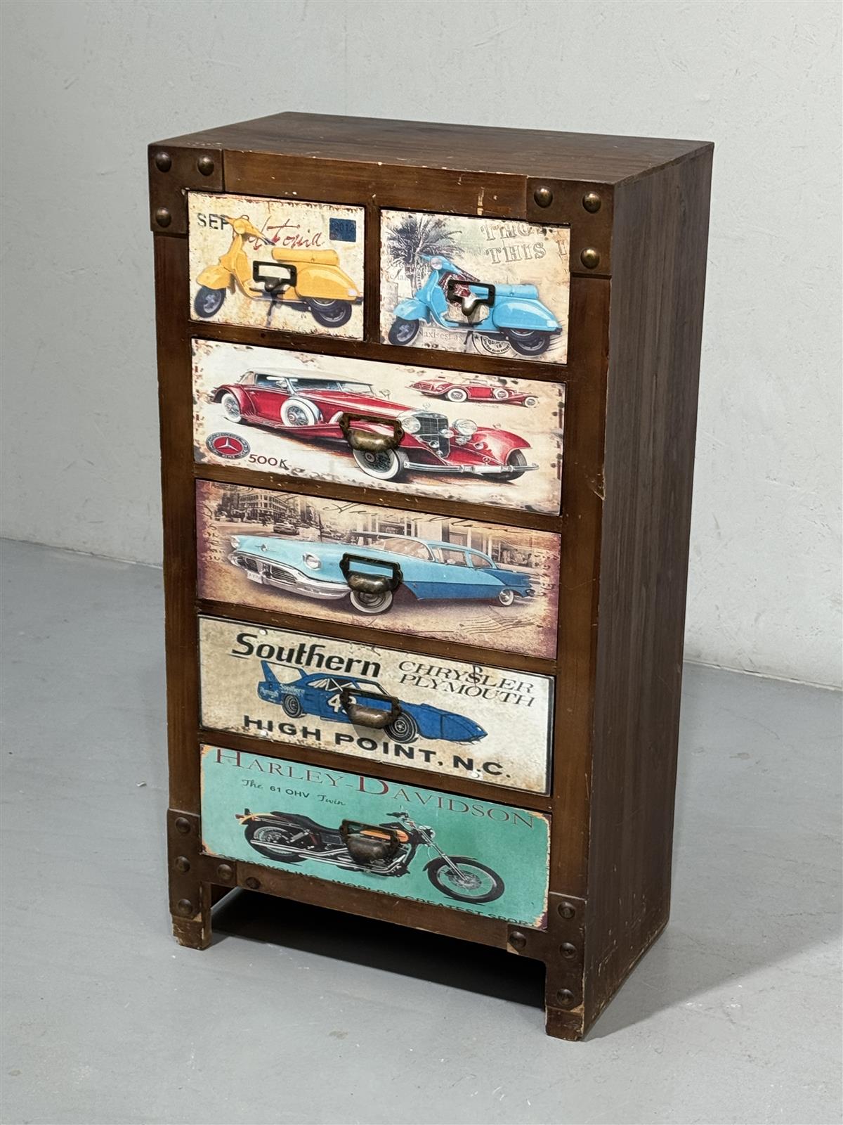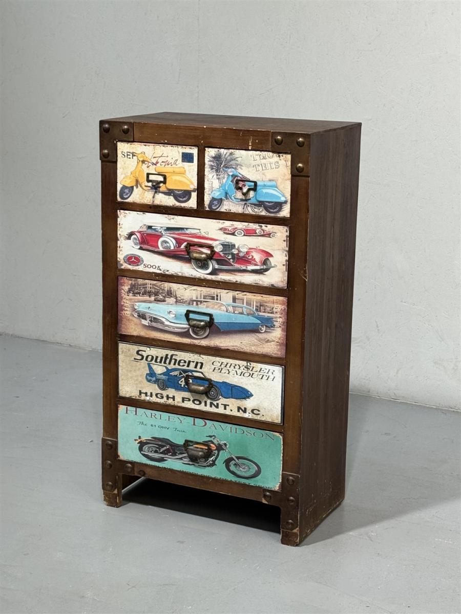Viehättävä vintage / retro henkinen lipasto, jossa on viisi laatikkoa. Jokaisessa laatikossa on erilainen auto- tai moottoripyöräaiheinen kuva, mikä tuo esineeseen persoonallista ilmettä. Lipasto on valmistettu tummasta puusta ja siinä on metalliset yksityiskohdat kulmissa, jotka korostavat sen retrohenkistä tyyliä.