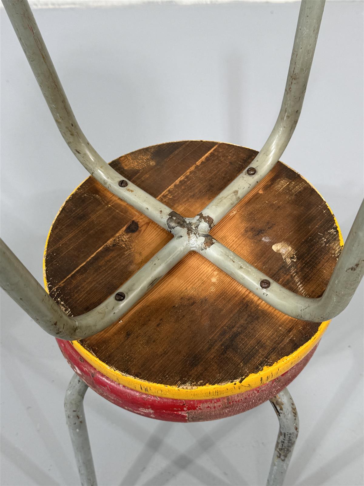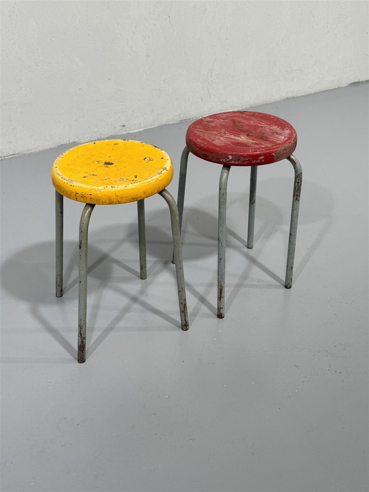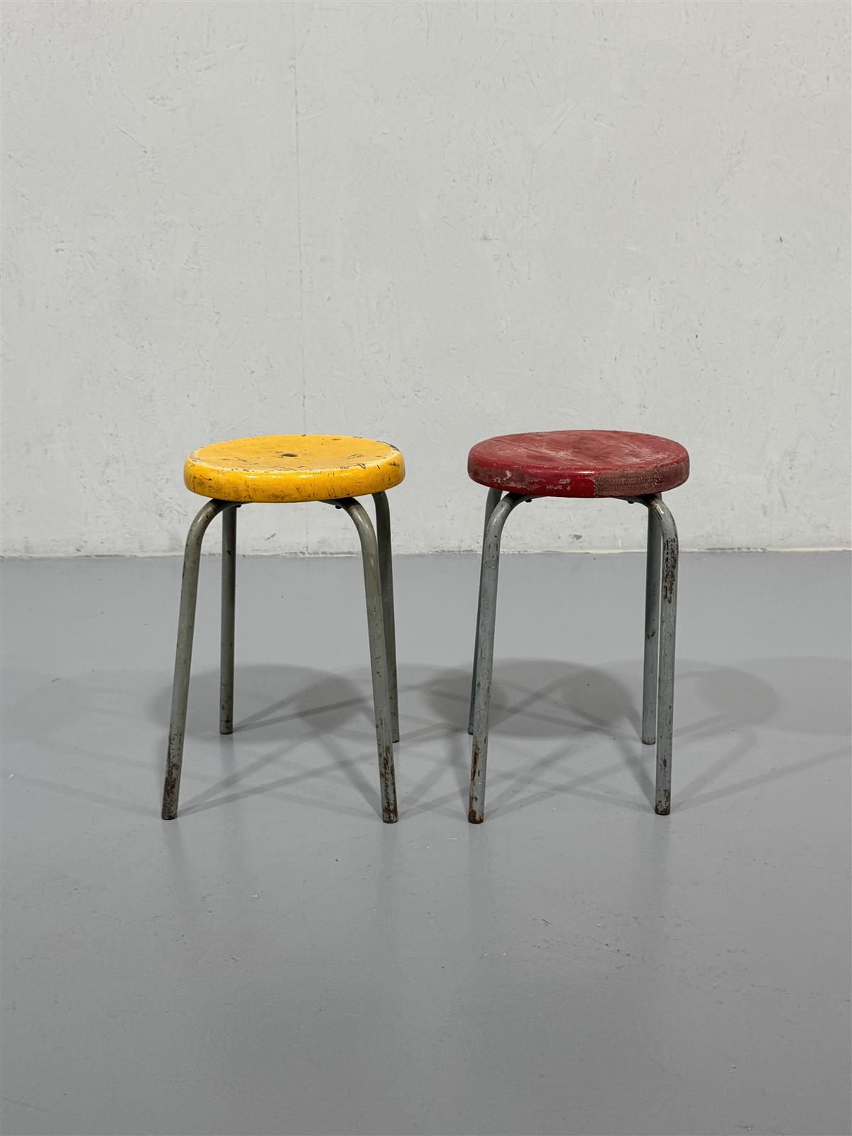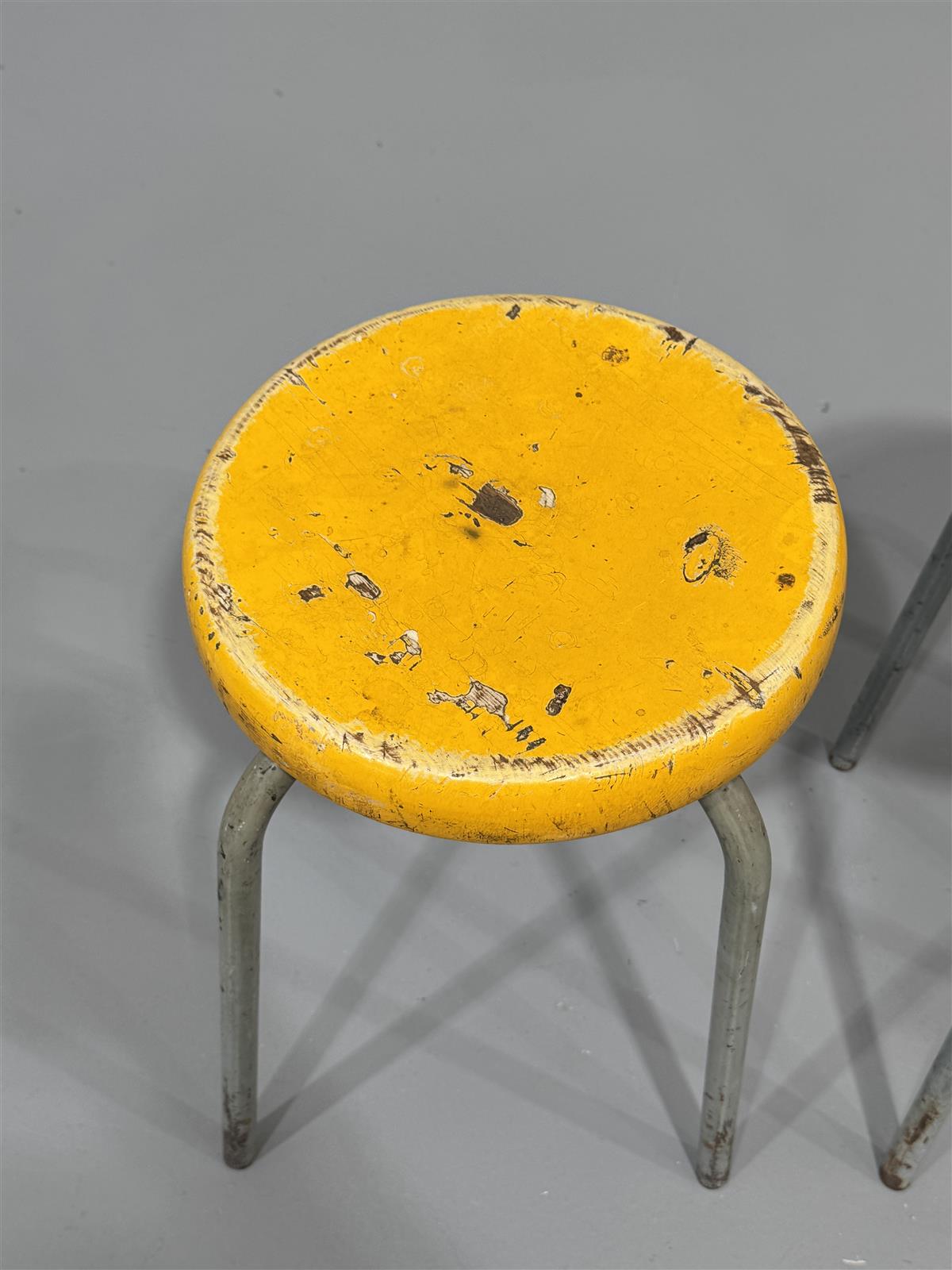 Kunto on kulunut, maalipinnassa on naarmuja ja kulumia. Metallijaloissa on ruostetta ja istuimissa on selkeitä käytön jälkiä. Näissä jakkaroissa on selvästi elettyä elämää.
