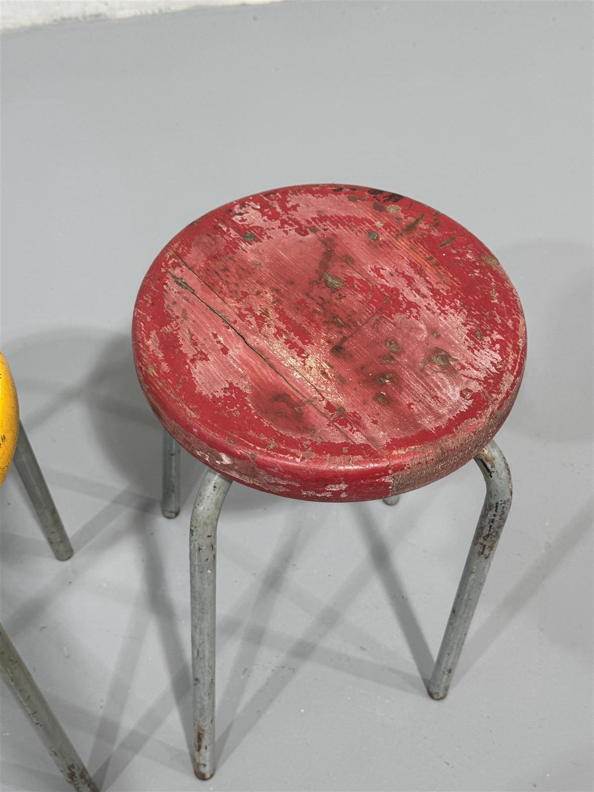Värikkäät retro jakkarat, joissa on keltainen ja punainen puuistuin metallijaloilla. Metalliset jalat tukevat puista istuinta, joka on maalattu kirkkailla väreillä. Jakkarat ovat yksinkertaisia ja käytännöllisiä, sopien monenlaisiin tiloihin.