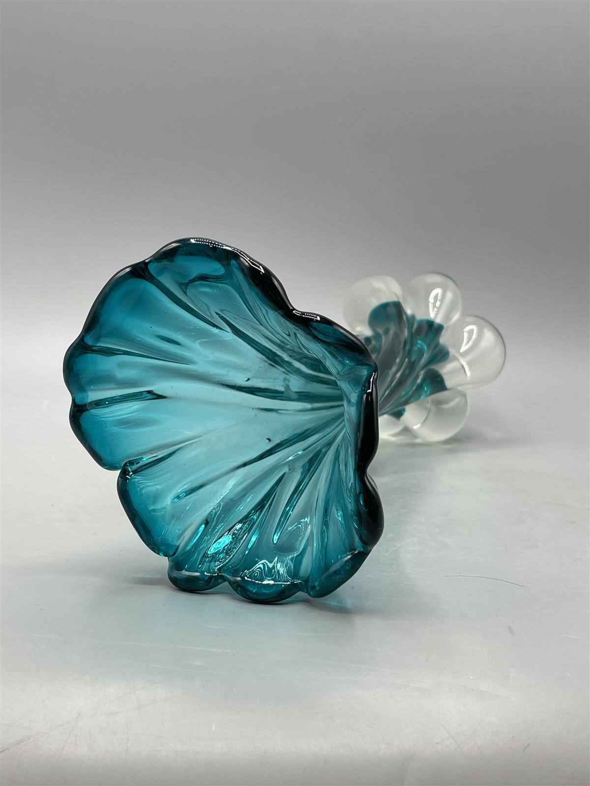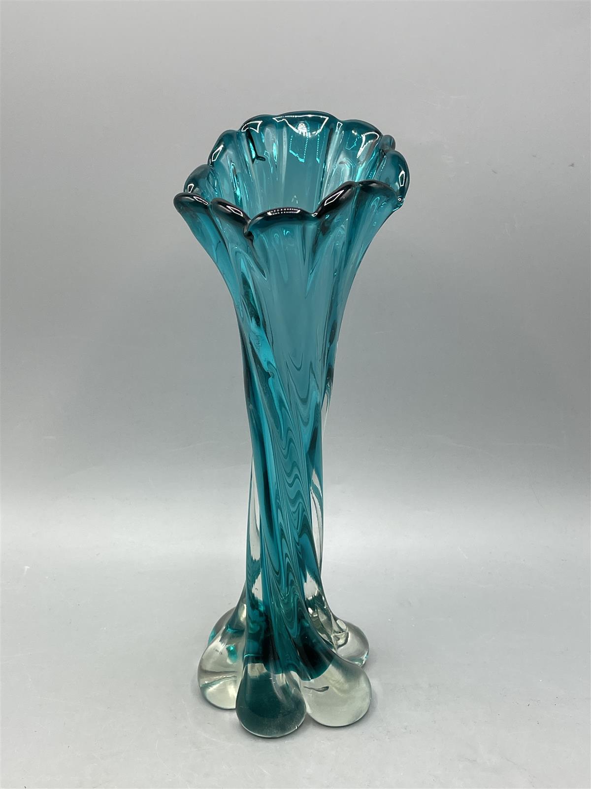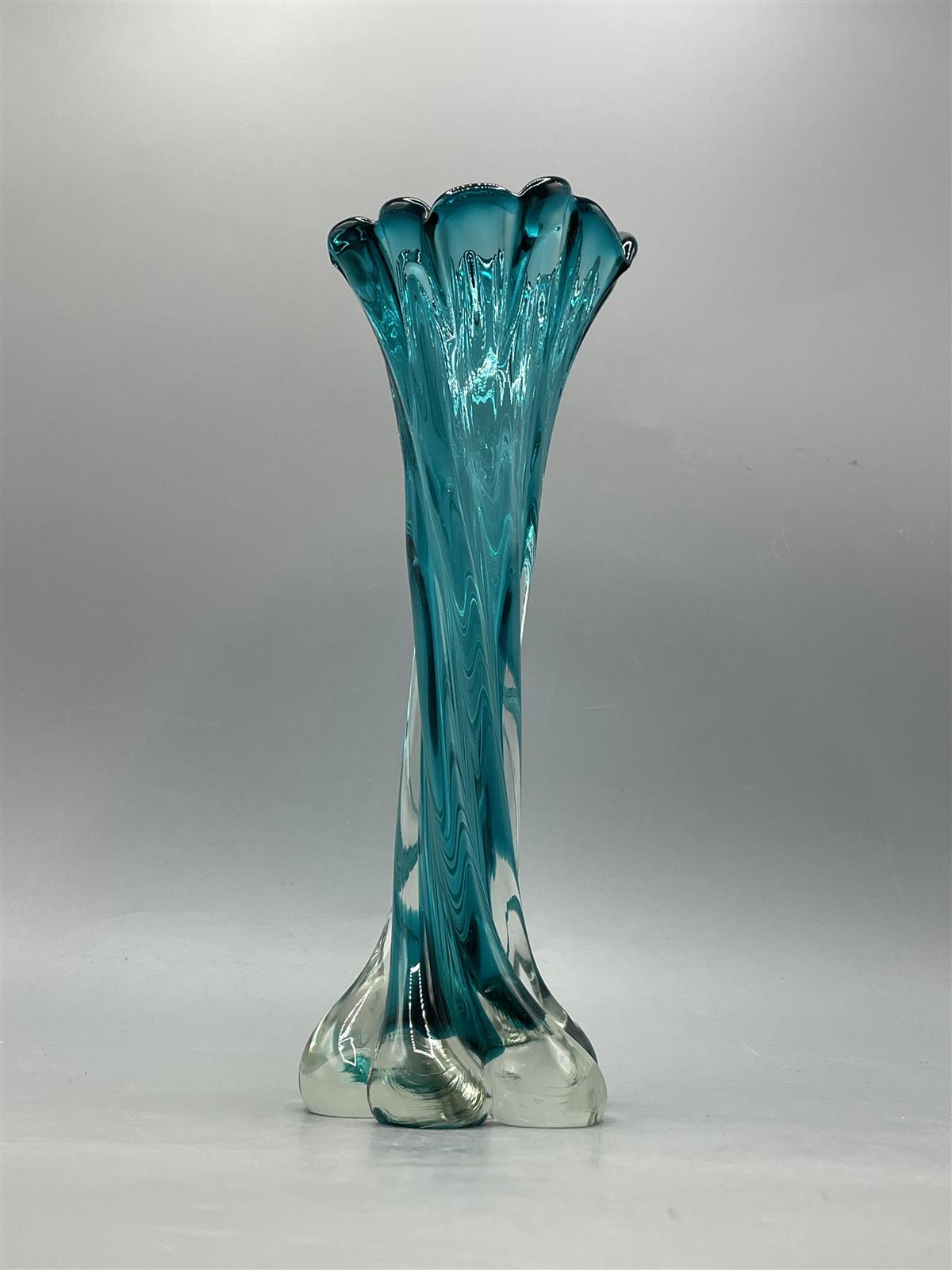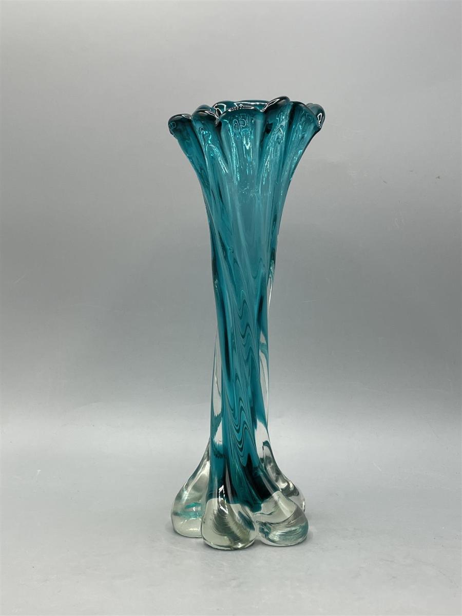 Turkoosi lasimaljakko, jossa on aaltoileva muotoilu ja kirkas pohja. Maljakko on valmistettu paksusta lasista ja siinä on koristeellinen yläosa.