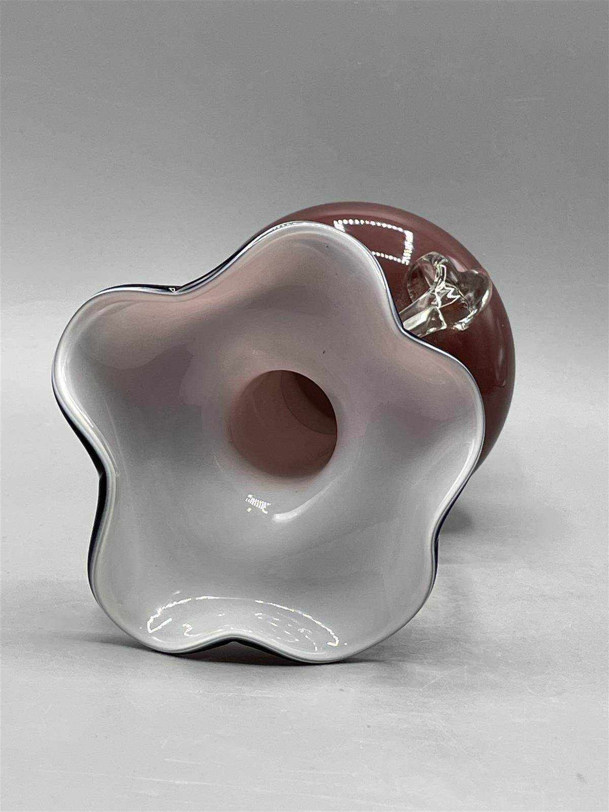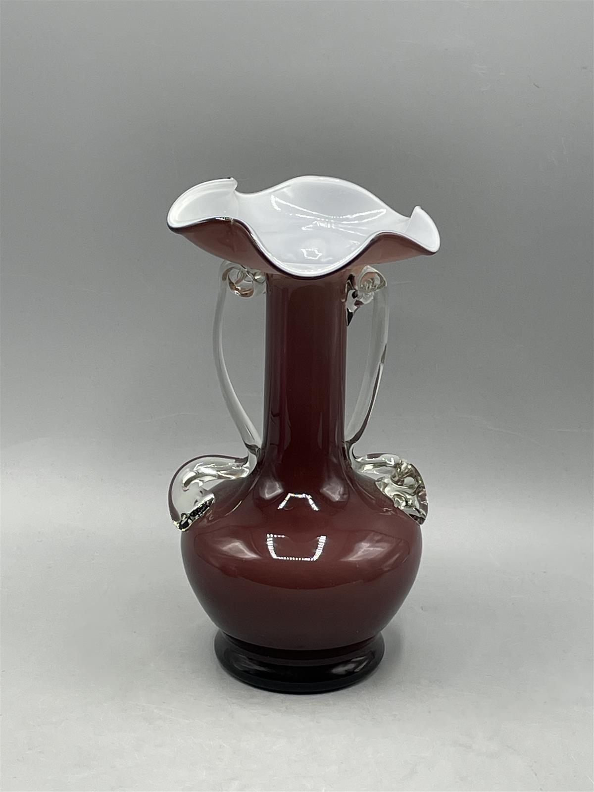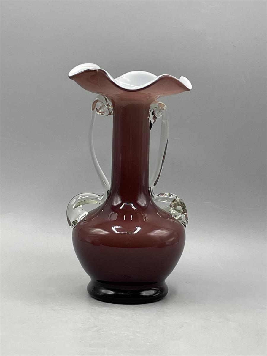 Maljakko, jossa on aaltoileva reuna ja koristeelliset kahvat. Väri on syvä punainen, ja sisäpuoli on valkoinen.