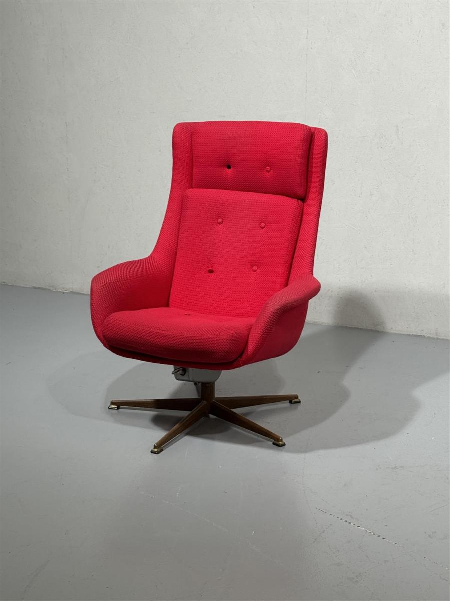 Retro punaverhoiltu nojatuoli, jossa on kirkkaanpunainen kangasverhoilu ja pyörivä jalusta. Valmistettu Suomessa, tämä tuoli tarjoaa mukavuutta ja kestävyyttä arkeen ja rentoutumiseen. Sen pehmeä istuin ja selkänoja tekevät siitä täydellisen valinnan olohuoneeseen tai työhuoneeseen.