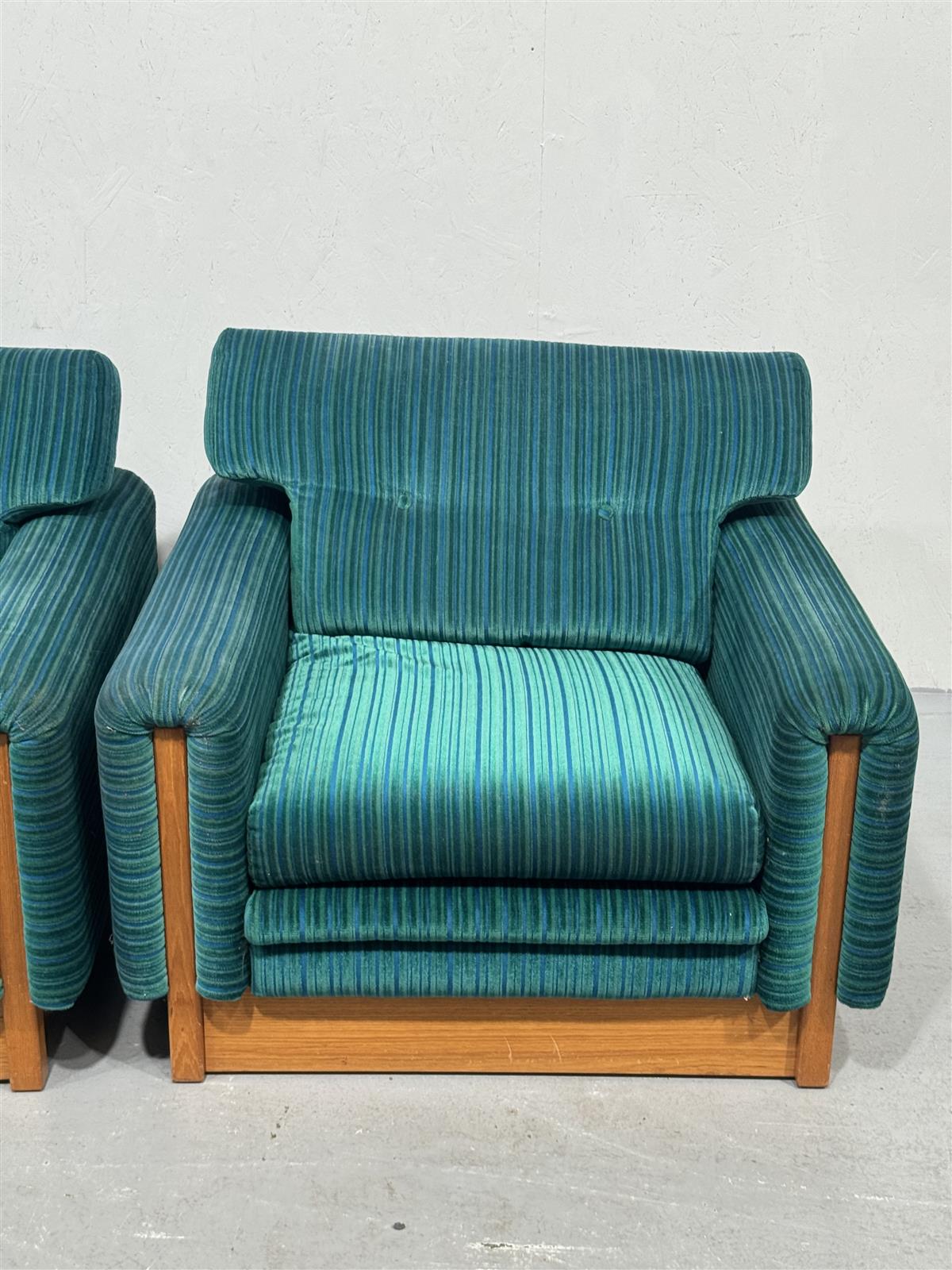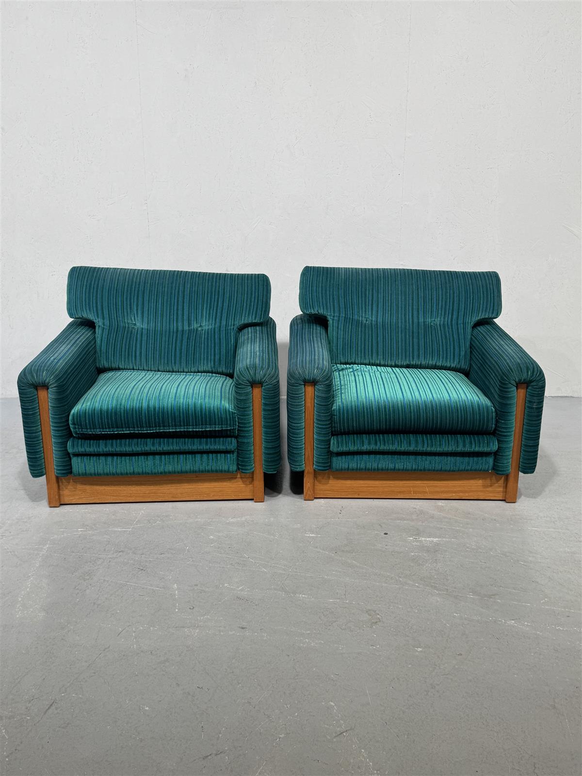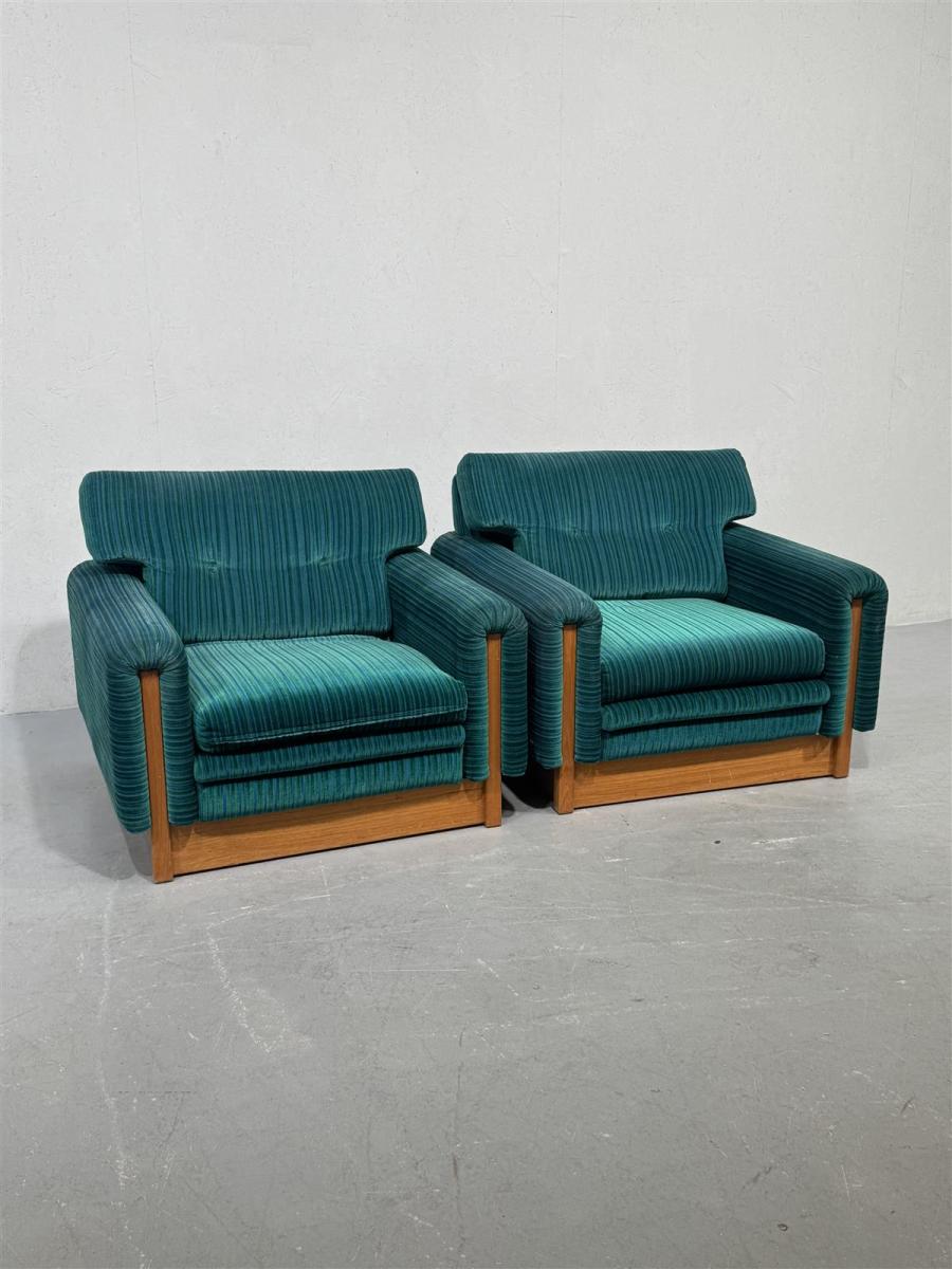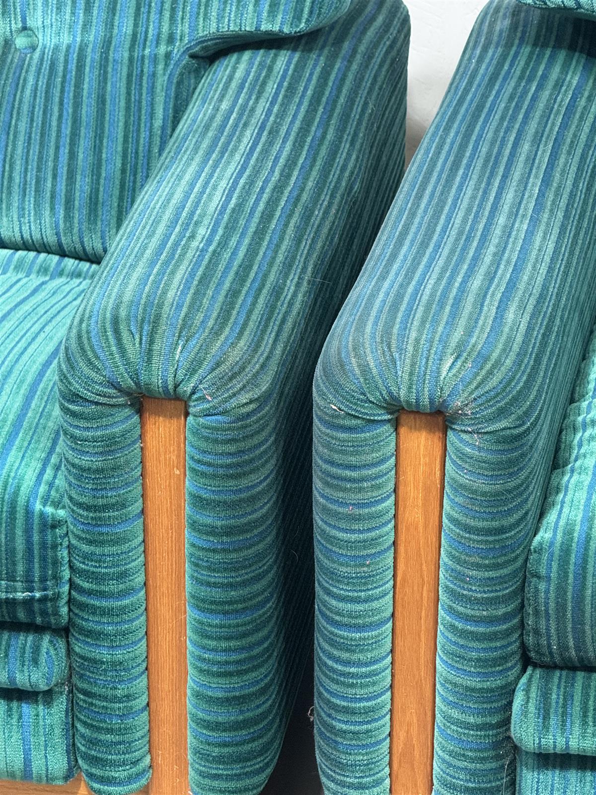 Kaksi retrotyylistä nojatuolia, joissa on vihreän ja sinisen sävyinen raidallinen verhoilu. Tuolien runko on puuta, mikä antaa niille tukevan rakenteen ja lämpimän ilmeen. Istuintyynyt ovat paksut ja mukavat, tarjoten hyvän istumamukavuuden.