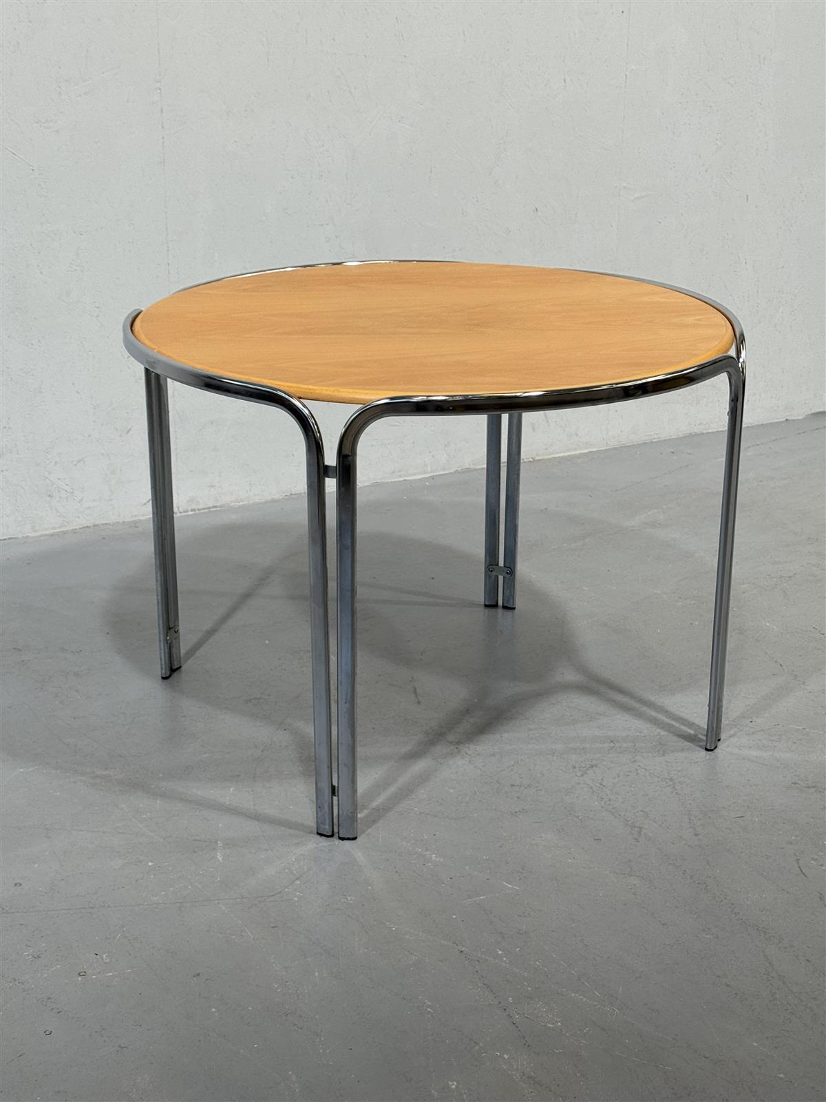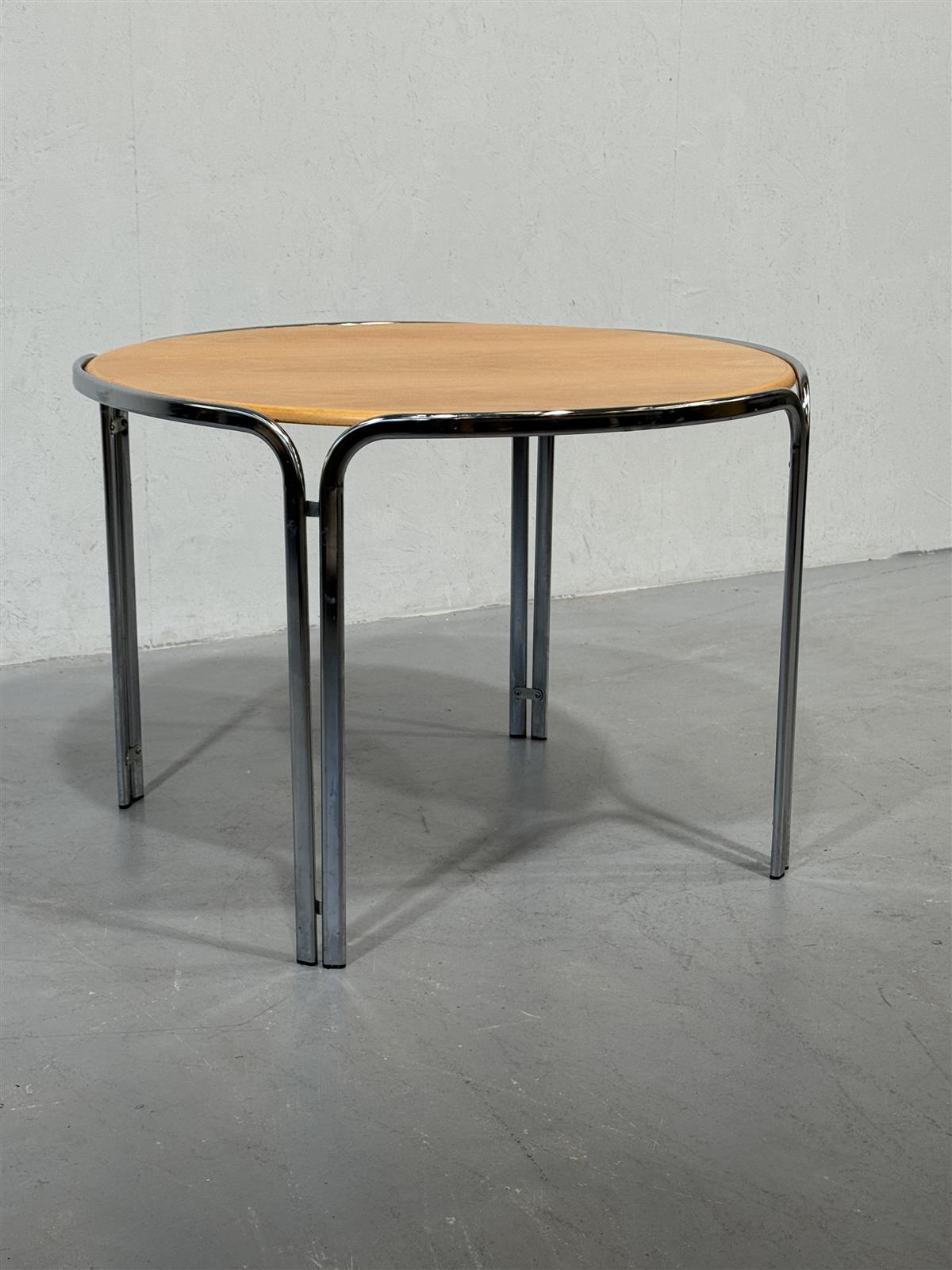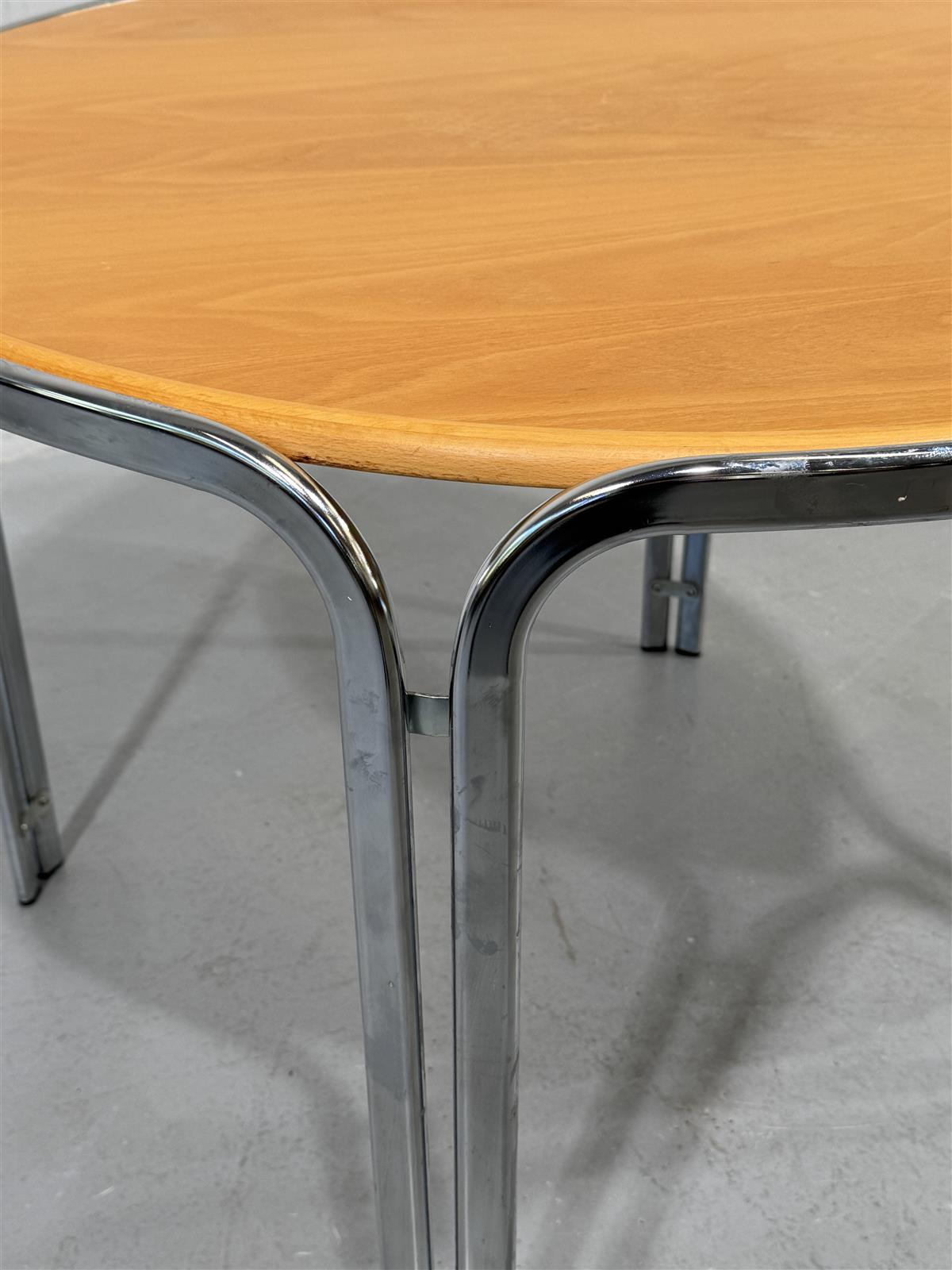 Pyöreä retro puukantinen pöytä, jossa on kromatut metallijalat. Pöydän muotoilu on yksinkertainen ja moderni, mikä tekee siitä monikäyttöisen sisustuselementin moneen tilaan. Puutason alla Asko tarra, oletettavasti taso vaihdettu pöytään jossain vaiheessa. Taso kaipaisi pinnalleen hieman puuöljyä.