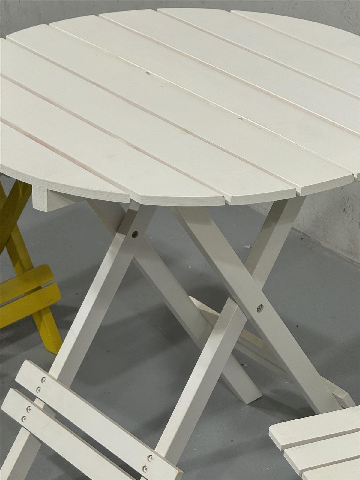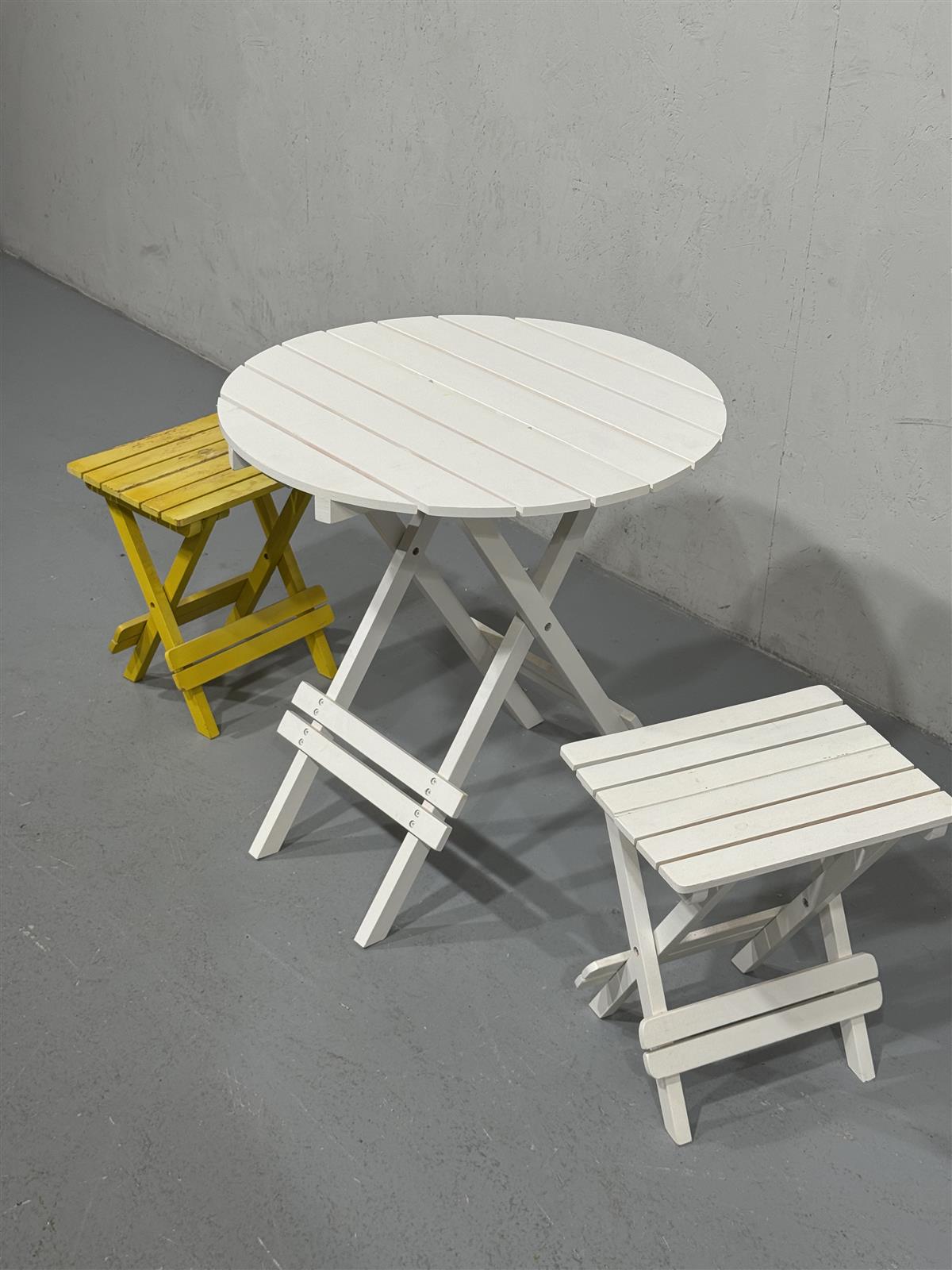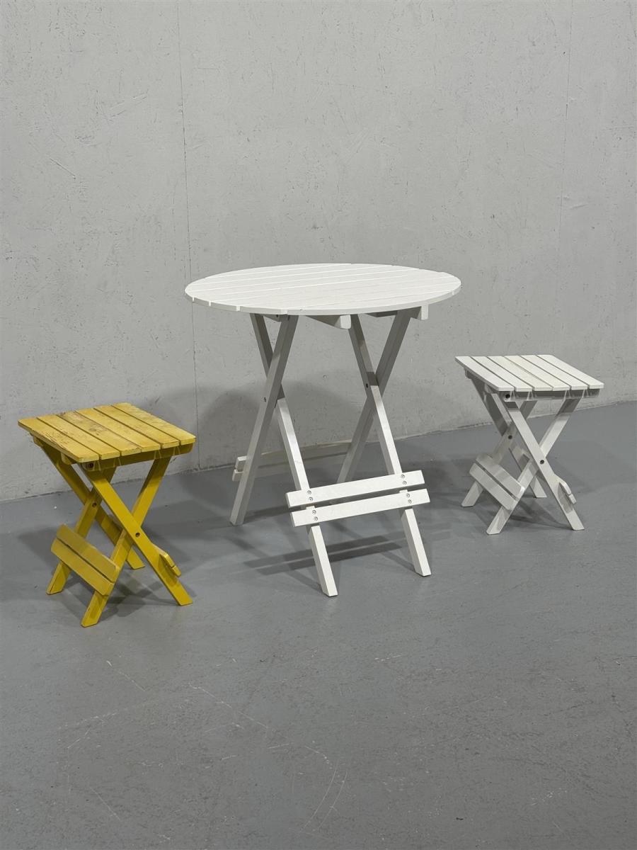 Tyylikäs retrohenkinen puutarhakalustesetti, joka koostuu yhdestä pyöreästä pöydästä ja kahdesta jakkarasta. Pöytä ja toinen jakkara ovat valkoisia, kun taas toinen jakkara on keltainen. Setti on valmistettu puusta ja siinä on taittuvat jalat, mikä tekee siitä helposti säilytettävän ja siirrettävän.