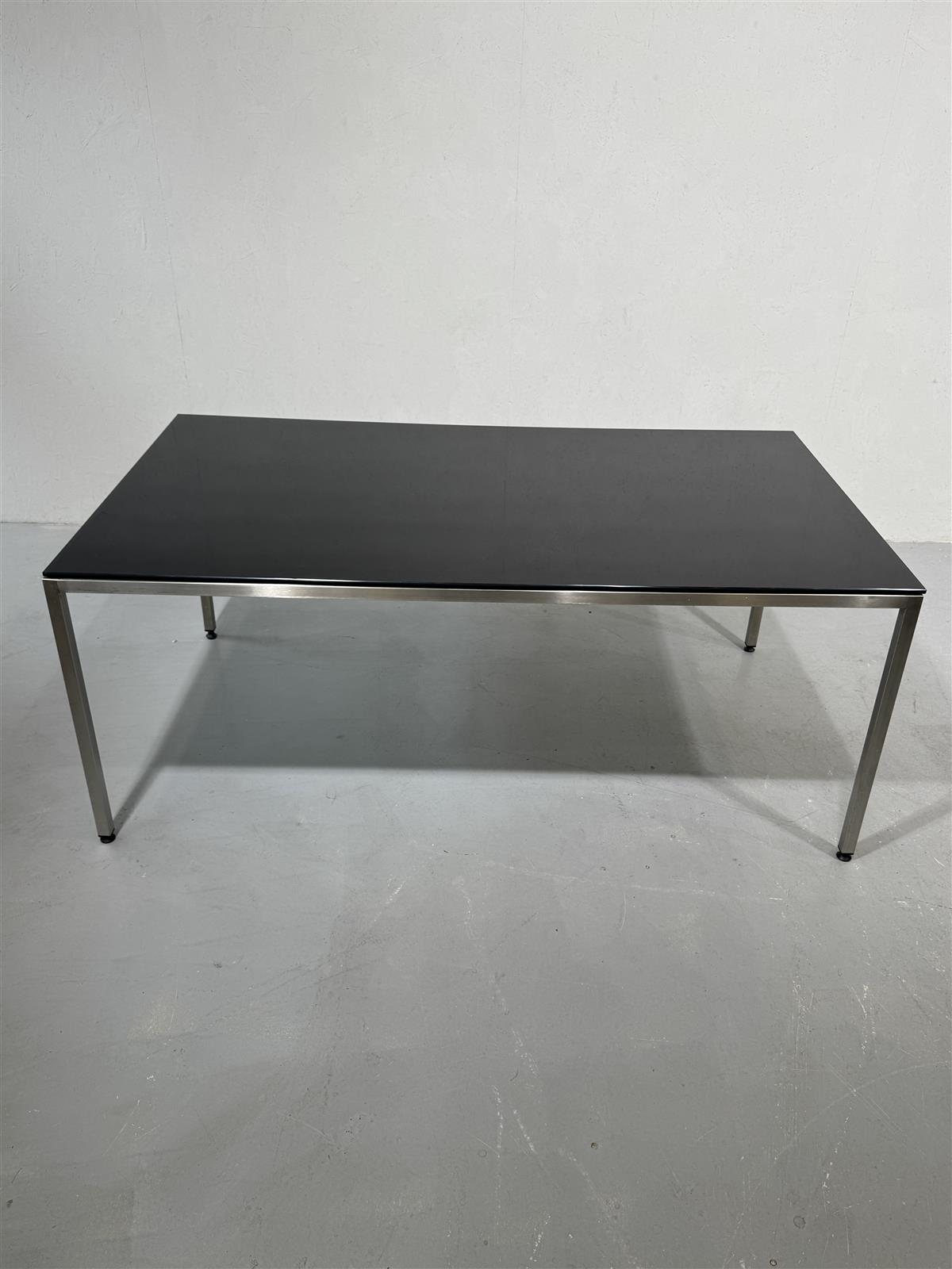 Tyylikäs, isokokoinen ruokapöytä, jossa on musta lasikansi ja metalliset kromijalat. Pöydän mitat ovat 180 cm x 100 cm, mikä tekee siitä sopivan suurempaankin ruokailutilaan. Jaloissa säätövaraa suoristukseen.