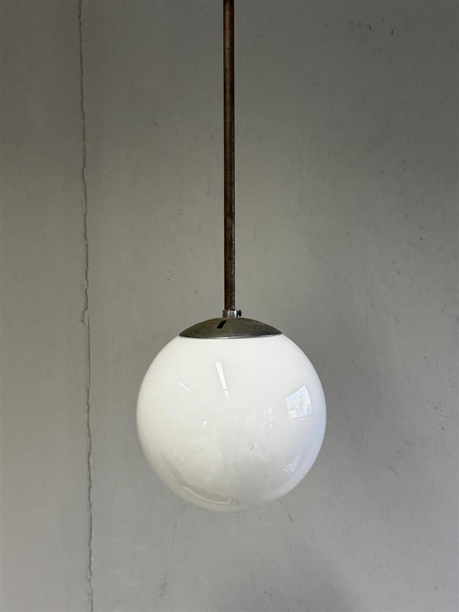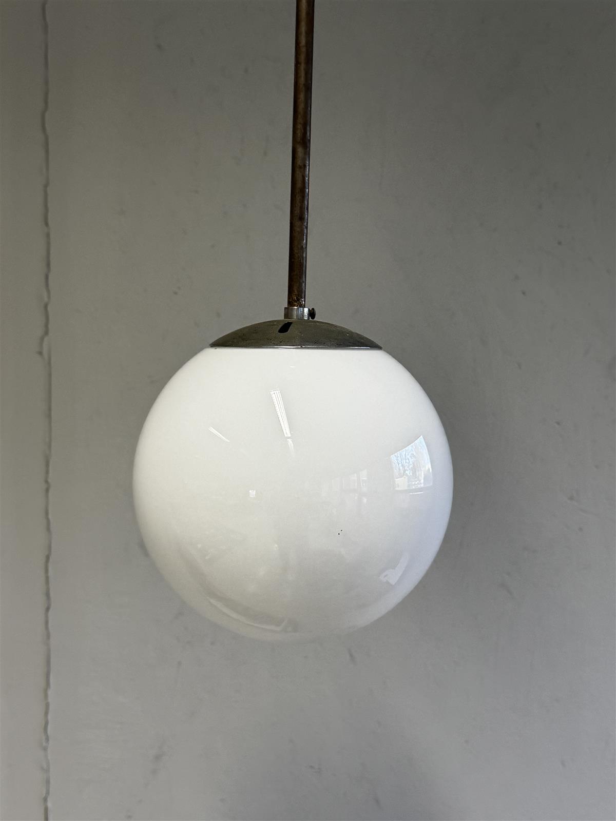 Valkoinen riippuvalaisin, jossa on metallinen kiinnitysosa. Valaisimen muoto on pyöreä ja se on suunniteltu roikkumaan katosta.