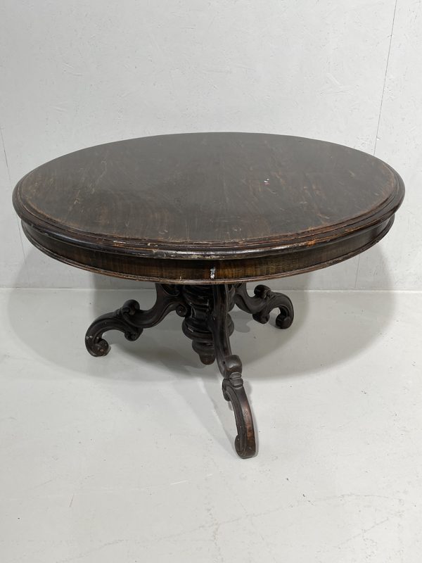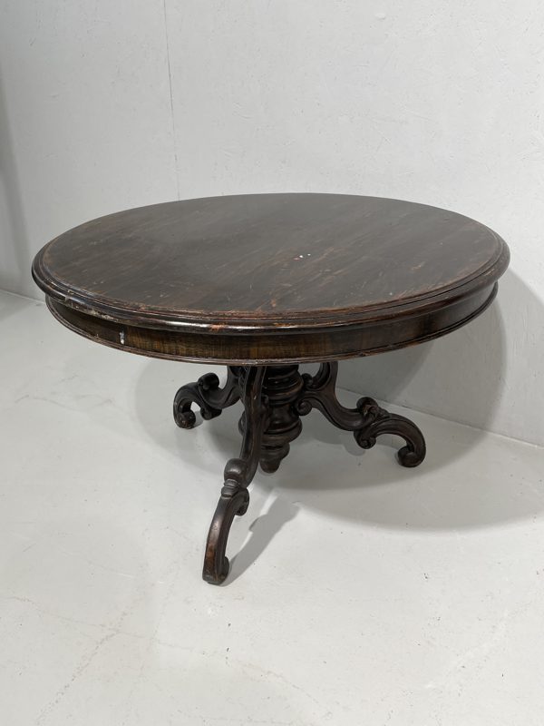 Puinen rokokoo jalkainen sohvapöytä, jossa pyöreä taso. Arviolta 1900 luvun alkupuolta. Tasossa käytön jälkeä ja hieman vinossa jalan päällä.