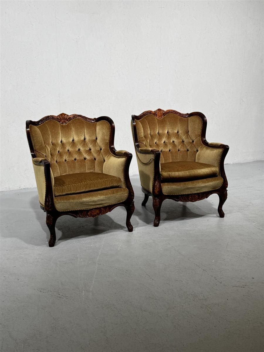 Kaksi rokokoo-tyylistä nojatuolia, joissa on koristeelliset kaiverrukset ja napitettu verhoilu. Tuolit ovat ruskean sävyisiä ja niissä on pehmeät istuintyynyt.