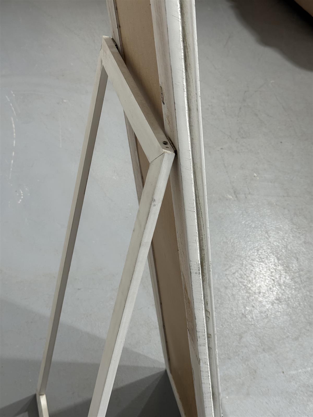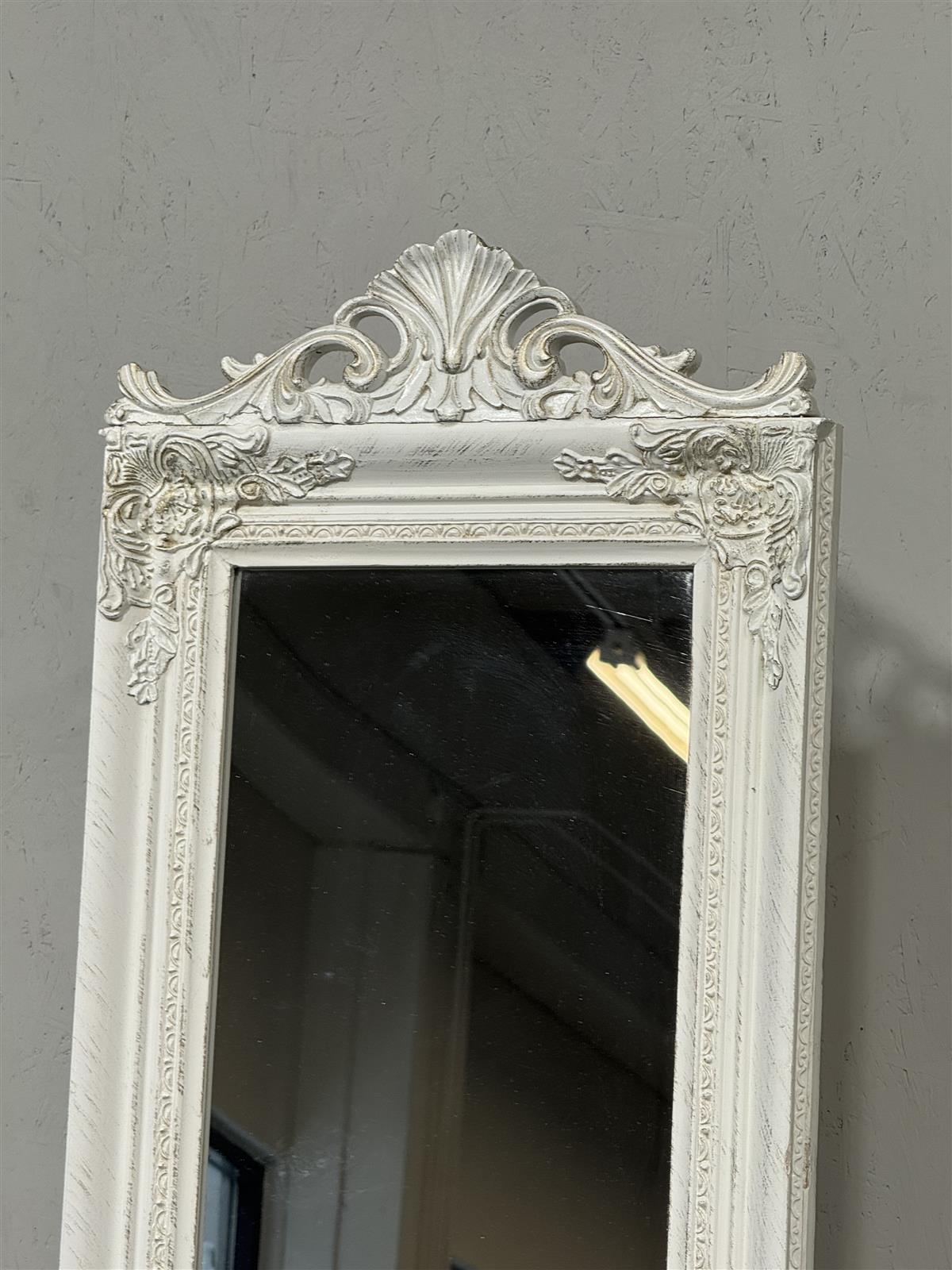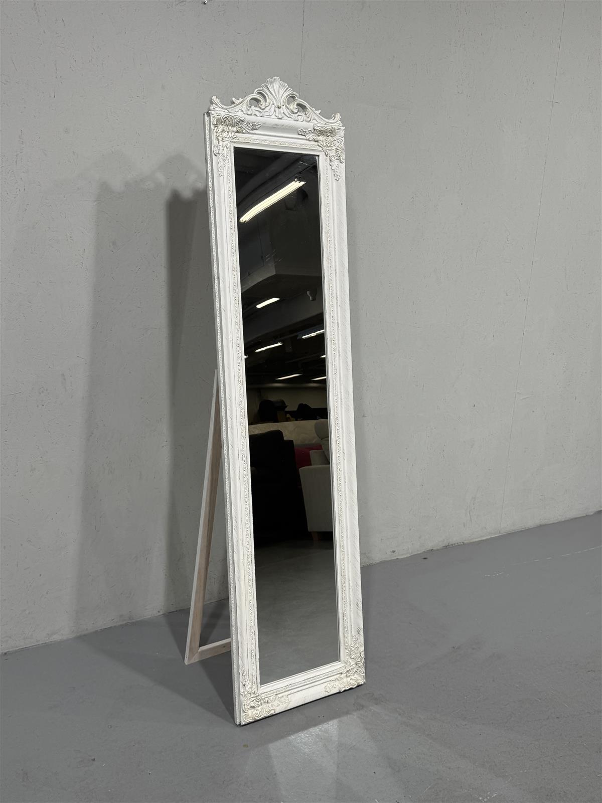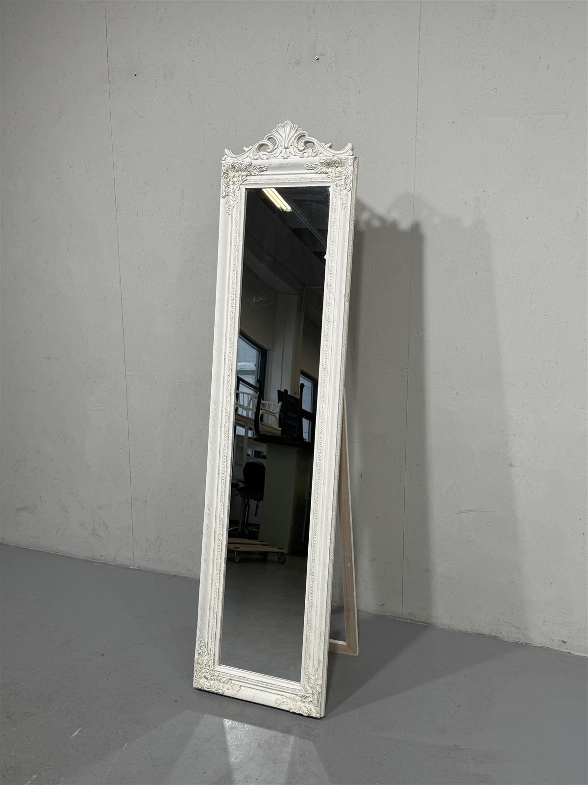 Koristeellinen valkoinen peili, jossa on rokokoo-tyylinen kehys. Peili on seisova ja siinä on tukeva jalusta takana.