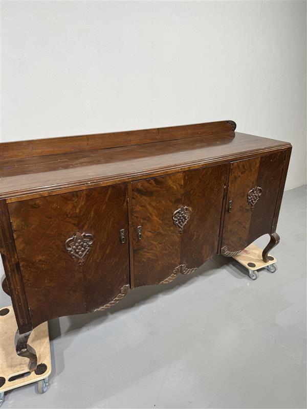 Kauniisti koristeltu tumma puinen rokokoo senkki, jossa on elegantit kaiverrukset ja vekitetyt jalat.