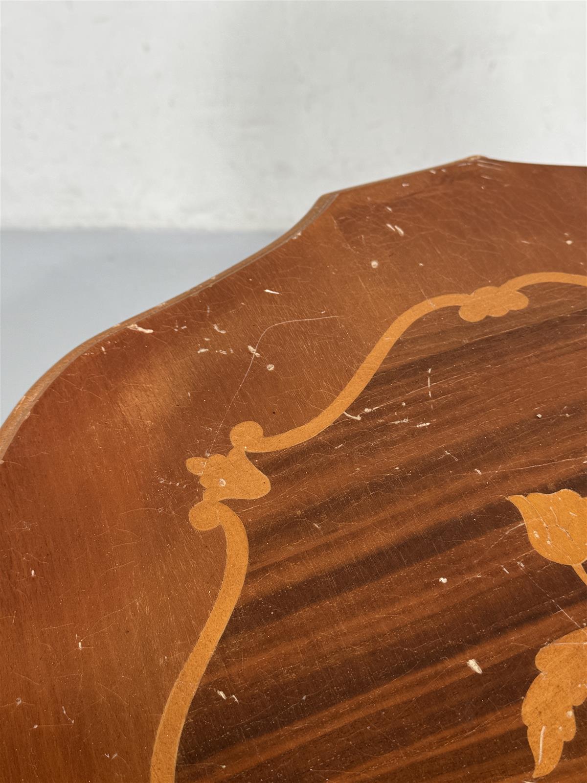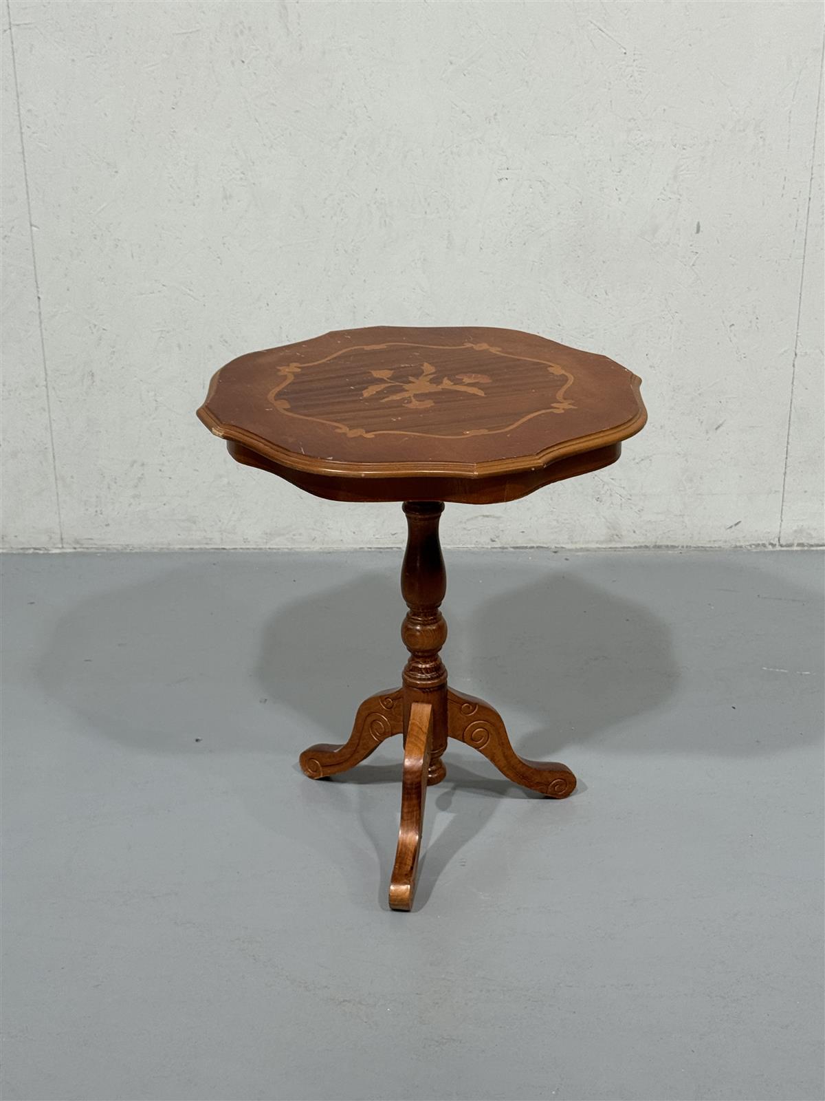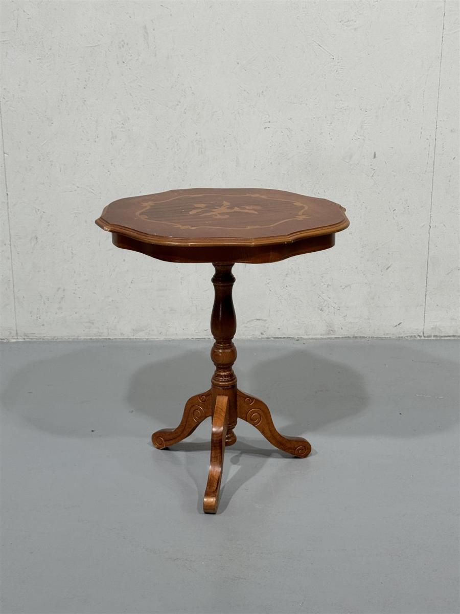 Pyöreä rokokoo-tyylinen sivupöytä, jossa on koristeellinen jalka ja kauniit yksityiskohdat kannessa. Pöydän pinta on koristeltu kukkakuviolla.