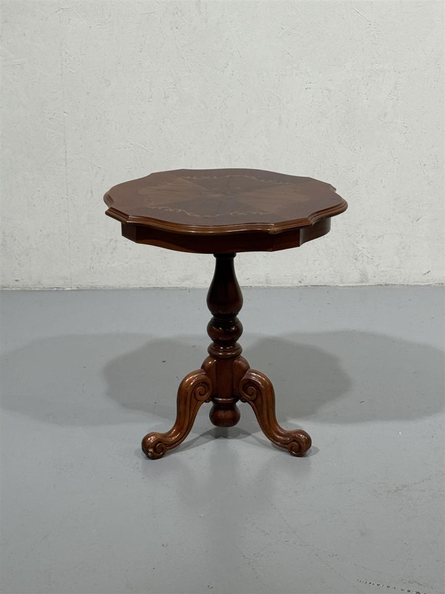 Pieni pyöreä sivupöytä, jossa on koristeellinen jalka ja kauniisti muotoiltu pöytälevy. Pöydän pinta on kiillotettu ja siinä on hienovaraisia koristekuvioita, jotka lisäävät sen viehättävyyttä.