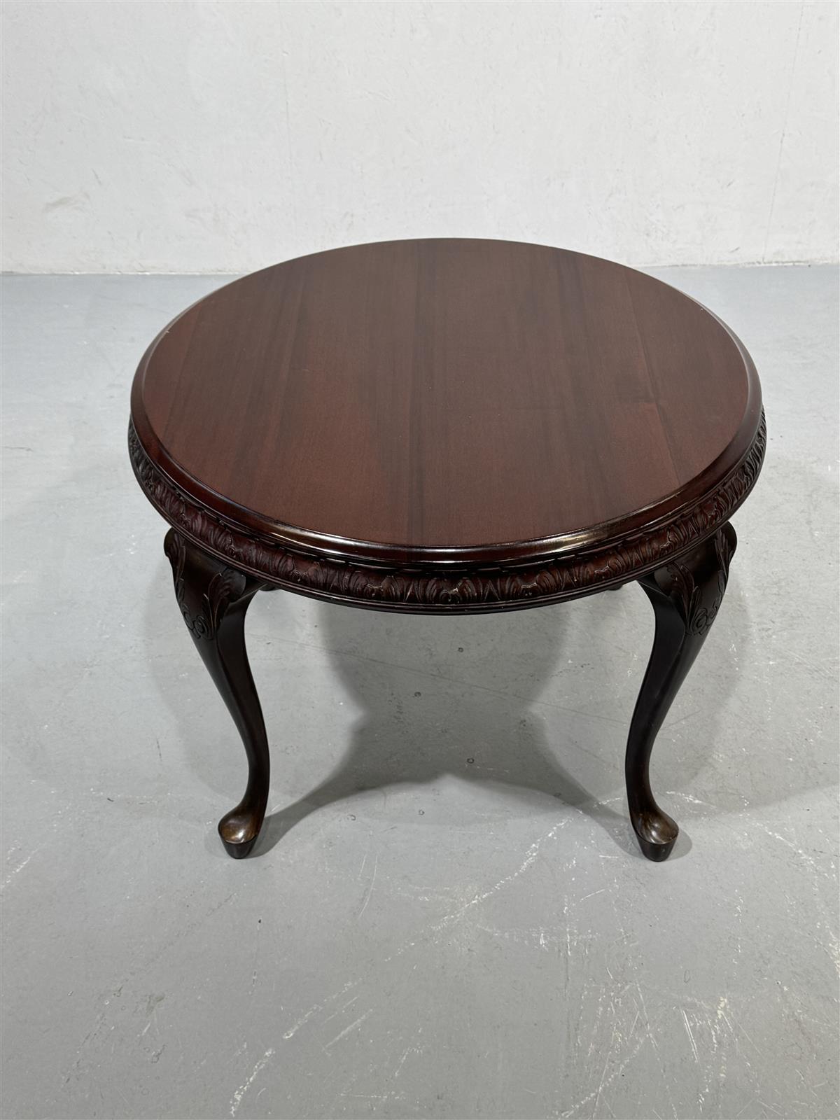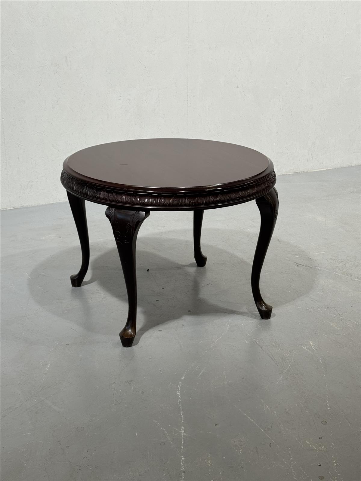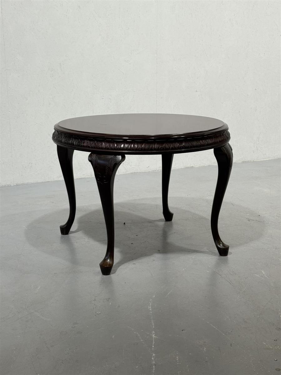 Pyöreä sohvapöytä, jossa on koristeelliset jalat ja kauniisti veistetty reuna. Pöydän pinta on tummanruskea ja kiiltävä, mikä antaa sille arvokkaan ilmeen. Haljaisika 88cm, korkeus 65cm