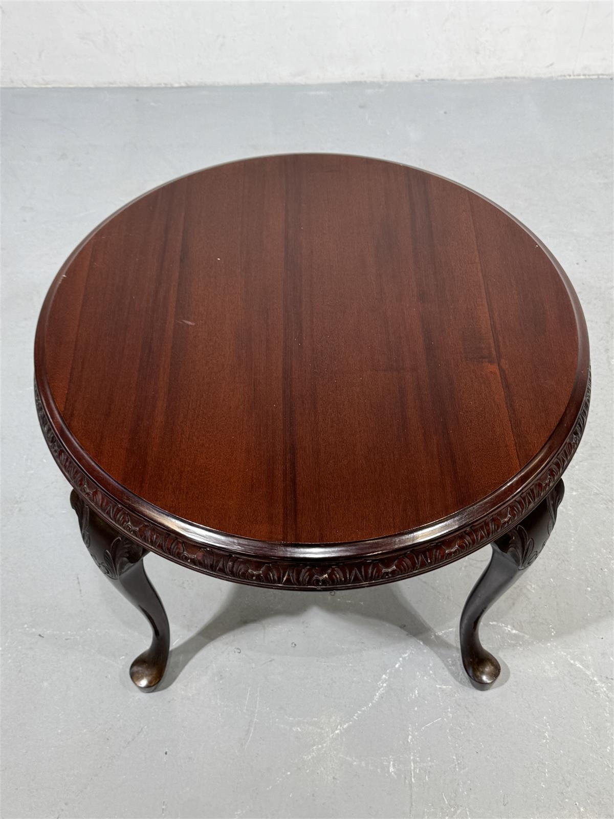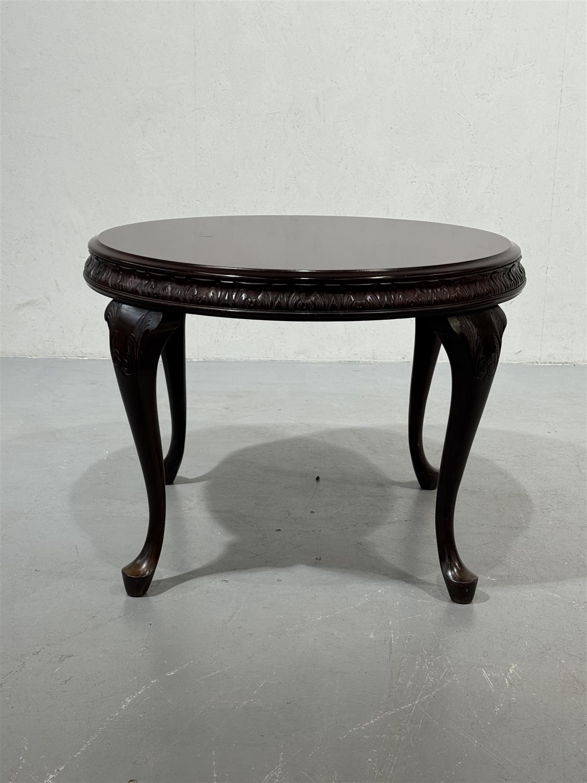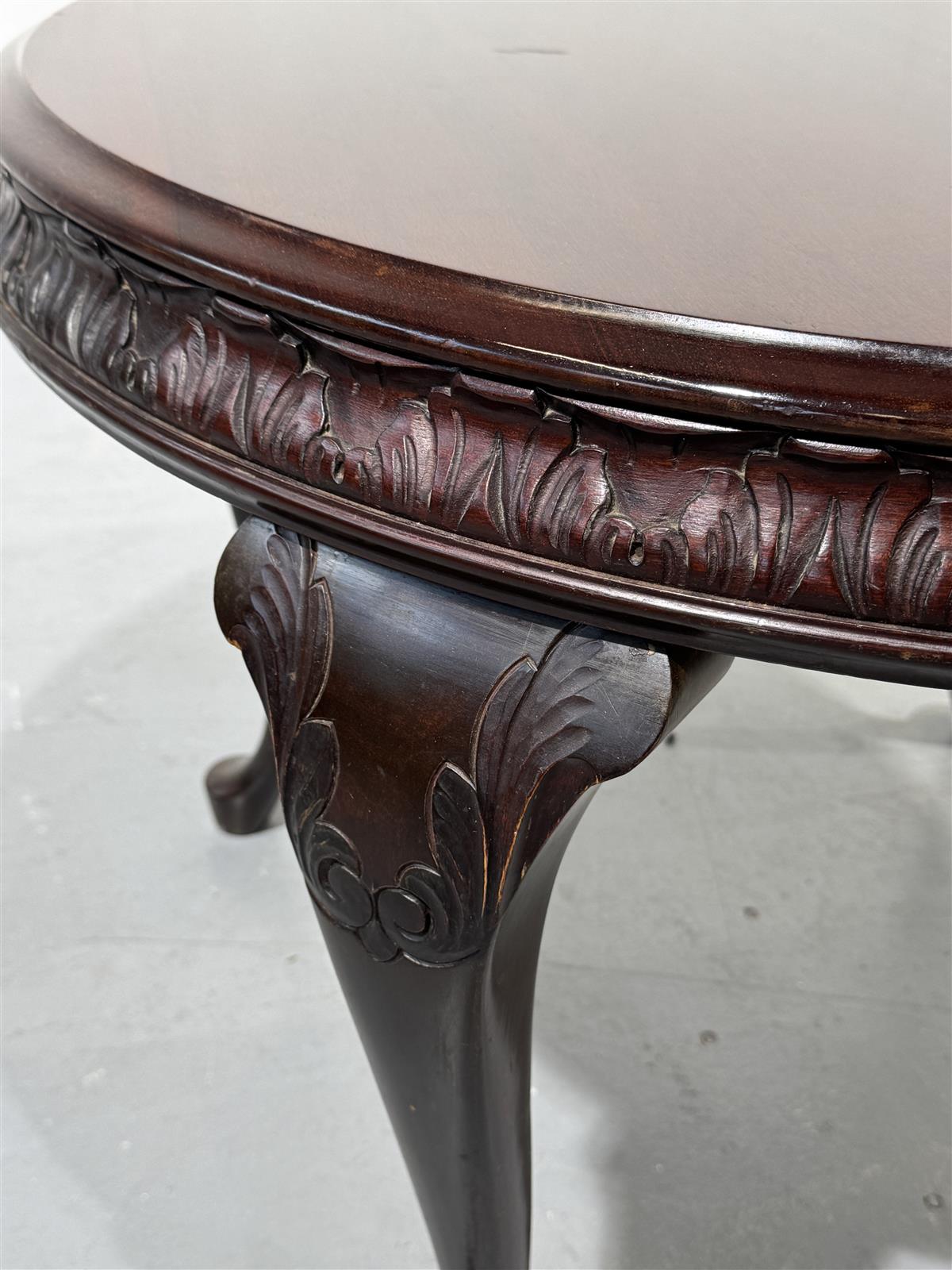 Pyöreä sohvapöytä, jossa on koristeelliset jalat ja kauniisti veistetty reuna. Pöydän pinta on tummanruskea ja kiiltävä, mikä antaa sille arvokkaan ilmeen. Haljaisika 88cm, korkeus 65cm