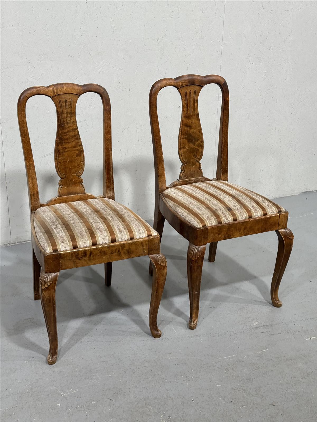 Kaksi rokokoo-tyylistä tuolia, joissa on koristeelliset selkänojat ja raidalliset istuimet. Tuolit ovat ruskeita ja niissä on kaarevat jalat.
