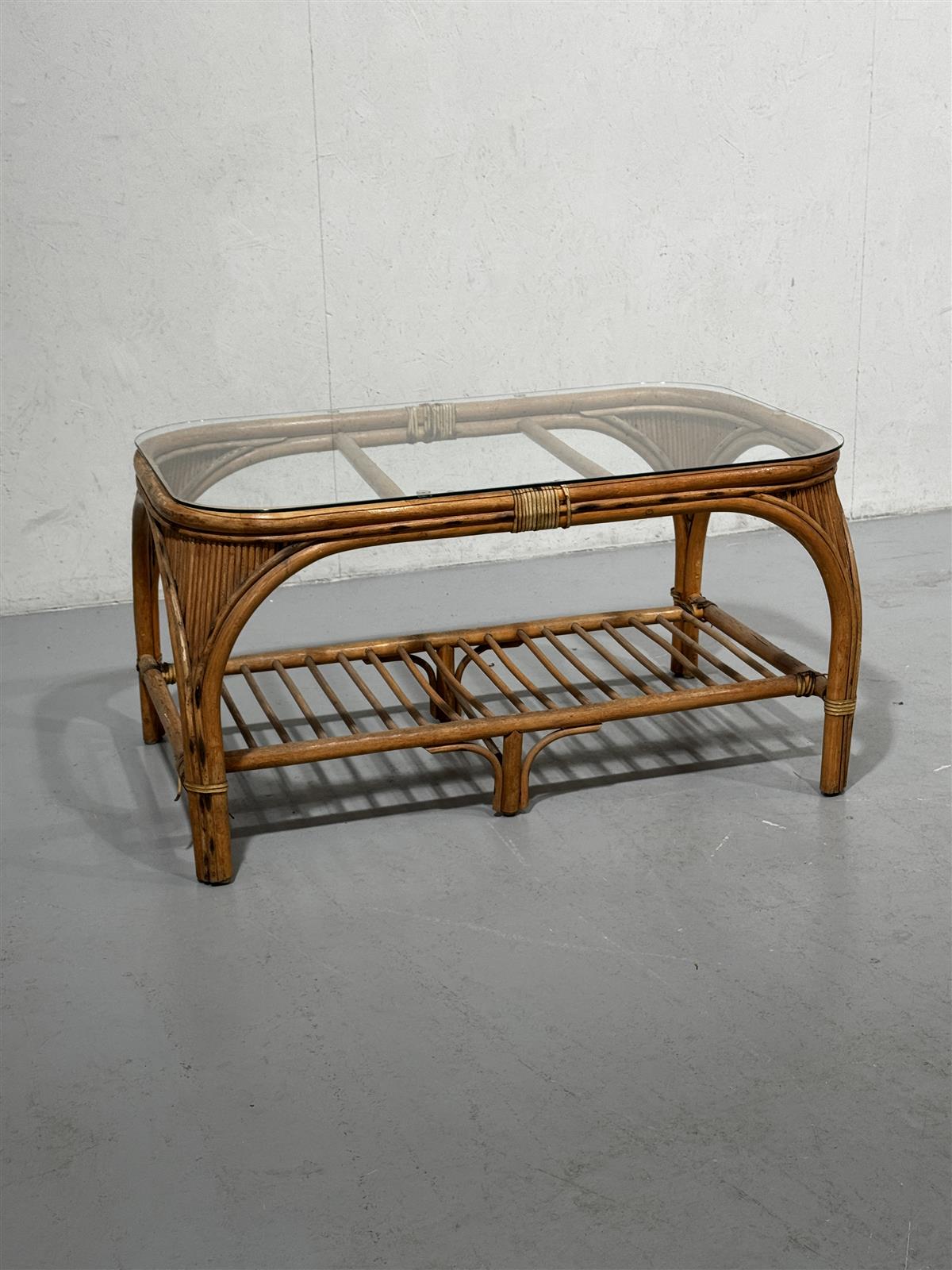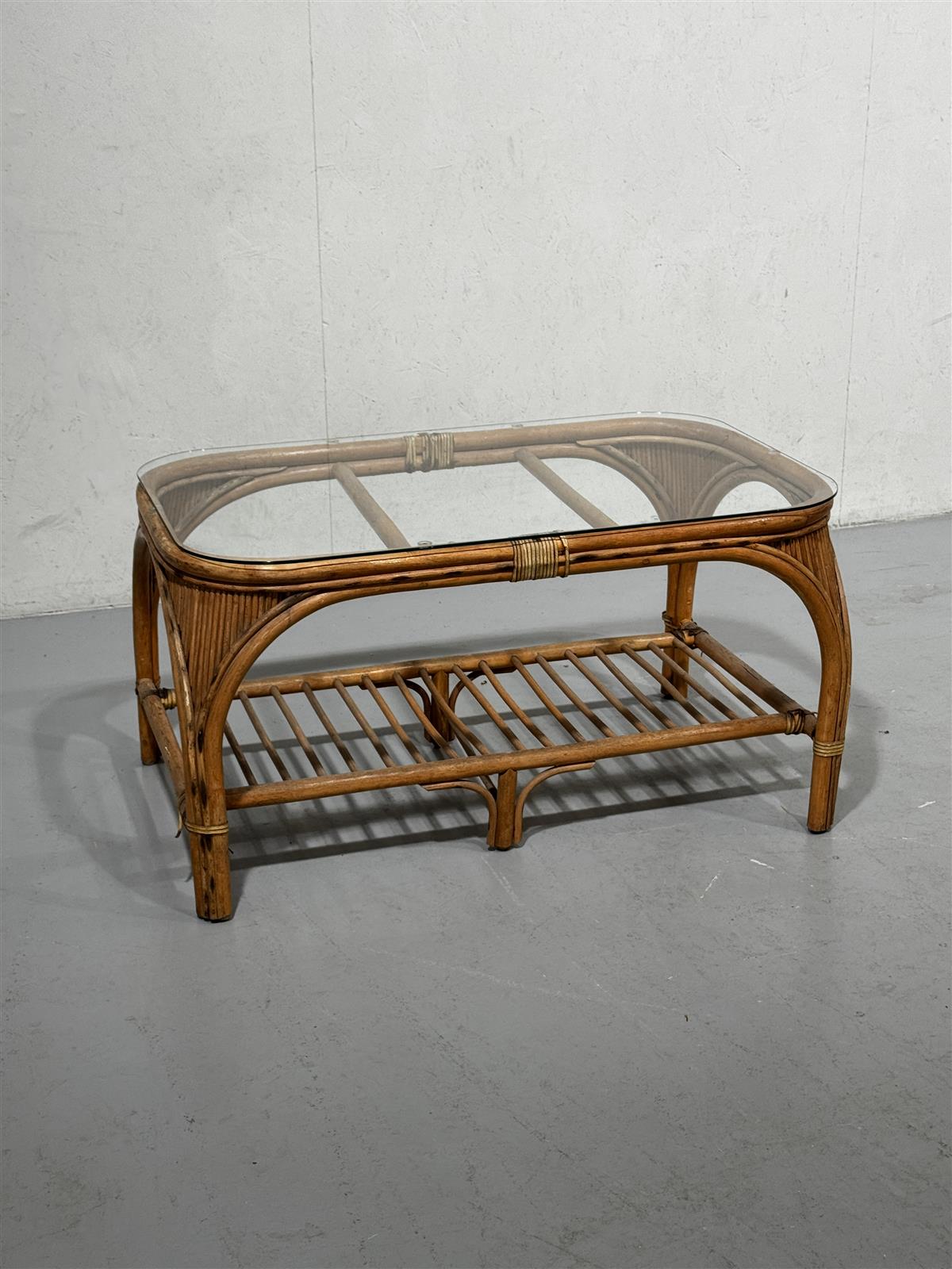 Lasitasoinen sohvapöytä parvekkeelle, jossa on rottinkinen runko ja lasikansi. Pöydän alapuolella on säilytystila.