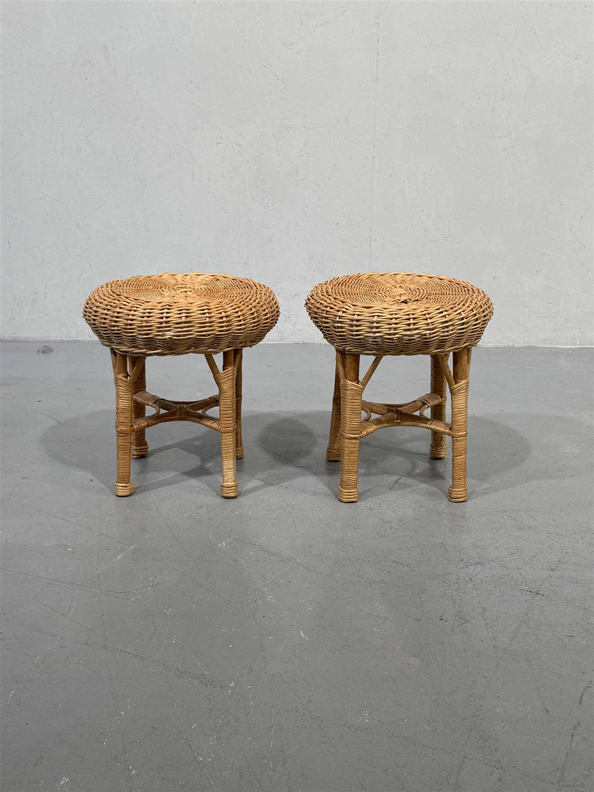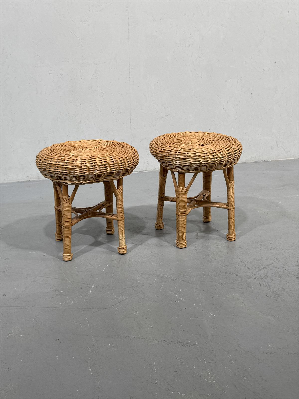 Kaksi rottinkijakkaraa, jotka ovat kevyitä ja helposti siirreltäviä. Jakkarat ovat pyöreitä, halkaisija 42cm ja niissä on punottu istuinosa, joka tuo luonnonläheistä tunnelmaa sisustukseen. Jalat ovat tukevat ja niissä on lisätukirakenteet, jotka parantavat kestävyyttä. Sopivia istuimiksi tai tasoiksi.