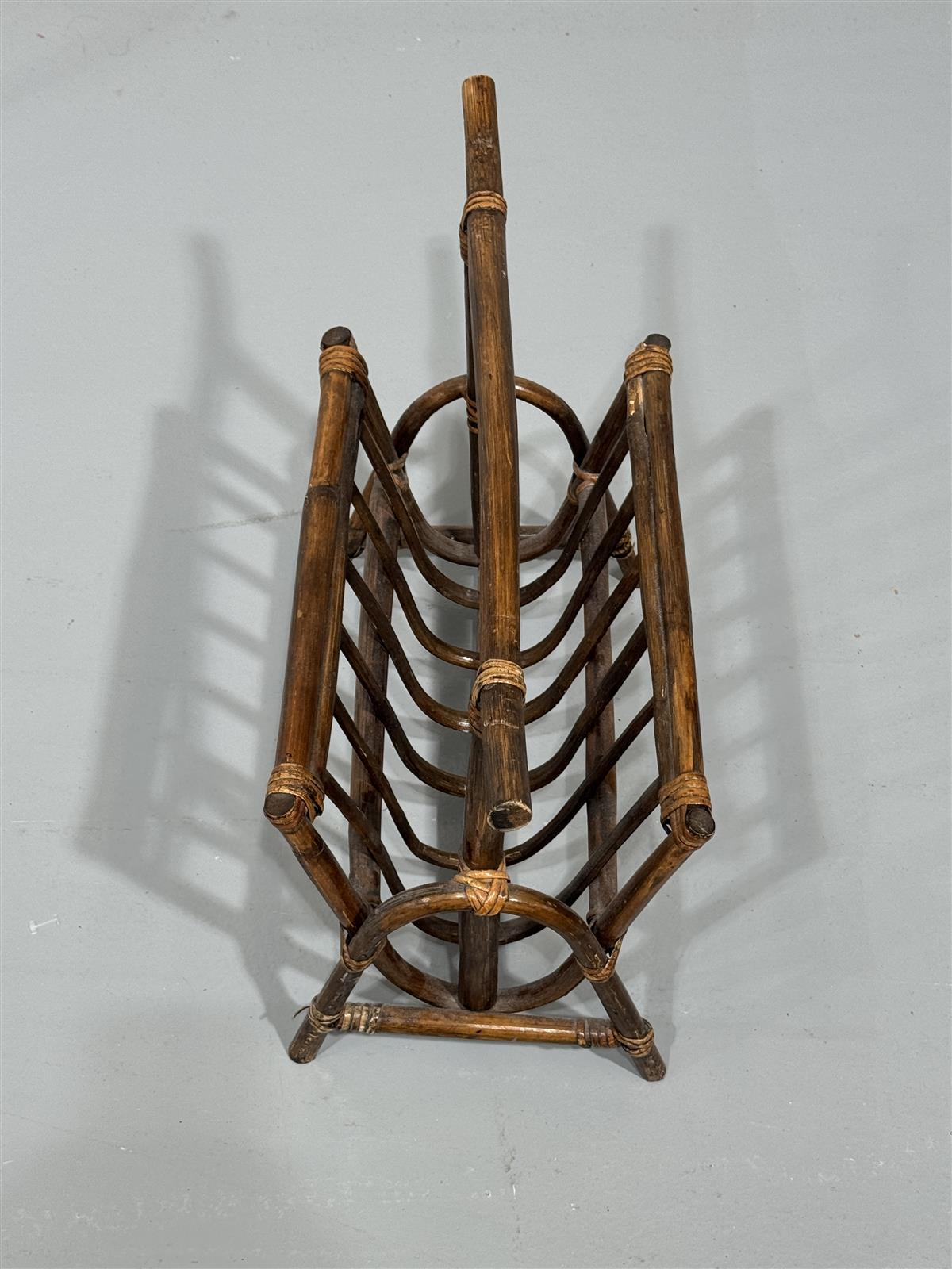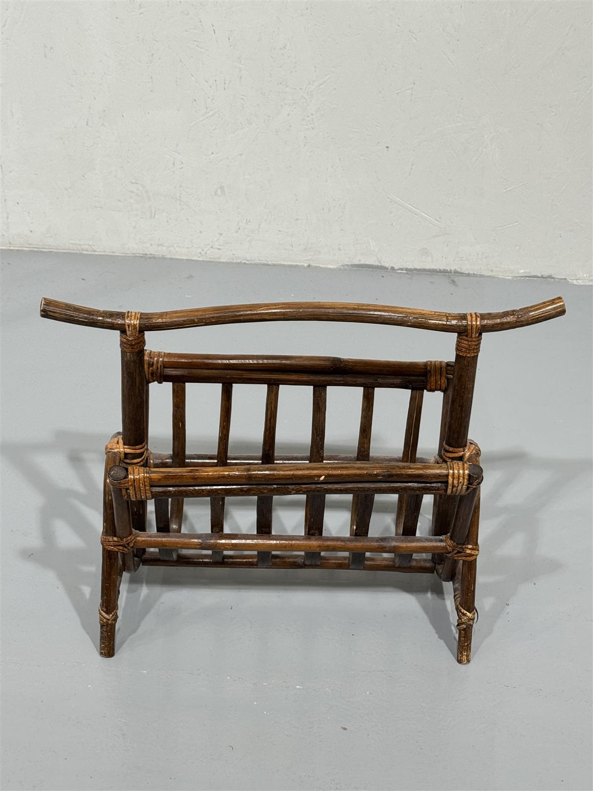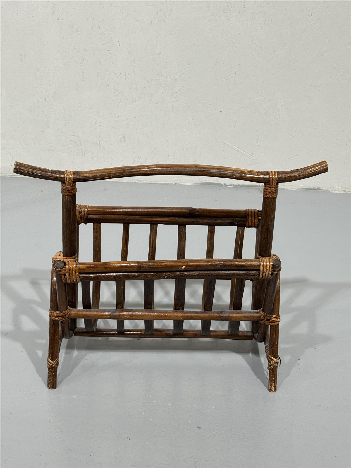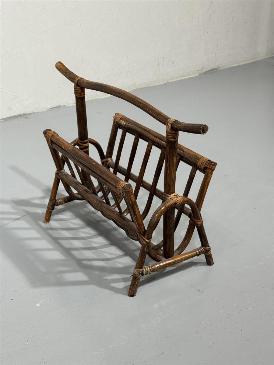 Rottinkinen lehtiteline, joka on valmistettu tummasta rottingista. Sen muotoilu on yksinkertainen ja käytännöllinen, ja se sopii hyvin lehtien tai aikakauslehtien säilytykseen. Telineessä on kaarevat kahvat, jotka helpottavat sen siirtämistä paikasta toiseen.