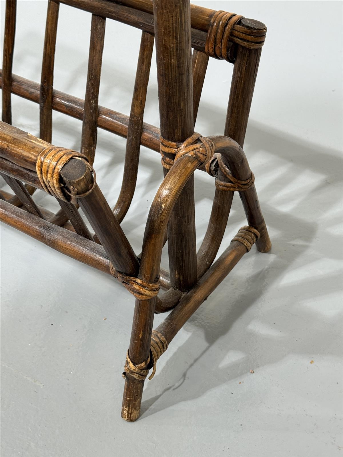 Telineessä on näkyvissä kulumia ja pieniä naarmuja, jotka kertovat sen käytöstä. Rottinki on paikoitellen hieman kulunut, mutta teline on edelleen tukeva ja käyttökelpoinen.