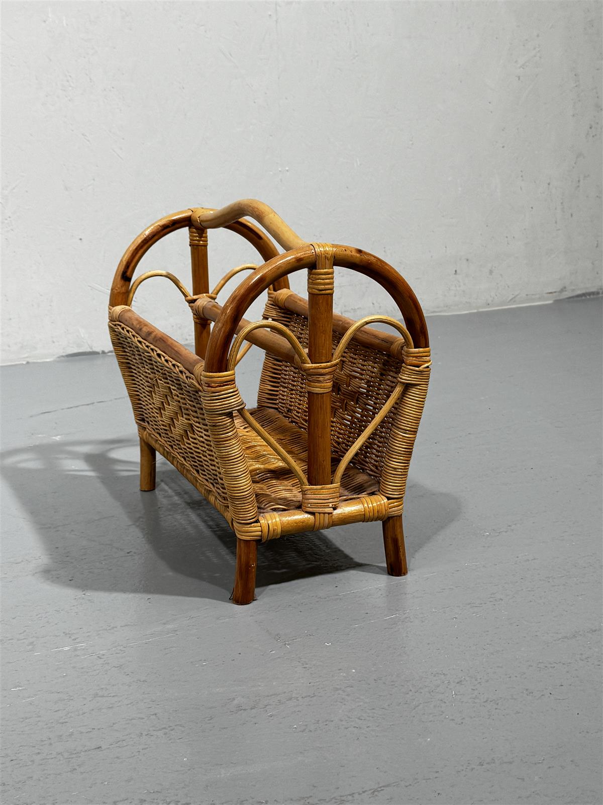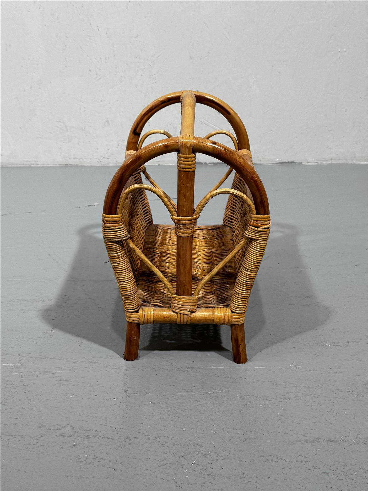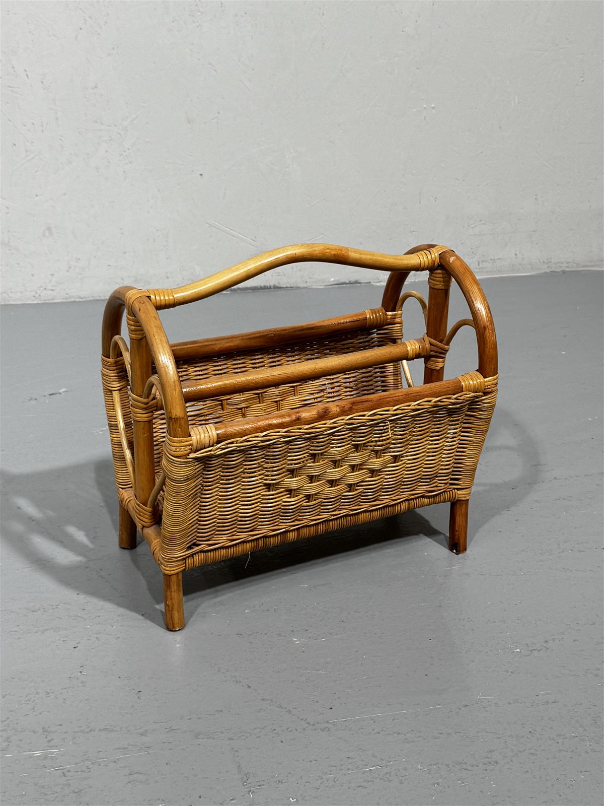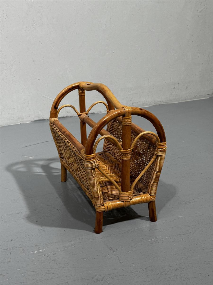 Rottinkinen lehtiteline, joka on valmistettu luonnonvärisestä rottingista. Telineessä on kaarevat kahvat ja punottu rakenne, joka antaa sille kevyen ja ilmavan ilmeen. Sopii hyvin lehtien tai aikakauslehtien säilytykseen olohuoneessa tai makuuhuoneessa.