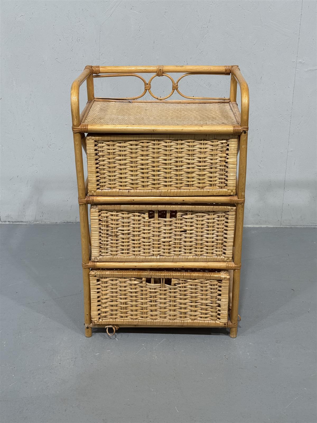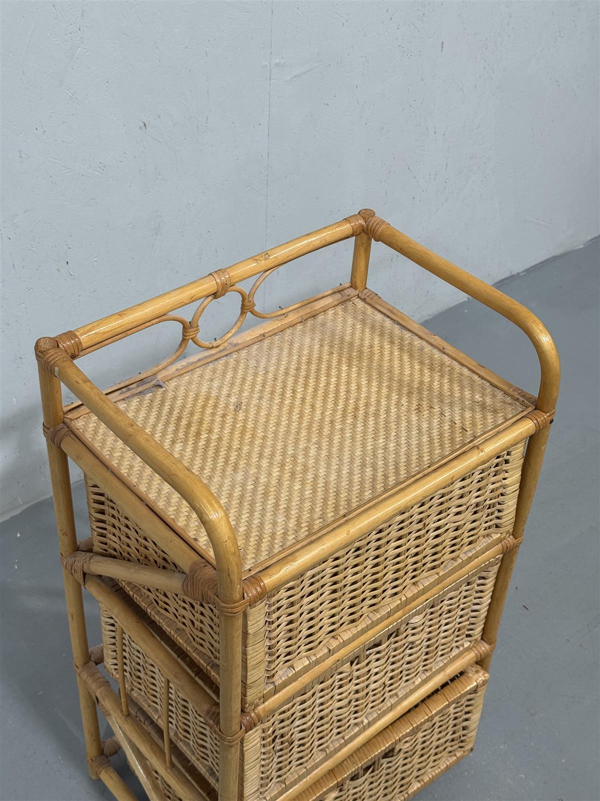 Kolmella punotulla laatikolla varustettu rottinkinen lipasto. Rottinki revennyt alakulmasta.
