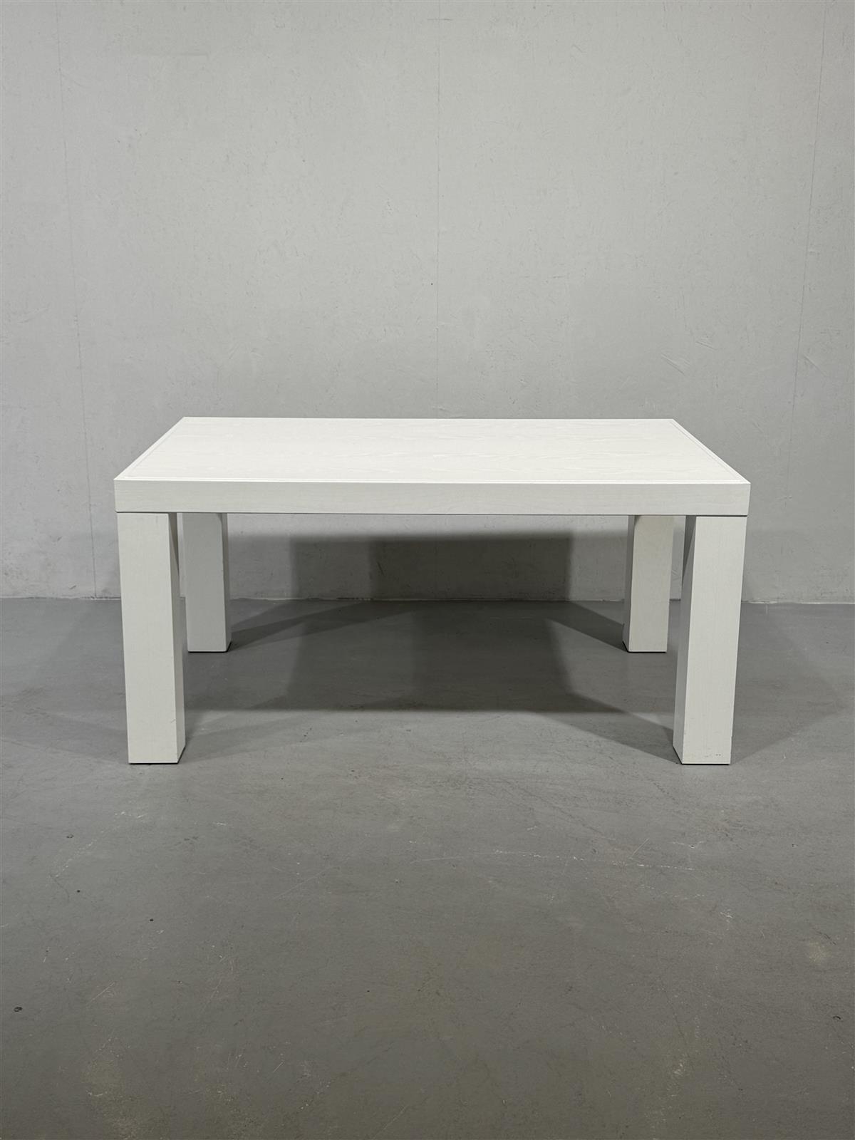 Valkoinen pöytä, valmistettu puusta ja päällä valkoinen maali. Tukevat paksut jalat ja runko. Yksinkertainen ja moderni muotoilu, sopii hyvin erilaisiin sisustustyyleihin. Maalipinnoilla käytön kulumaa, erityisesti jaloissa.