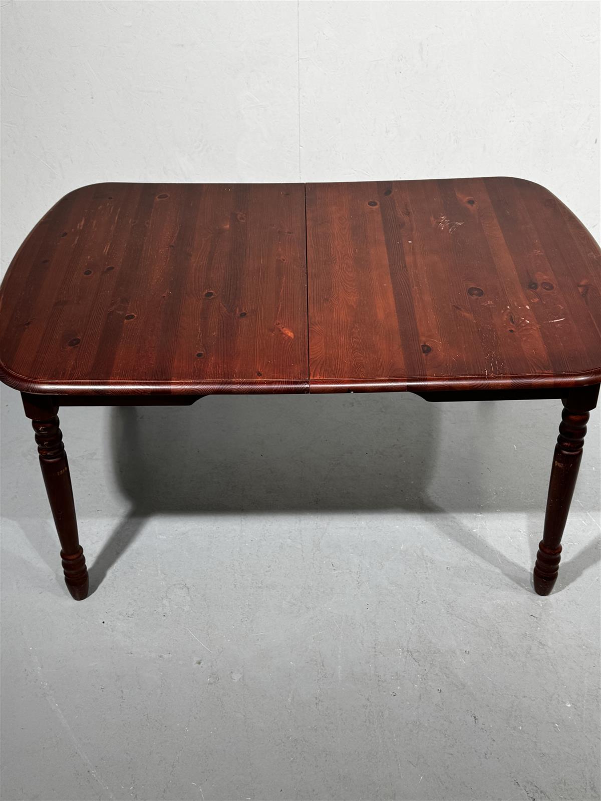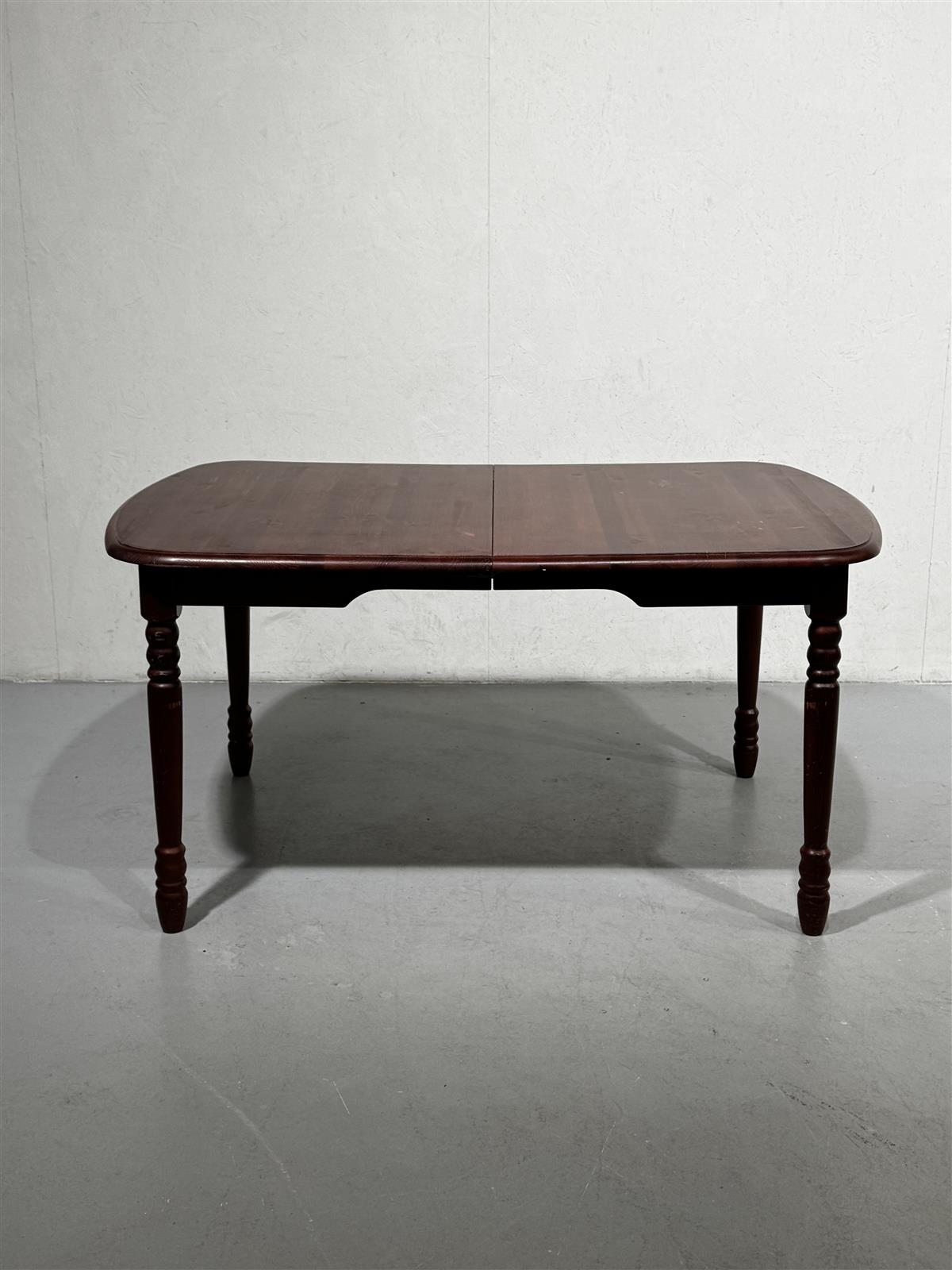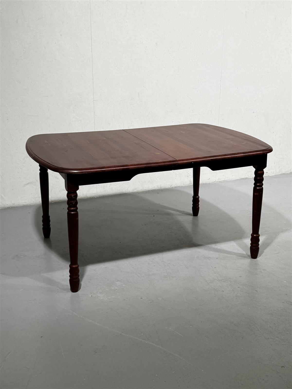 Puinen ruokapöytä, jossa on pyöristetyt kulmat ja koristeelliset jalat. Pöydän pinta on tasainen ja siinä on keskellä sauma, joka mahdollistaa jatkopalan käytön +50cm.