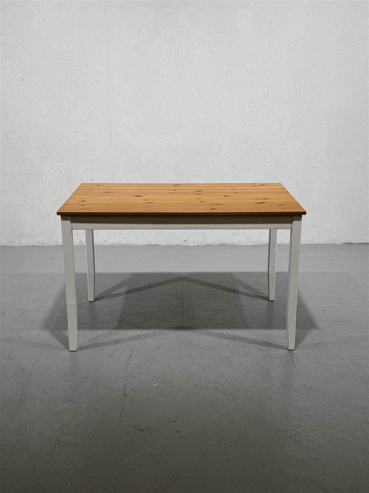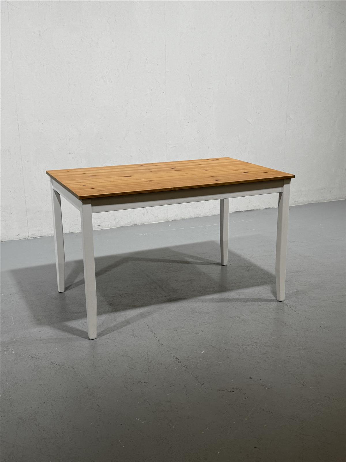 Tyylikäs ruokapöytä, jossa on puinen kansi ja valkoiset jalat. Pöydän mitat ovat 118cm x74 cm, mikä tekee siitä sopivan useimpiin ruokailutiloihin.