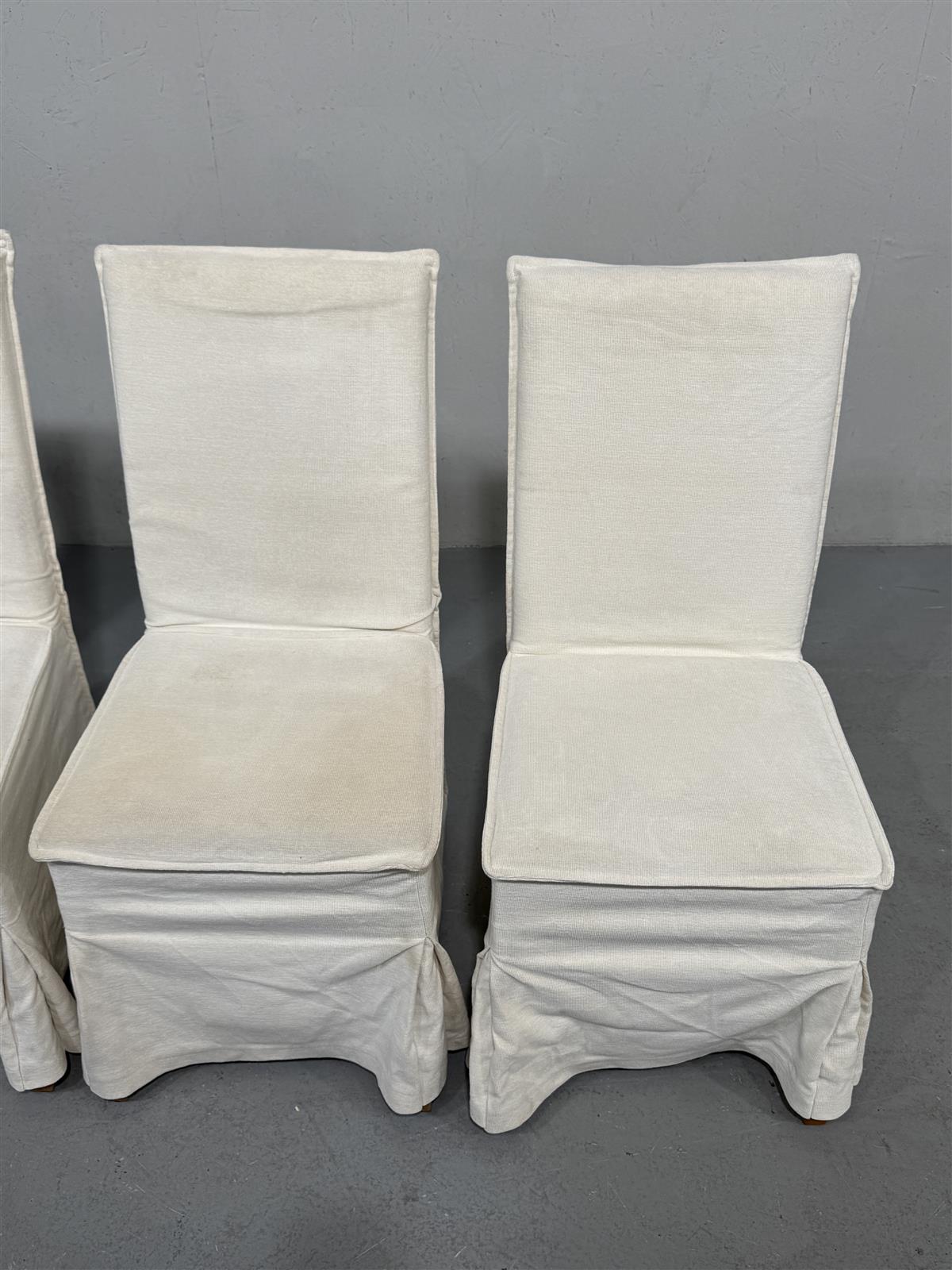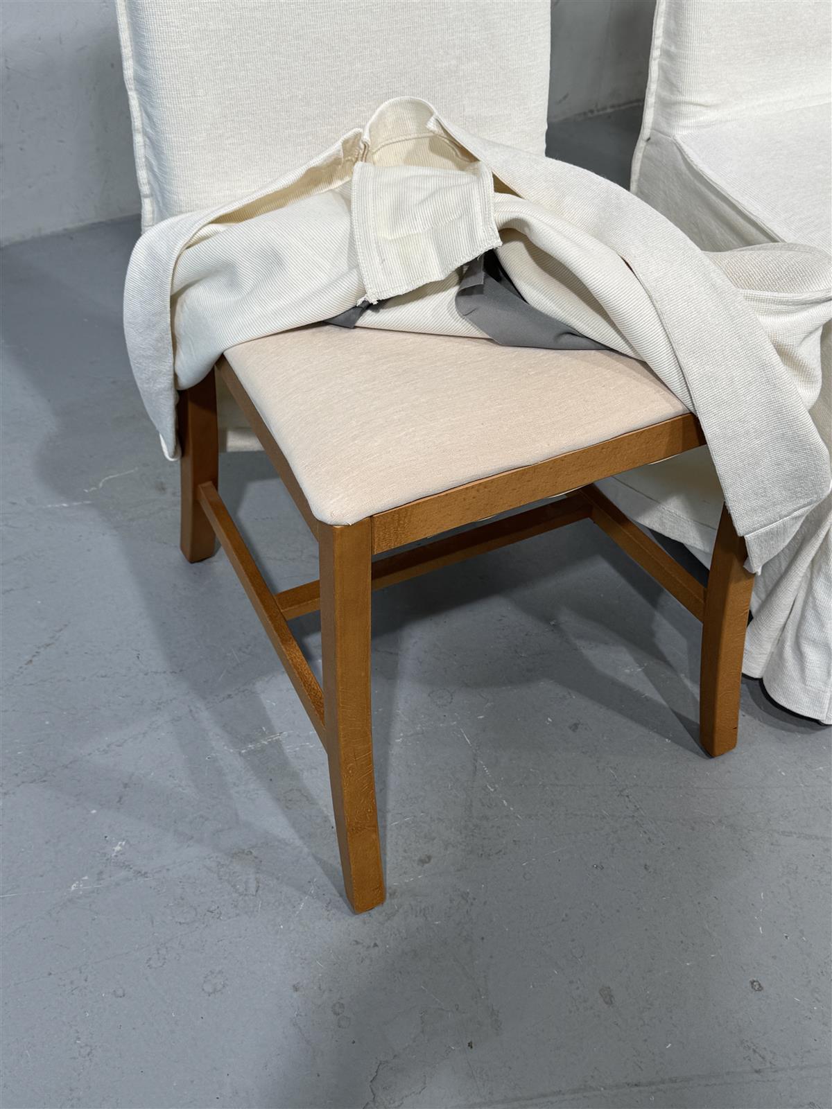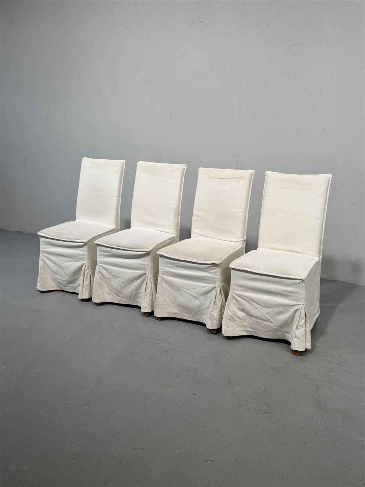 Neljä valkoista tuolia, joissa on irrotettavat päälliset. Tuolit ovat yksinkertaisen tyylikkäitä ja sopivat monenlaiseen sisustukseen. Päälliset ovat irroitettavissa ja pestävissä. Kankaat helppohoitoiset ja antavat tuoleille pehmeän ilmeen. Runko on tukevaa puuta, mikä tekee tuoleista tukevat ja kestävät.