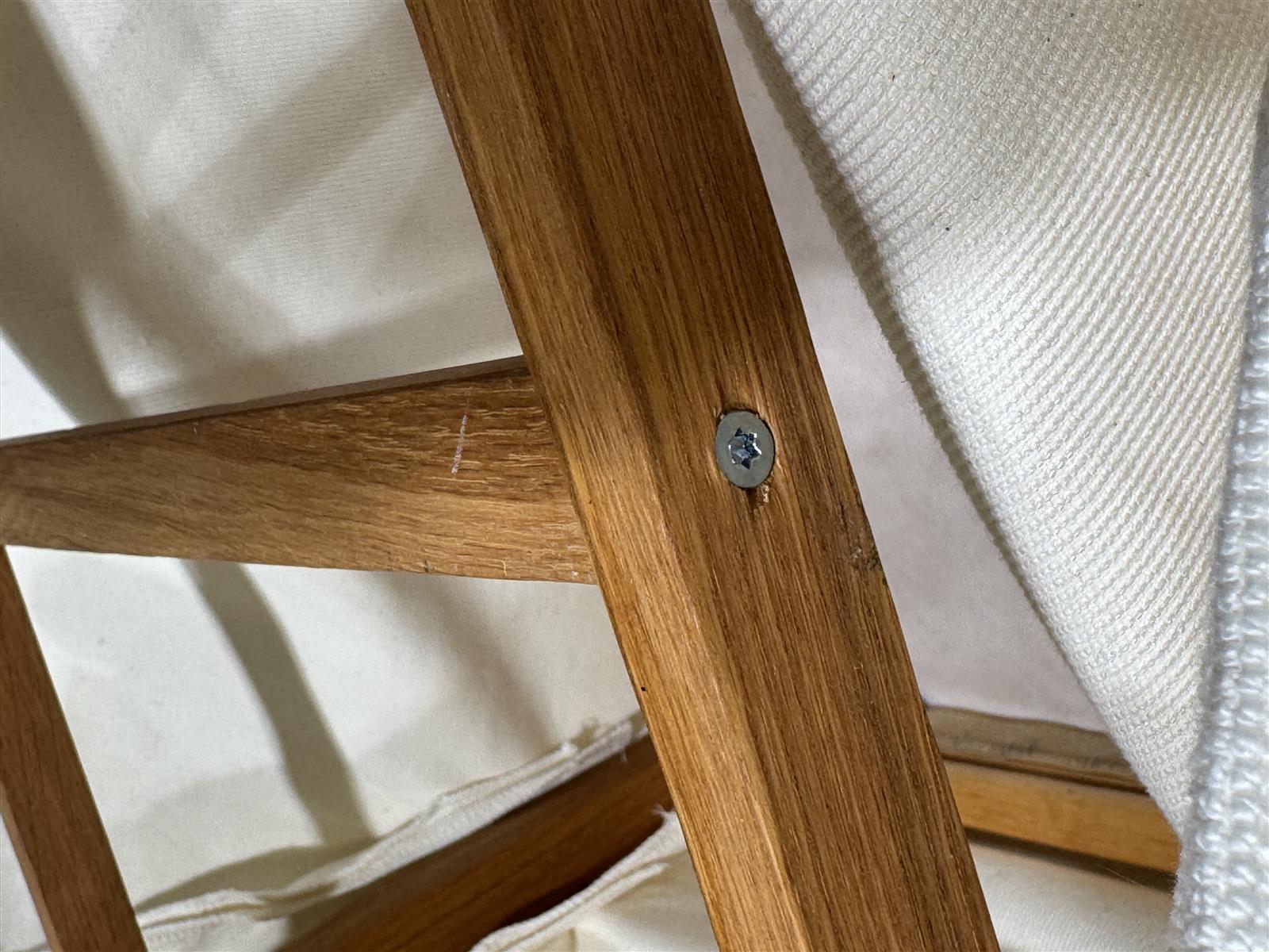 Tuolit ovat hyvässä kunnossa, mutta kankaissa on pientä tahraa, joten alkuun kankaille pesu. Yhden tuolin tukipuu korjattu siististi, eikä näy helman alta päällepäin (ks kuva).