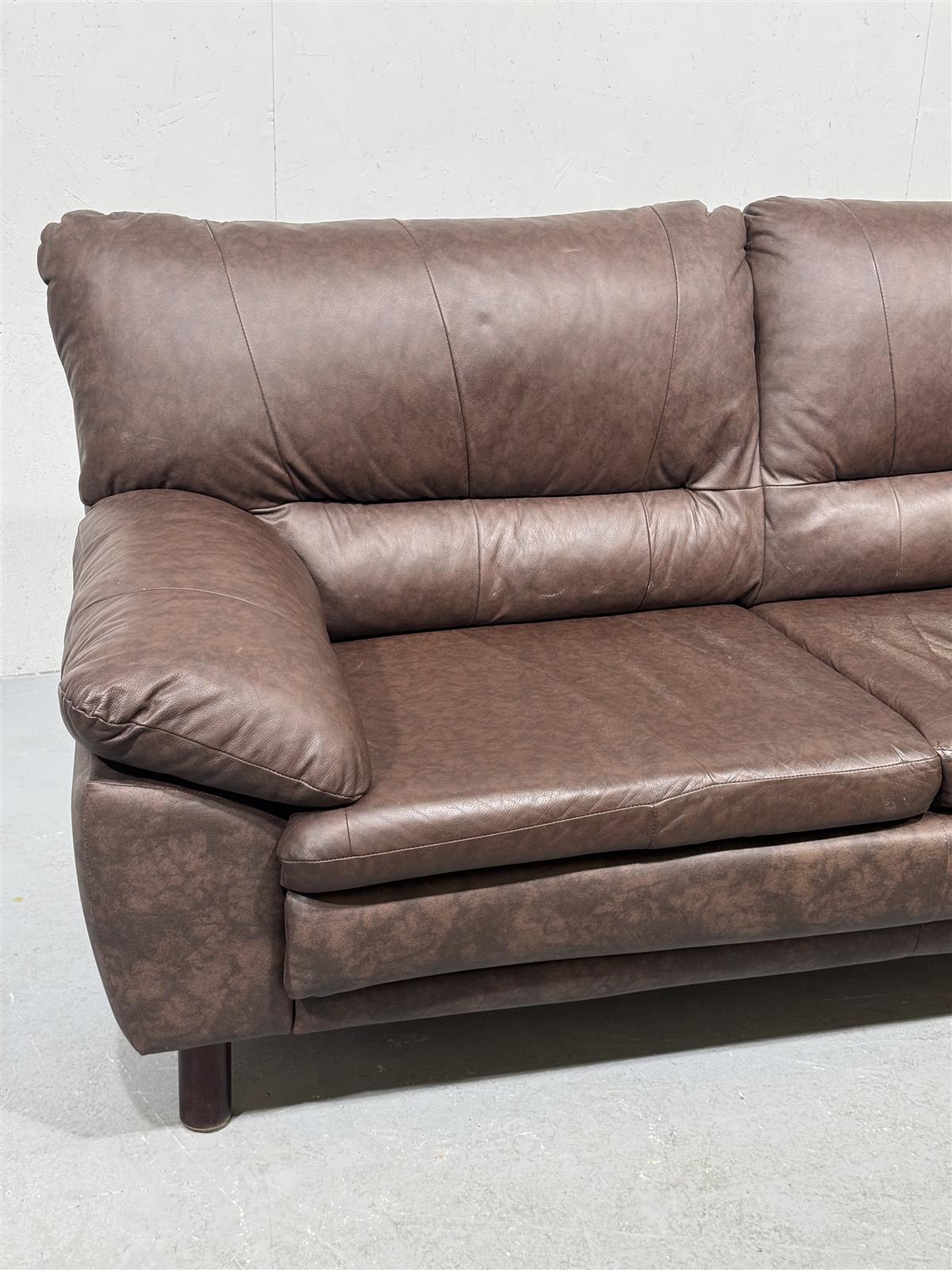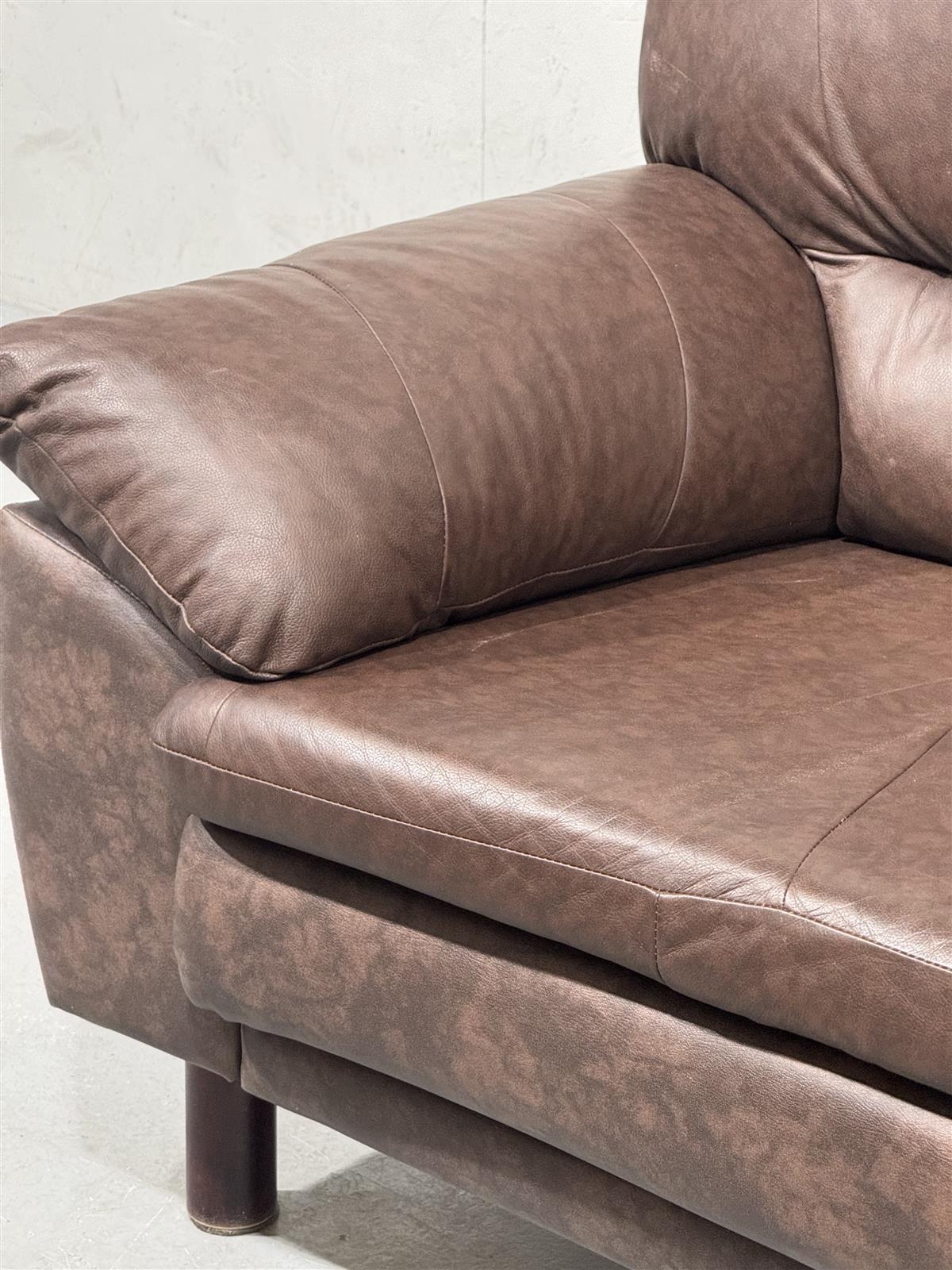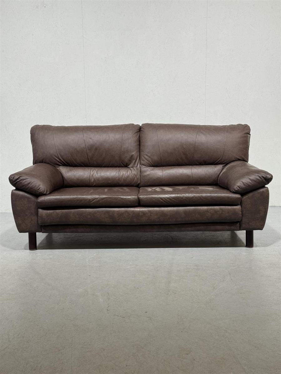 Kaksipaikkainen ruskea nahkasohva, jossa on pehmeät tyynyt ja tukevat käsinojat. Valmistajaa ei ole vahvistettu.