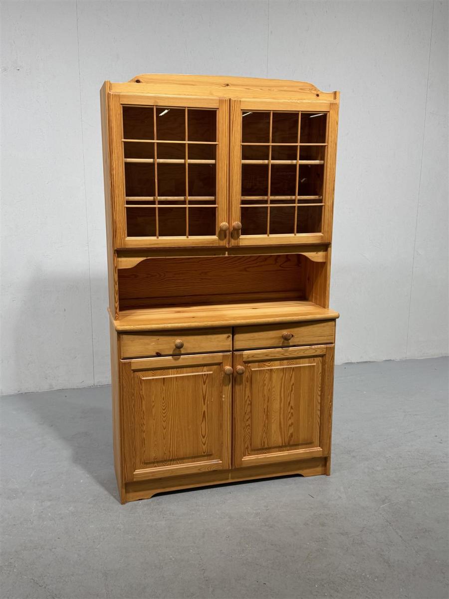 Kaksiosainen astiakaappi, jossa on lasiovet yläosassa ja umpiovet alaosassa. Kaapissa on myös vetolaatikot ja hyllyt sisäpuolella.