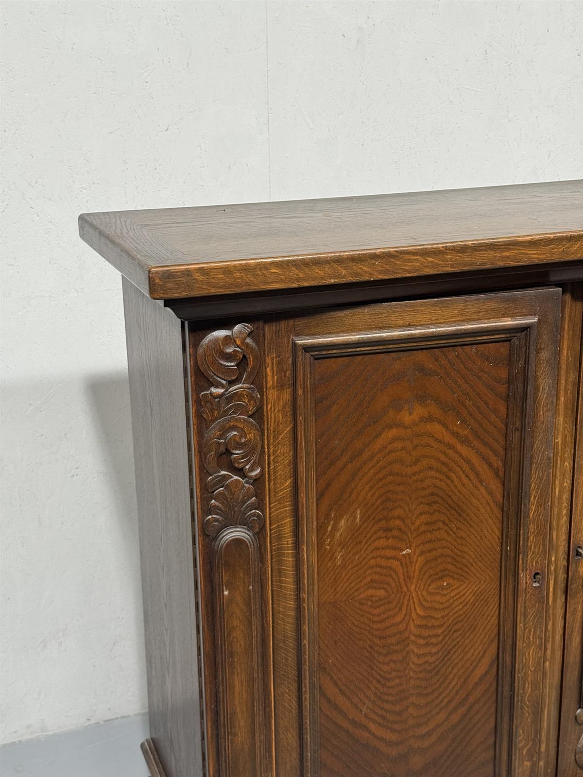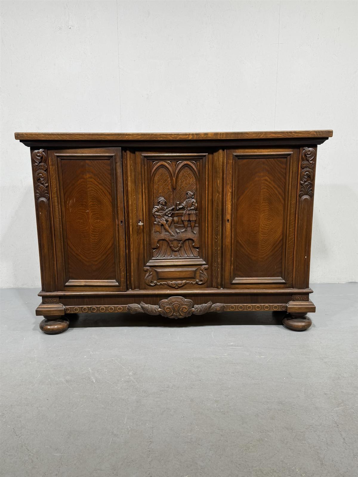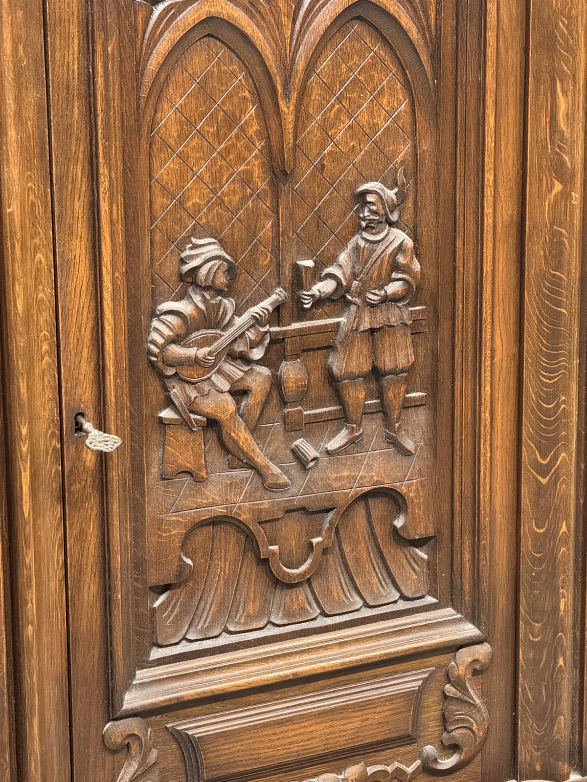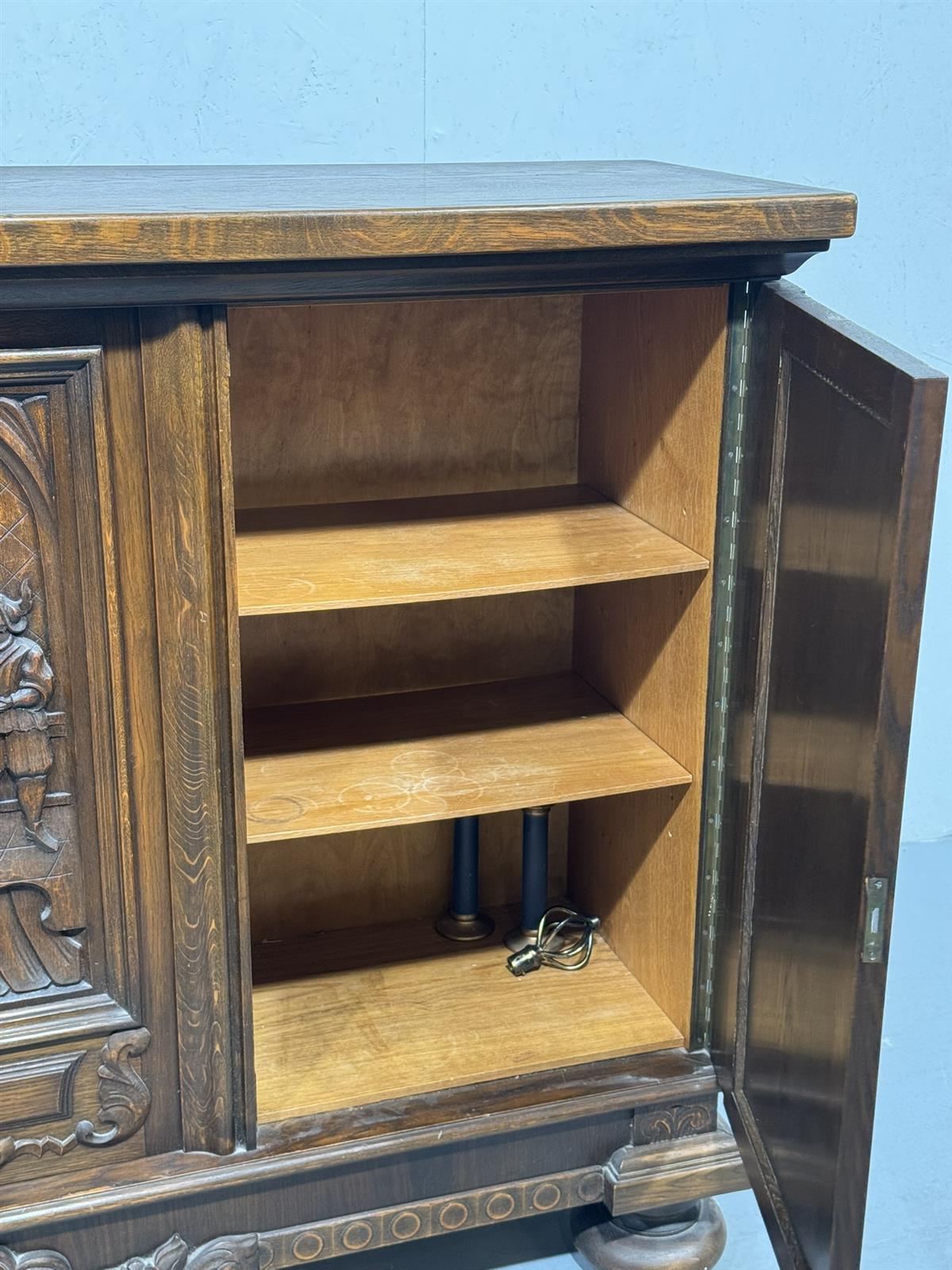 Kaapissa on koristeelliset kaiverrukset ja kolme ovea. Keskimmäisessä ovessa on kuvioitu paneeli, jossa on kaksi hahmoa. Sisällä on useita hyllyjä ja lokeroita.