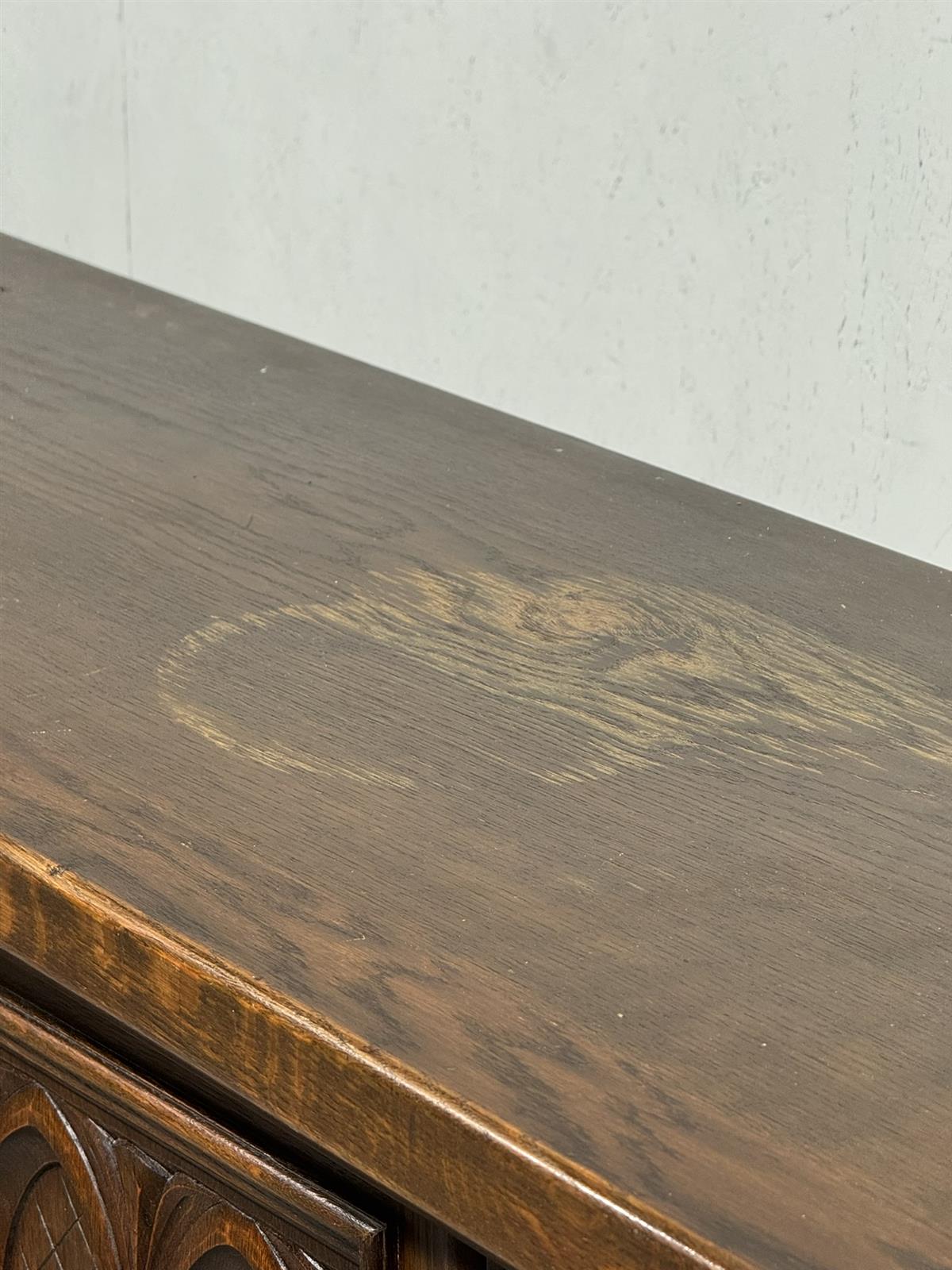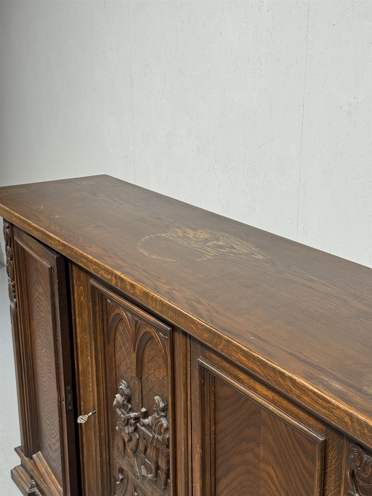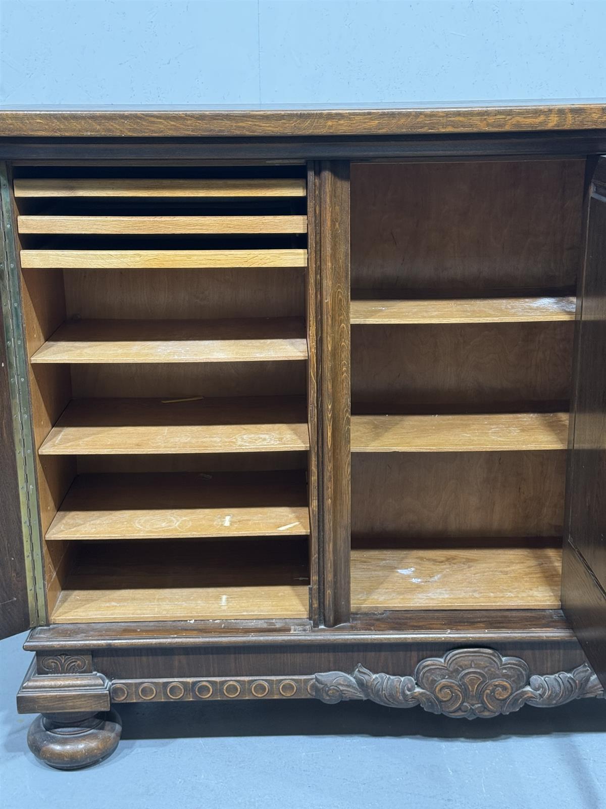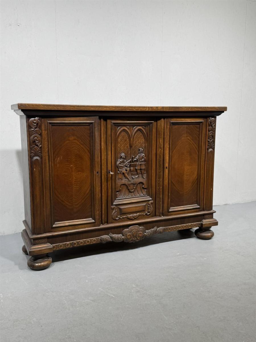 Kaapissa on koristeelliset kaiverrukset ja kolme ovea. Keskimmäisessä ovessa on kuvioitu paneeli, jossa on kaksi hahmoa. Sisällä on useita hyllyjä ja lokeroita.