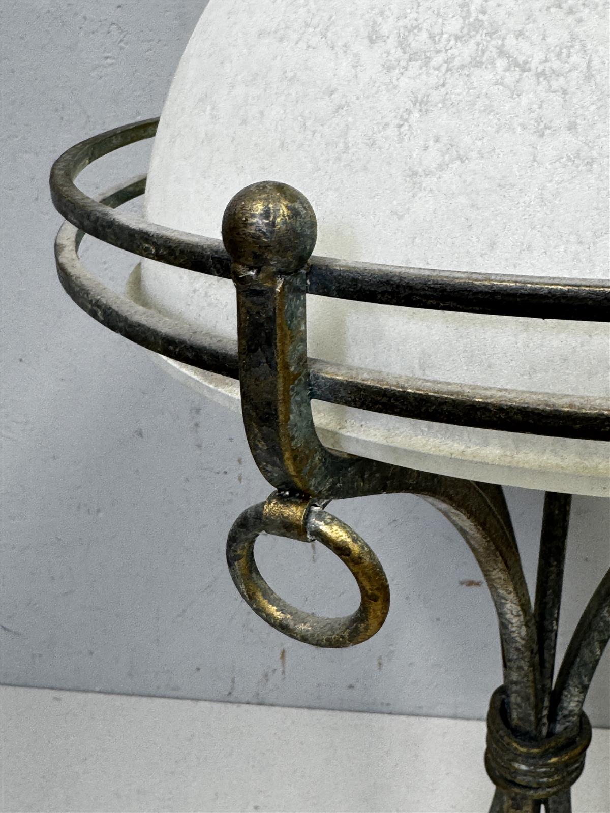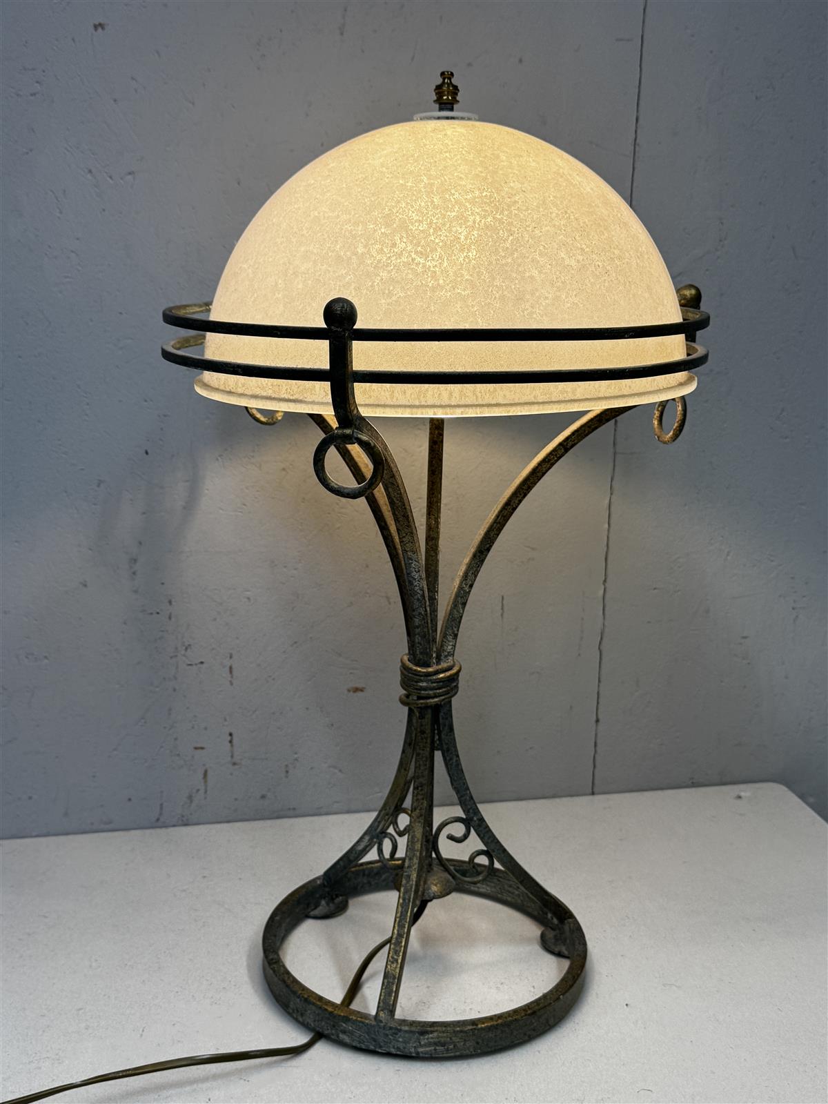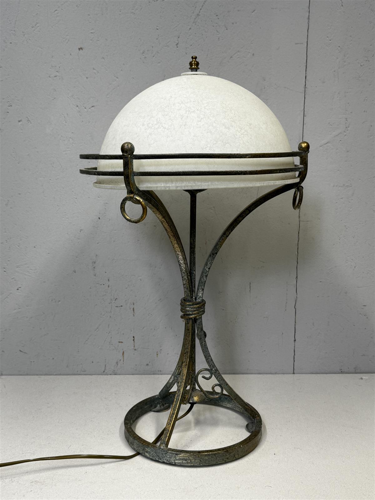 Rustiikki henkinen Pöytävalaisin, jossa on valkoinen kupu ja metallinen jalka. Valaisimessa on koristeellisia yksityiskohtia ja se toimii hyvin.