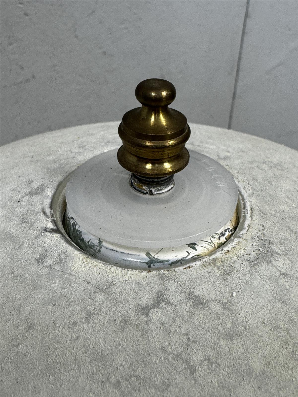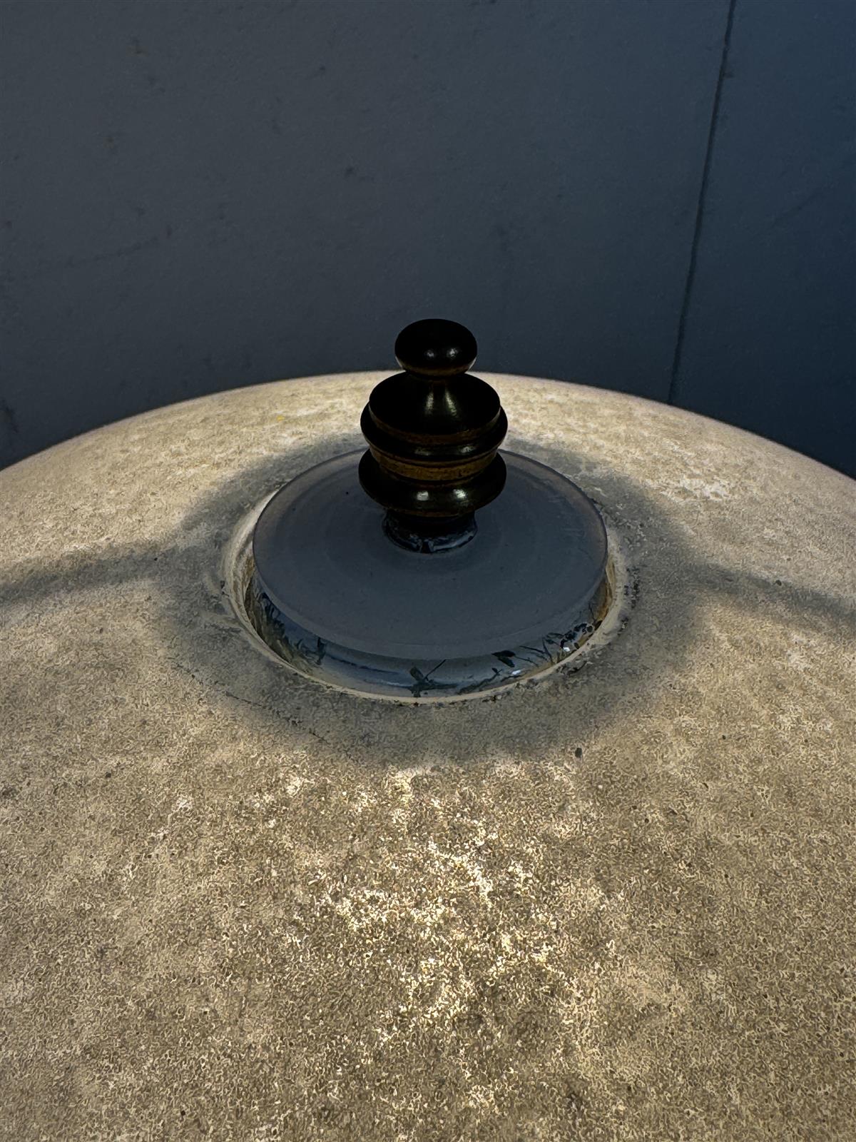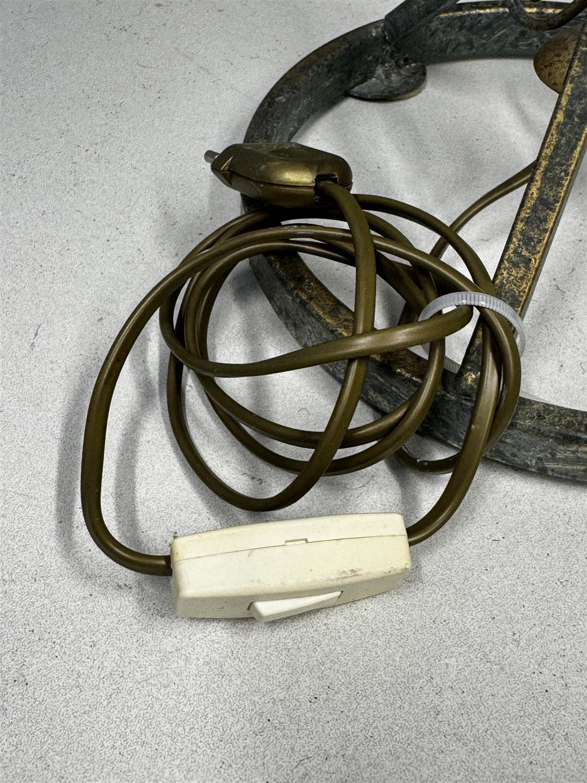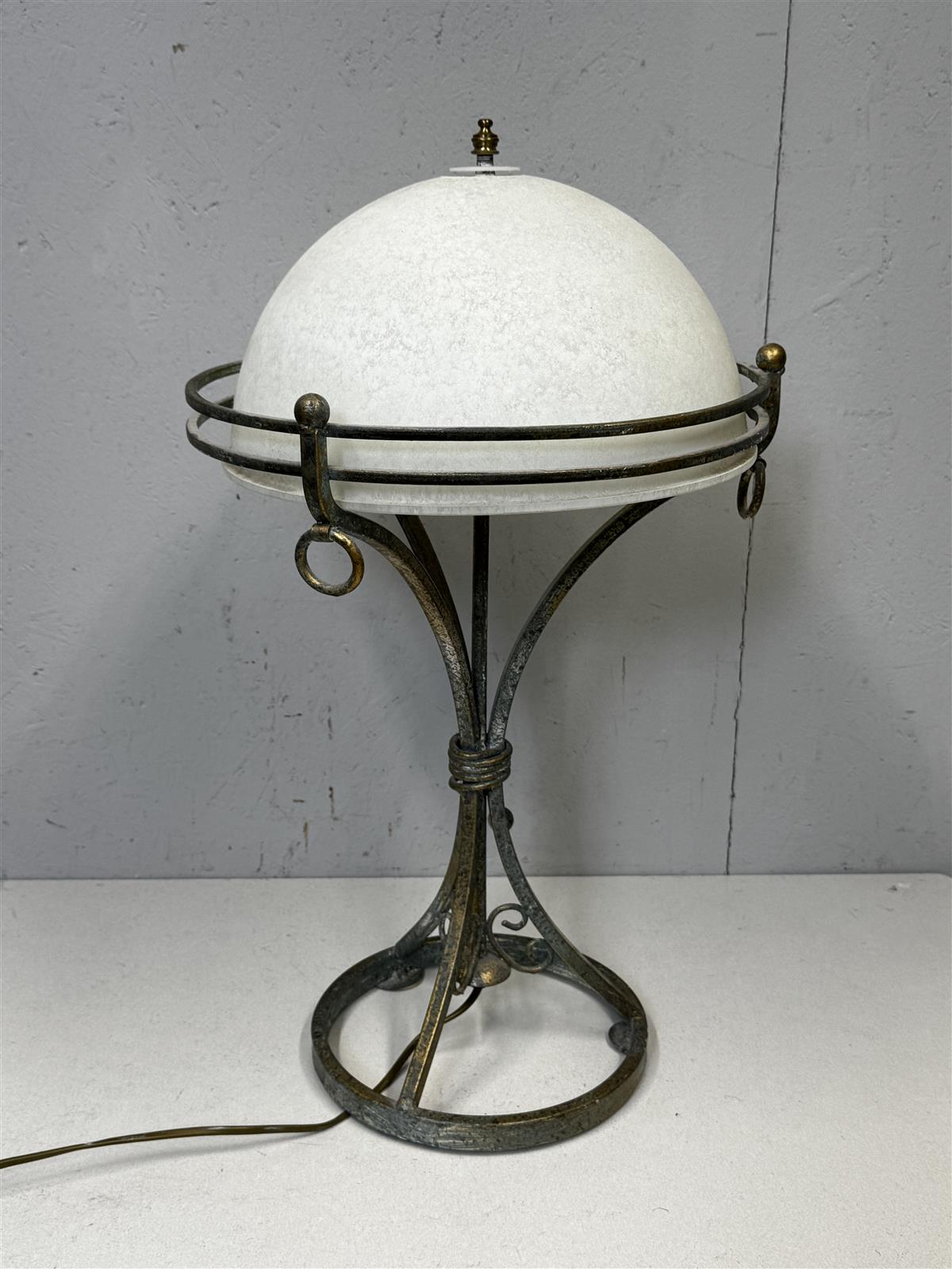 Rustiikki henkinen Pöytävalaisin, jossa on valkoinen kupu ja metallinen jalka. Valaisimessa on koristeellisia yksityiskohtia ja se toimii hyvin.