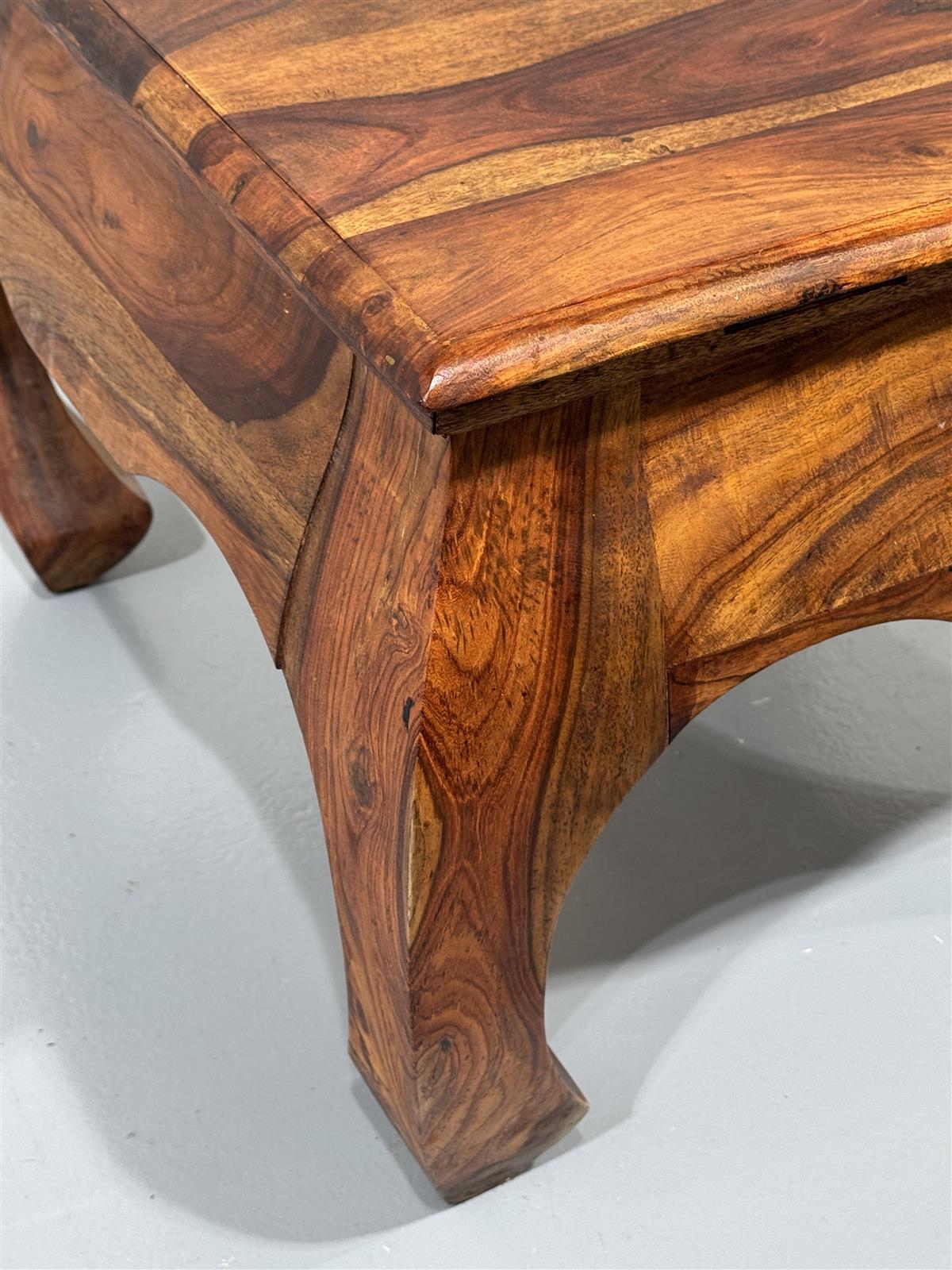 Rustiikkinen sohvapöytä, jossa on kauniisti kaartuvat jalat ja avattava kansi. Massiivipuuta, kannen alla säilytystila. Pöydän sisällä on säilytystilaa, joka tekee siitä käytännöllisen valinnan moneen tilaan.