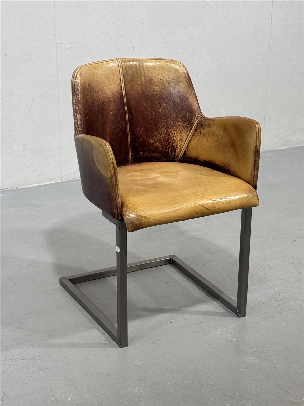 Tämä moderni nahkainen nojatuoli huokuu menneiden aikojen charmia, tyyliltään patinoitunut pinta sopii myös industrial sisustukseen. Metallijalat tuovat modernia kontrastia, tehden siitä täydellisen lisän niin vintage-henkiseen kuin moderniinkin sisustukseen.